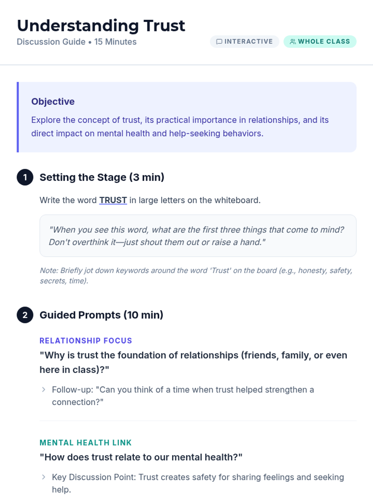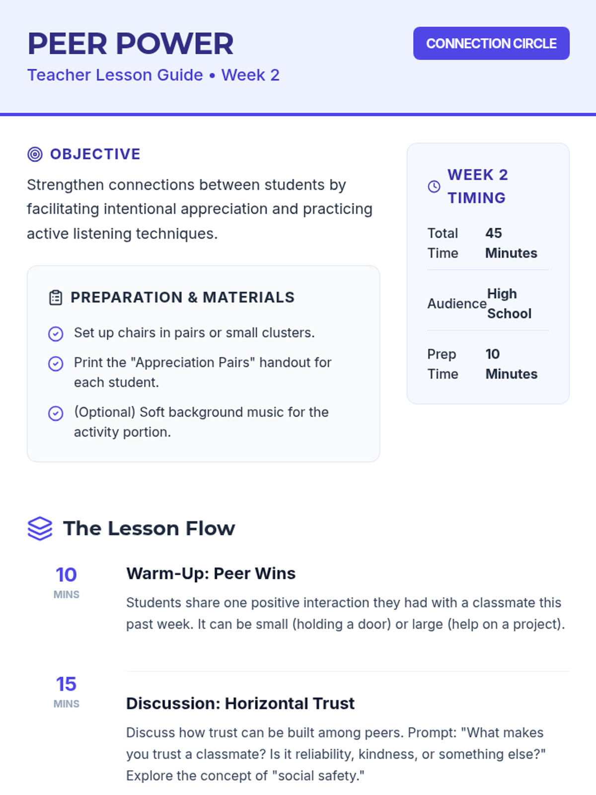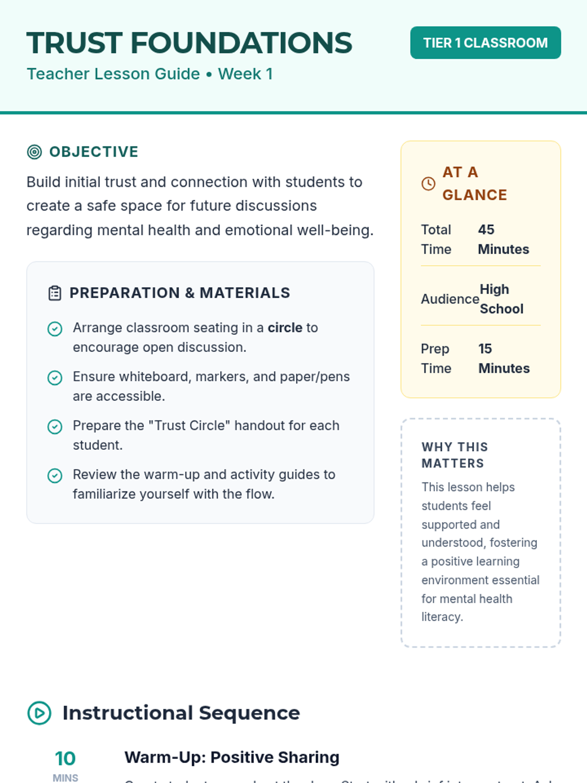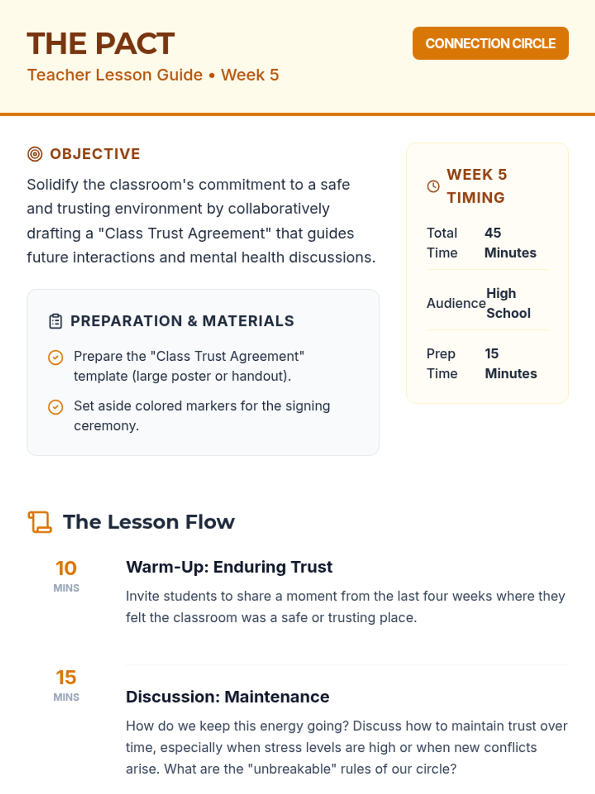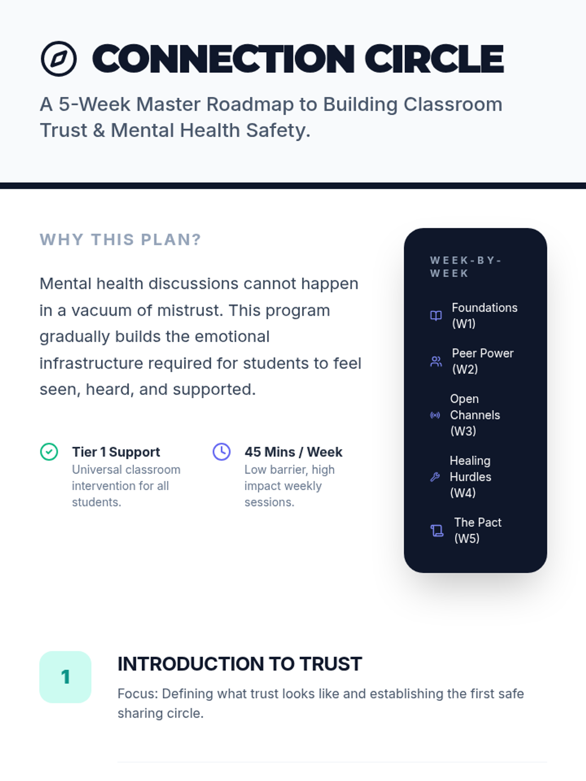 A comprehensive five-week program for high school classrooms to establish mutual trust, foster deep peer connections, and create a safe environment for mental health discussions.