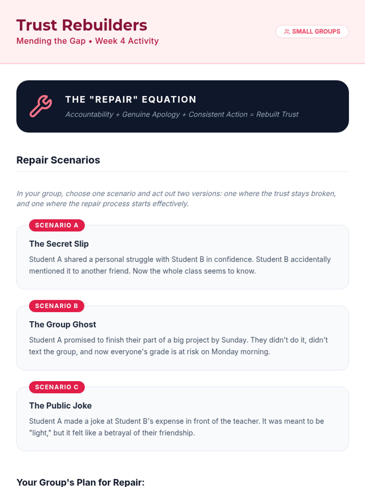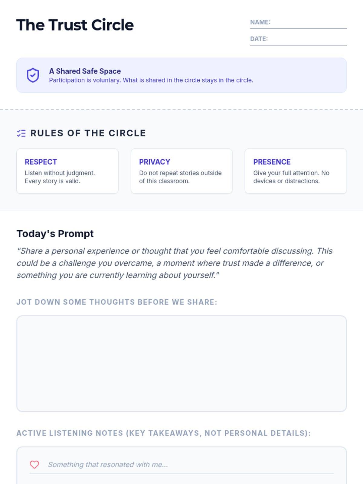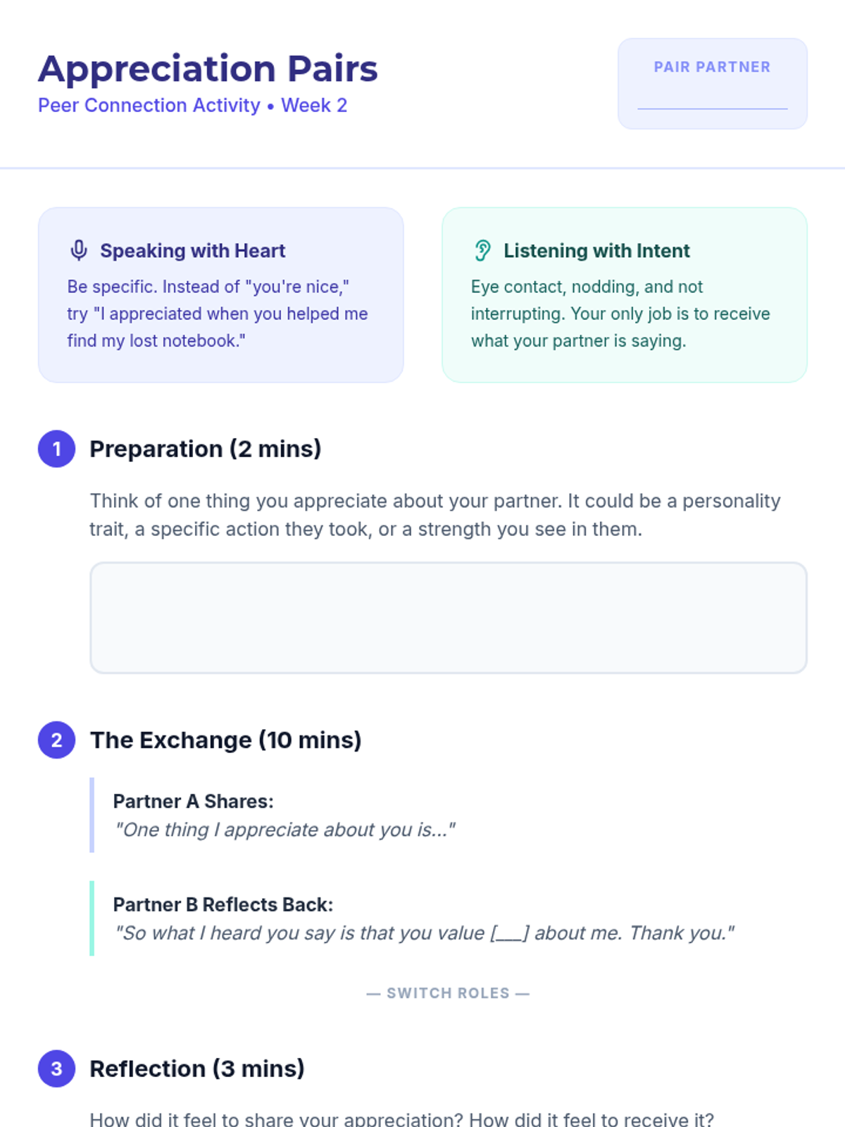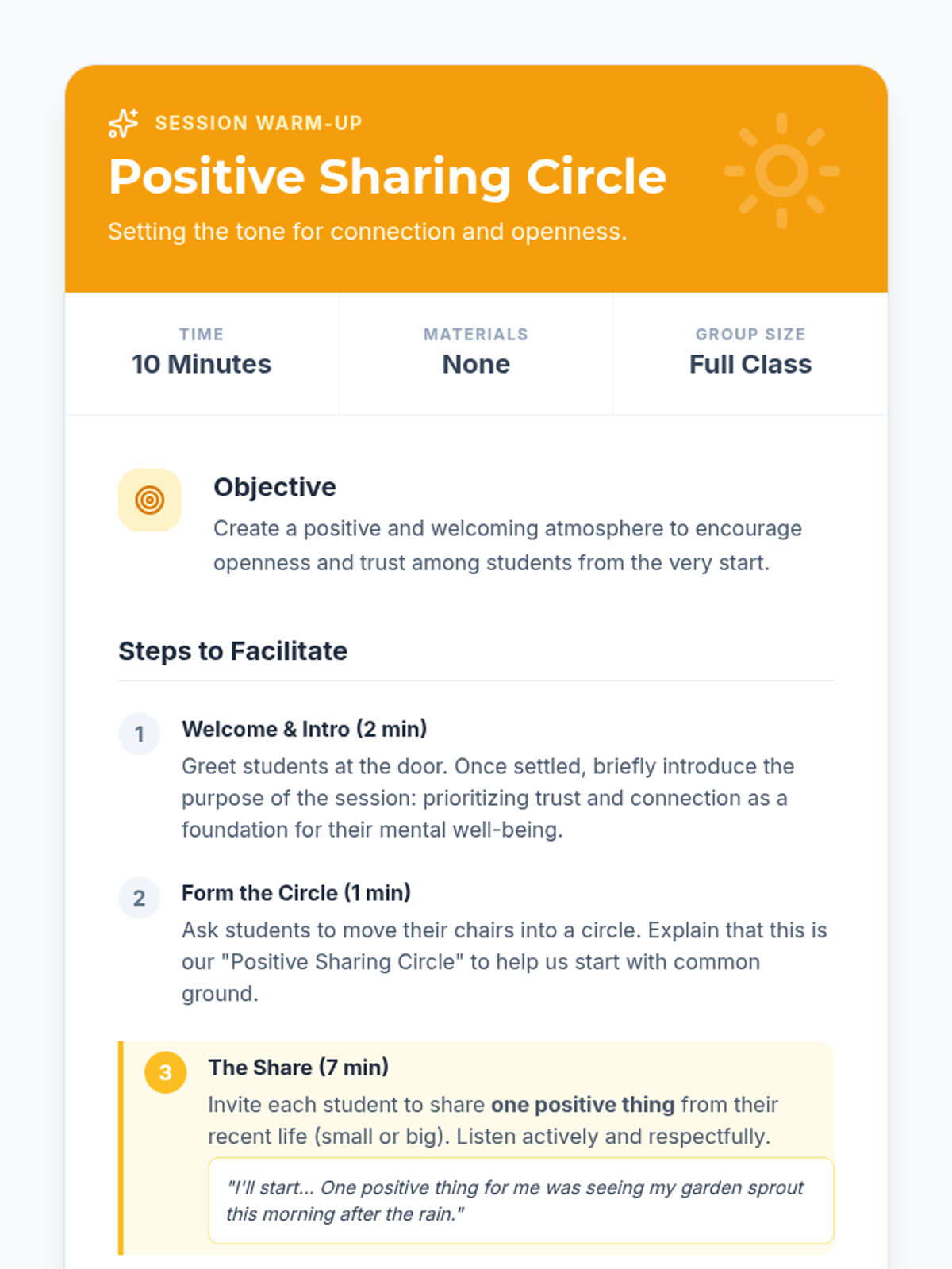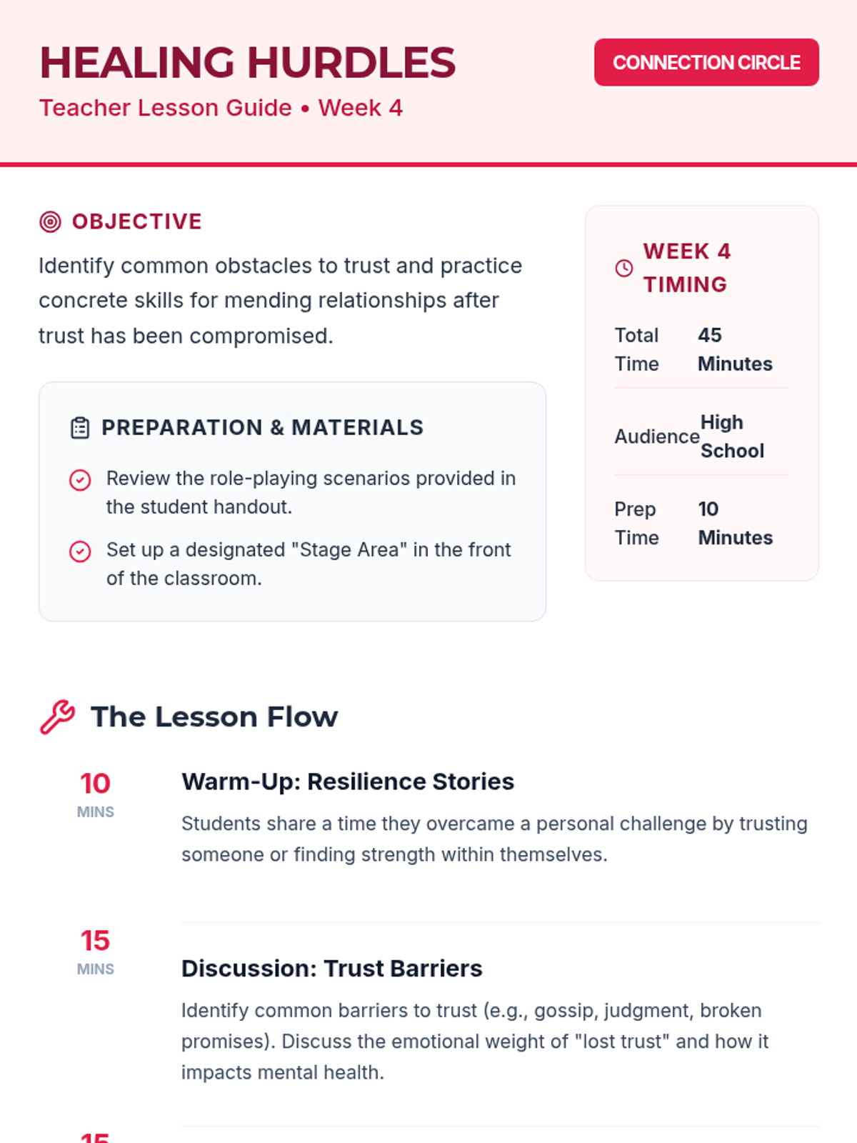 A comprehensive five-week program for high school classrooms to establish mutual trust, foster deep peer connections, and create a safe environment for mental health discussions.