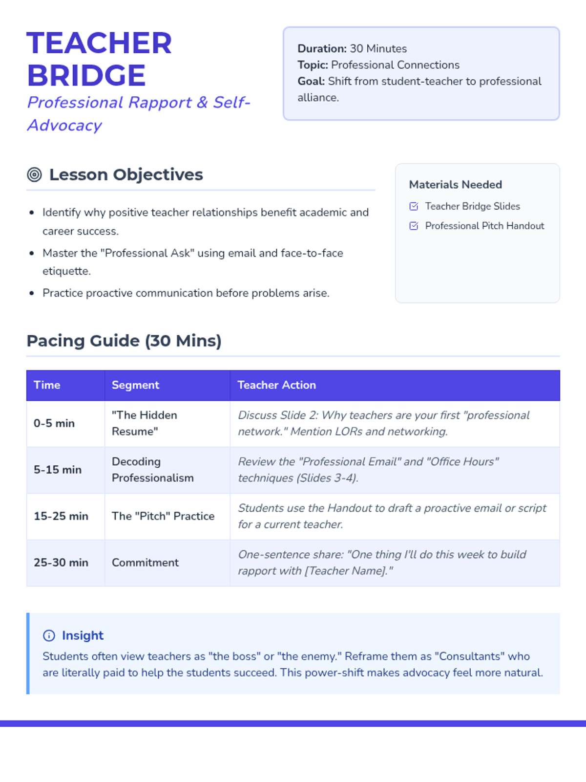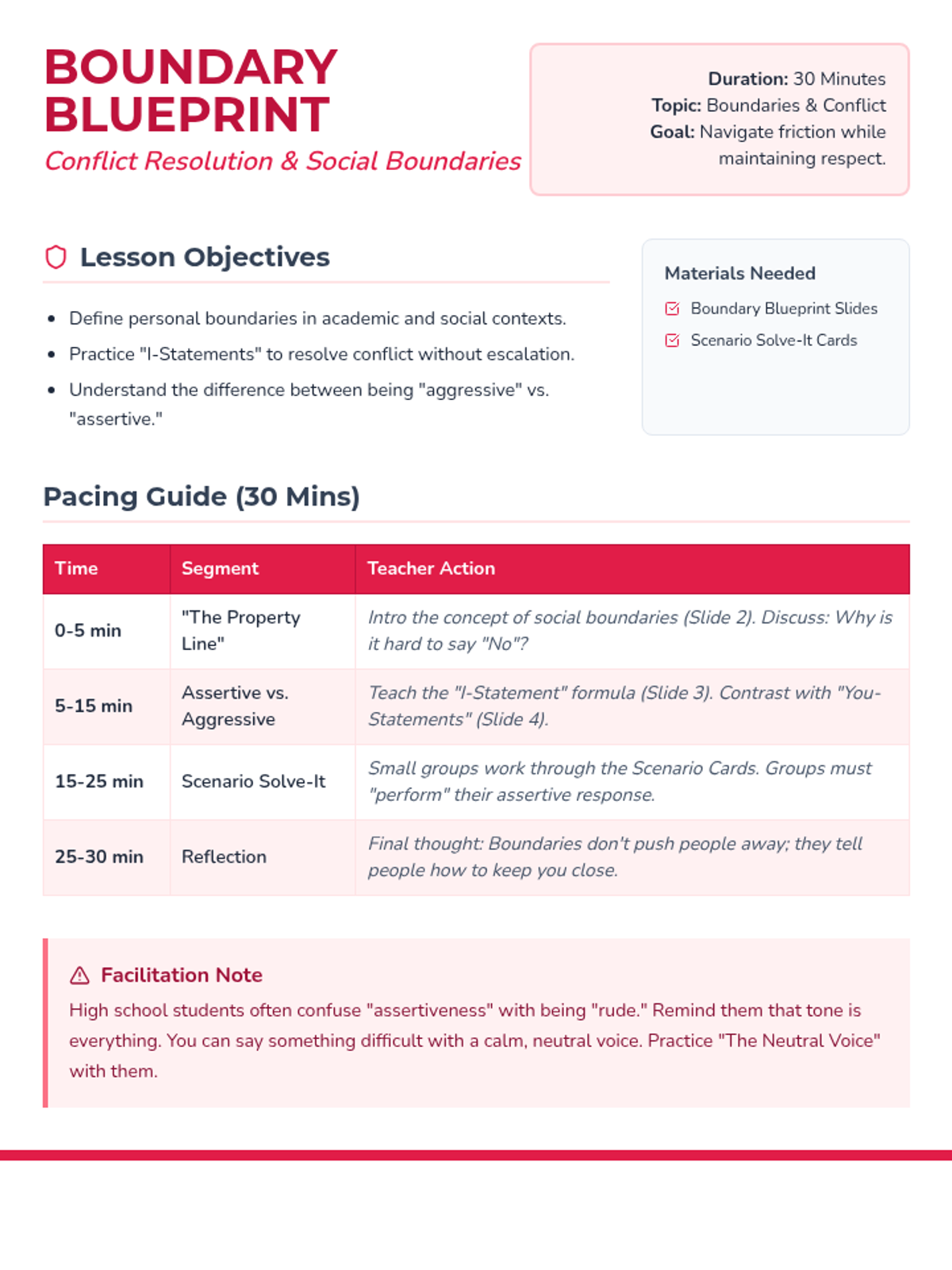 An advanced five-part professional development series for 11th graders focusing on the psychology of conflict, high-stakes communication, and strategic diplomacy. Students prepare for adult environments by mastering emotional intelligence, interest-based negotiation, and professional digital protocols.