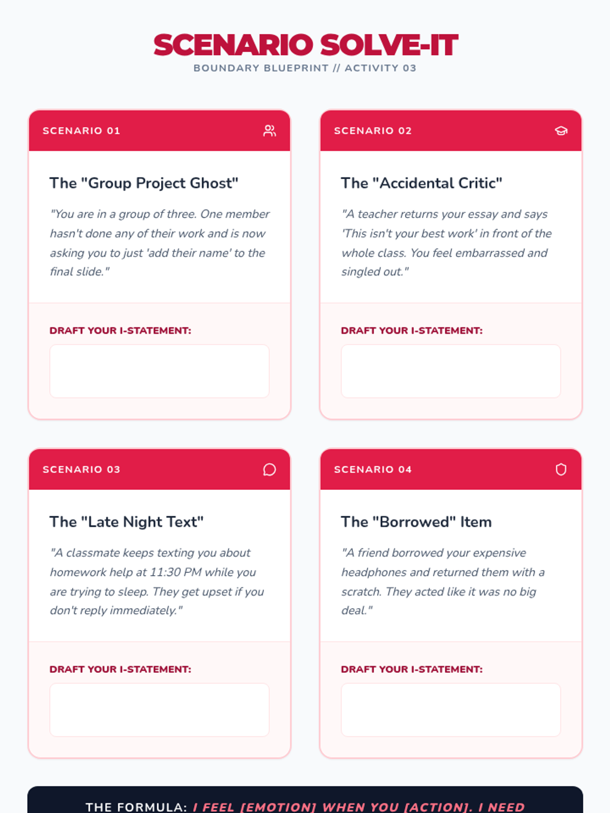 A series of 30-minute workshops designed for high schoolers to develop authentic relationships with peers and professional connections with teachers through active listening, self-advocacy, and boundary setting.