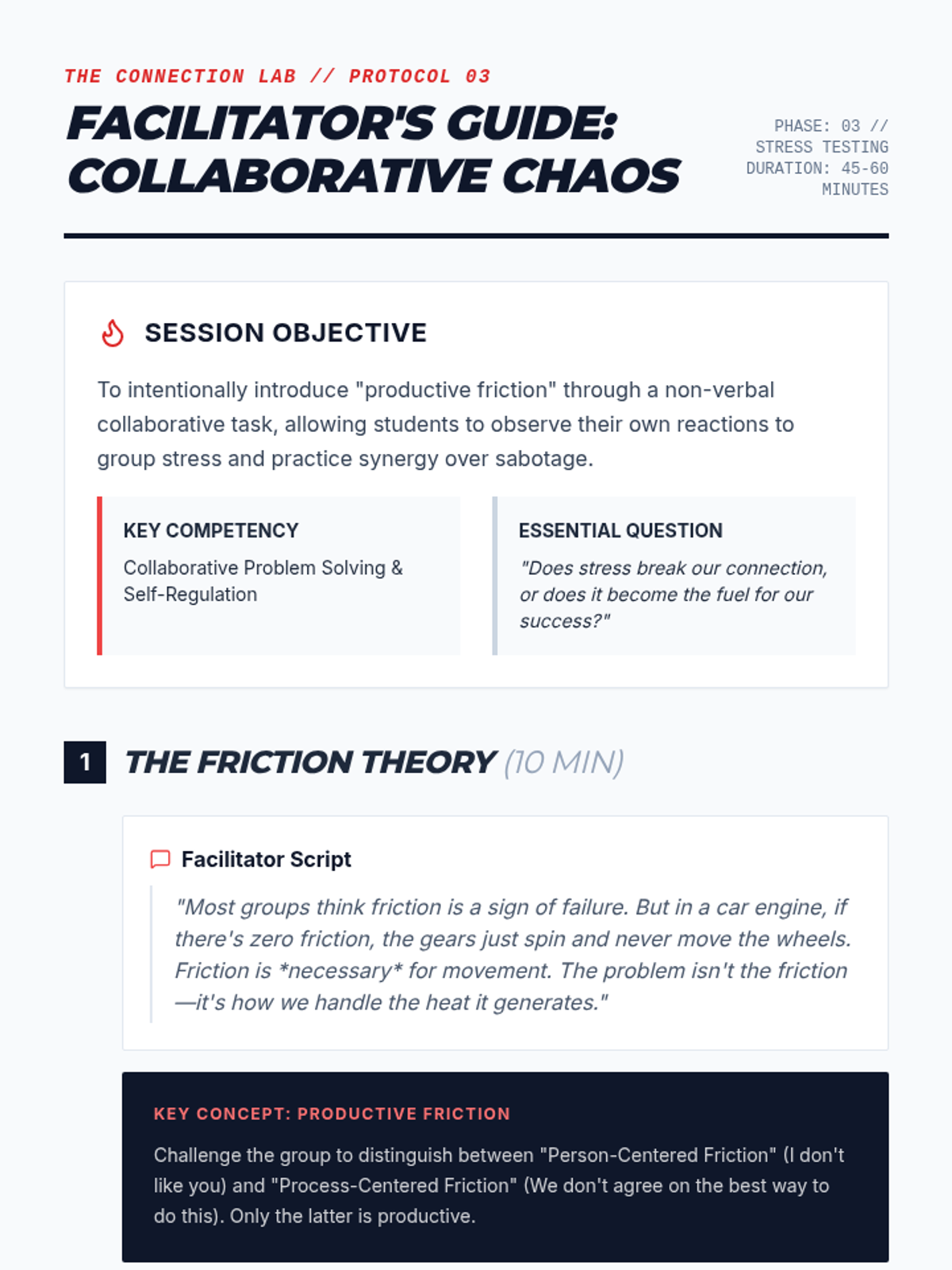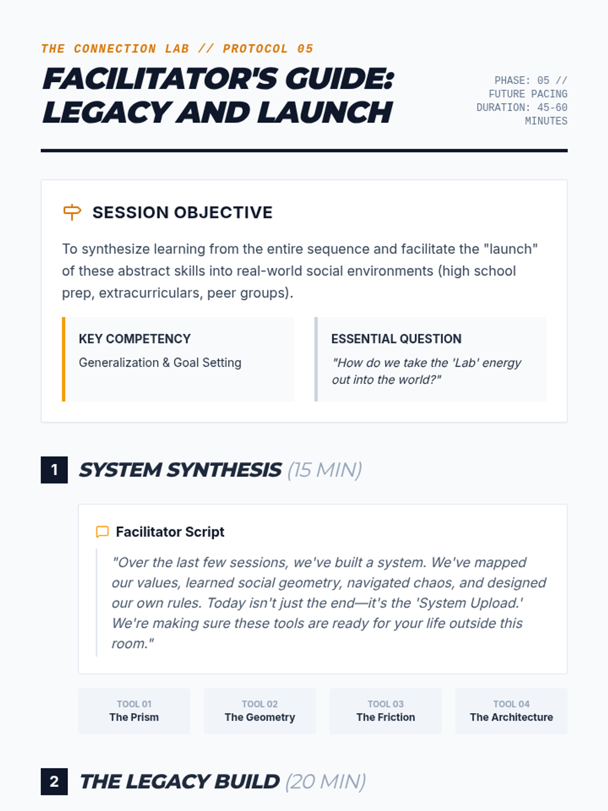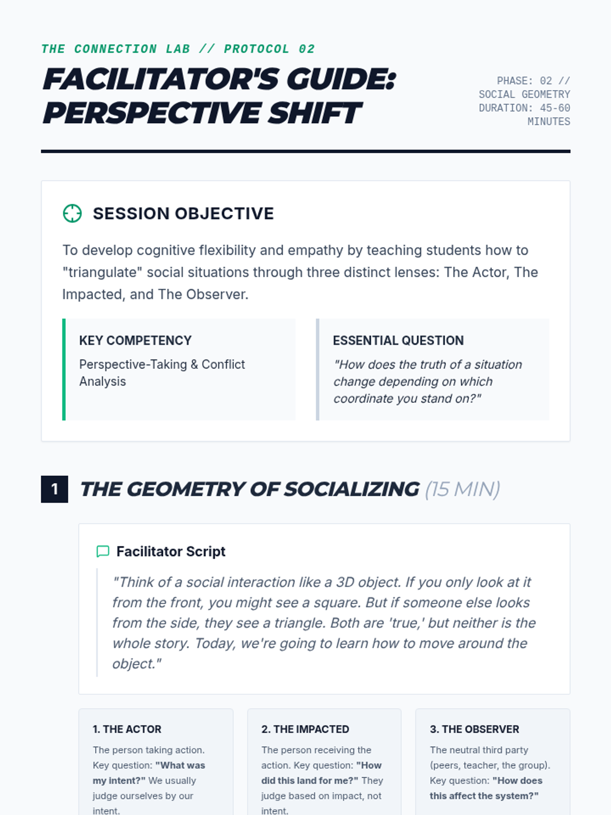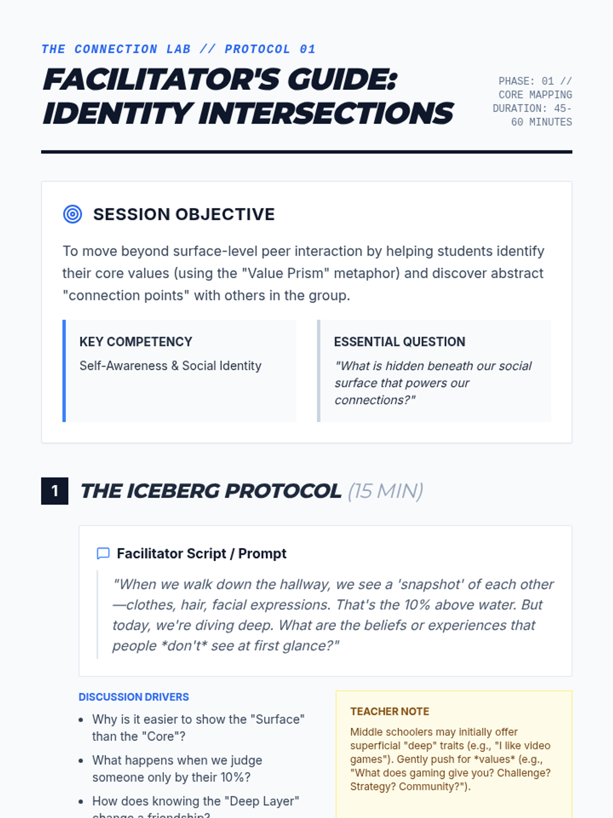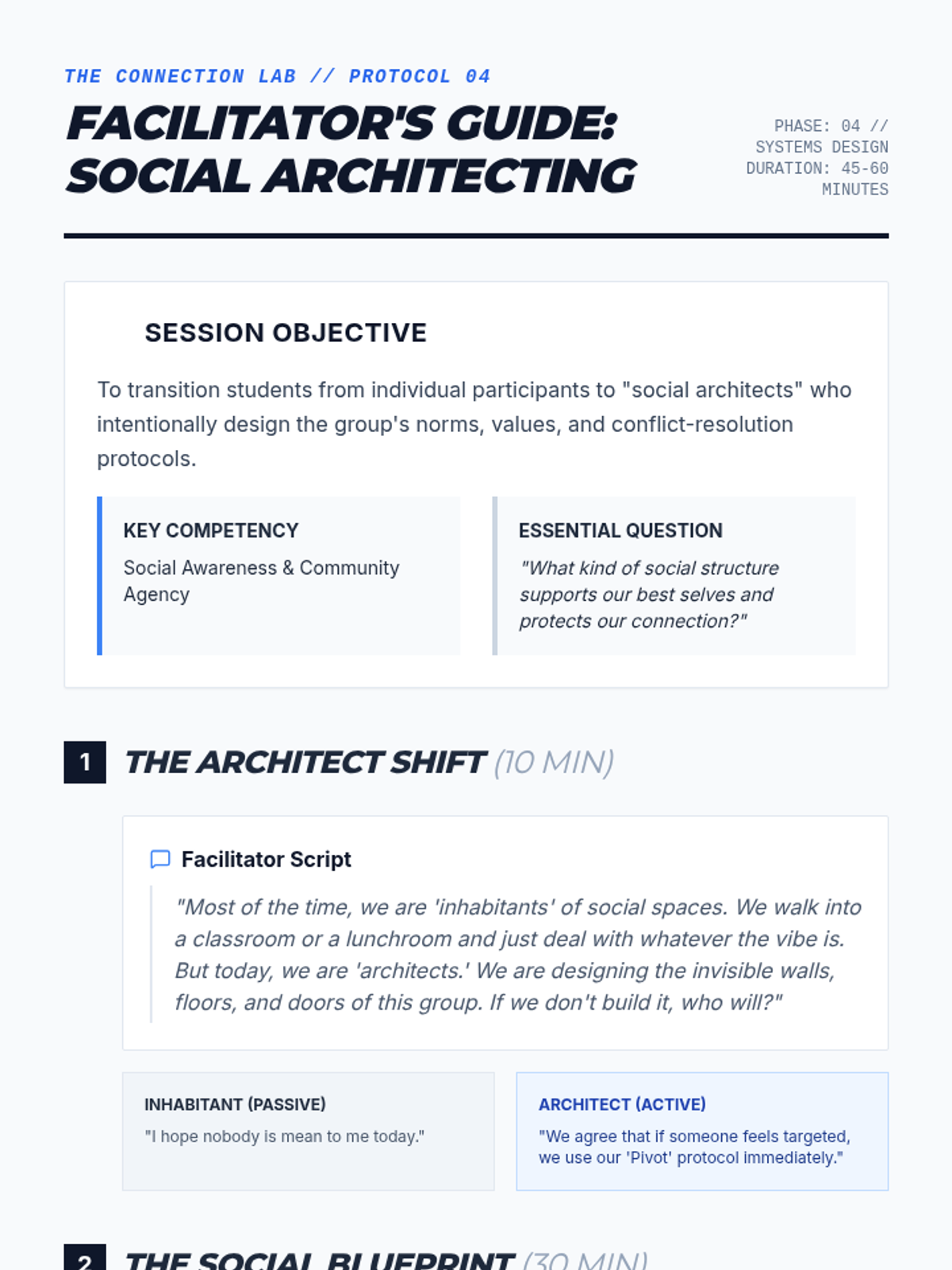 A five-part Tier 2 small group sequence for middle school students that explores social dynamics, empathy, and identity through complex problem-solving and abstract reflection. Students move from self-identity to community-building using systems thinking and perspective-taking.