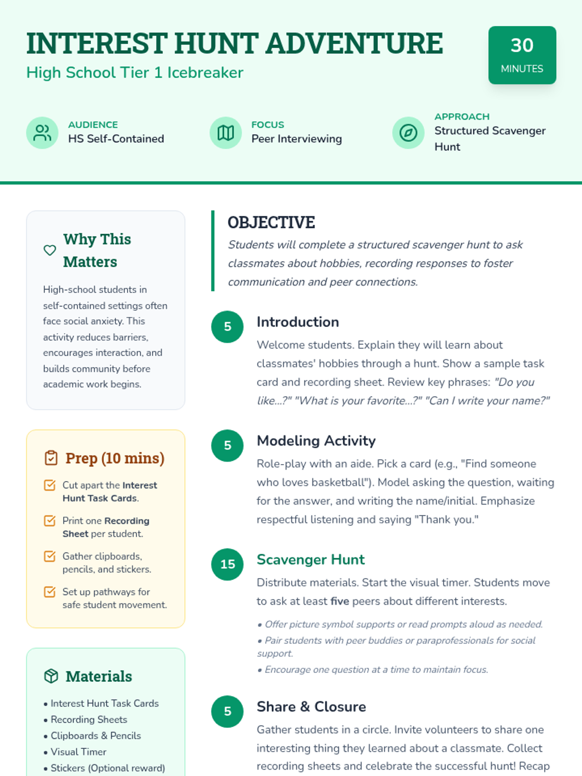 A pair of engaging icebreaker activities designed for students with significant disabilities to foster social connections and reduce anxiety through structured interaction.