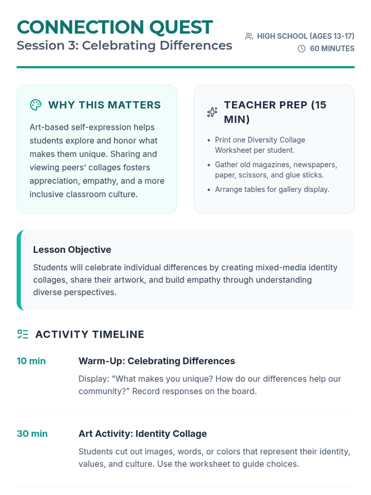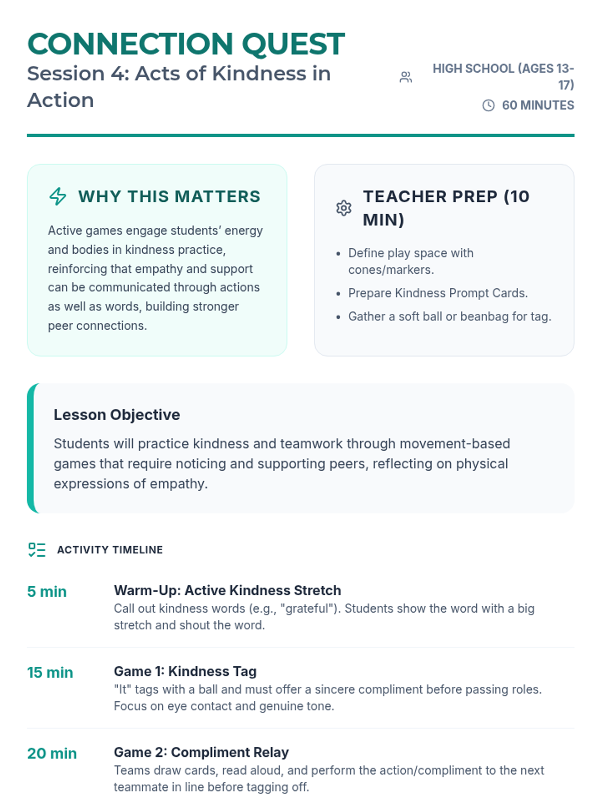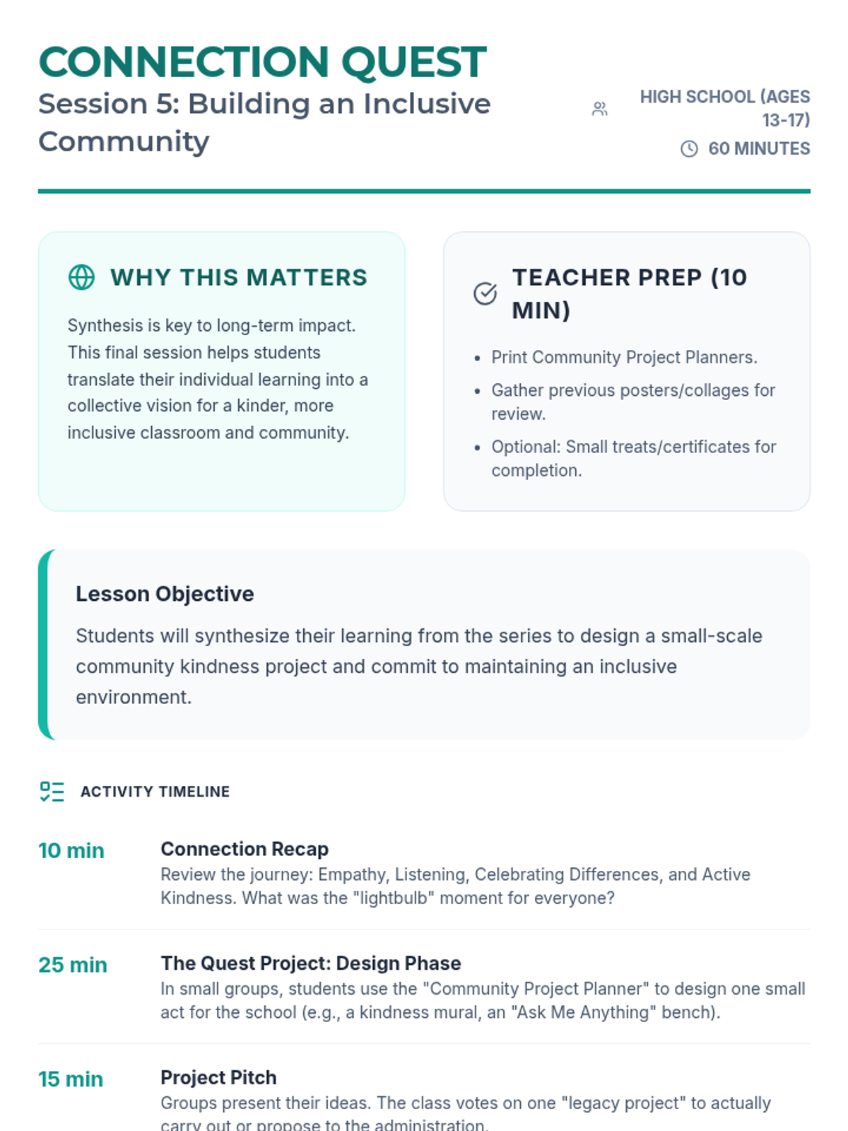 A 5-session social-emotional learning series for teens that explores empathy, active listening, diversity, and community building through interactive activities and reflection.