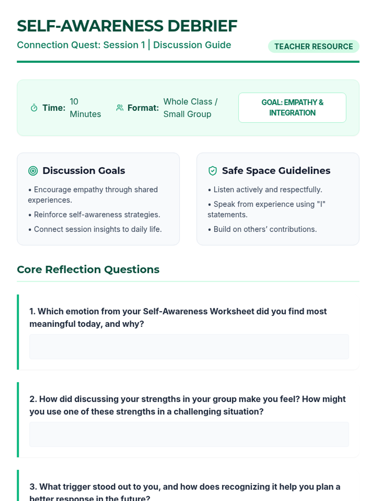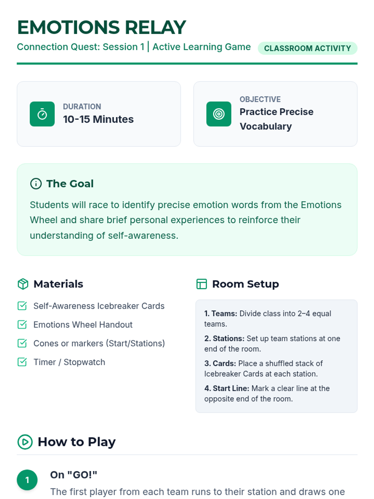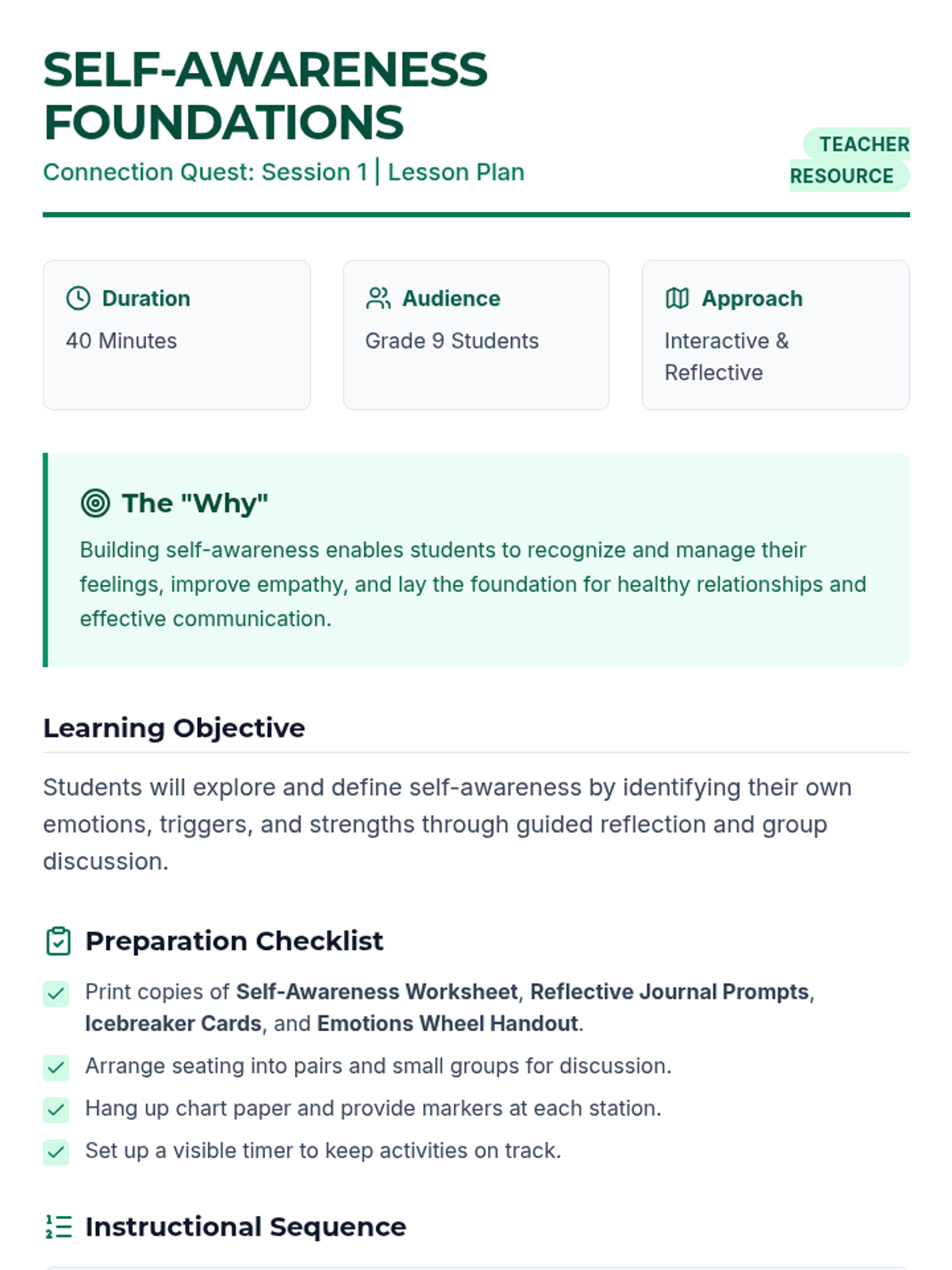 A comprehensive 10-session course designed for Grade 9 students to develop essential relationship skills, including self-awareness, communication, empathy, conflict resolution, and healthy boundaries.