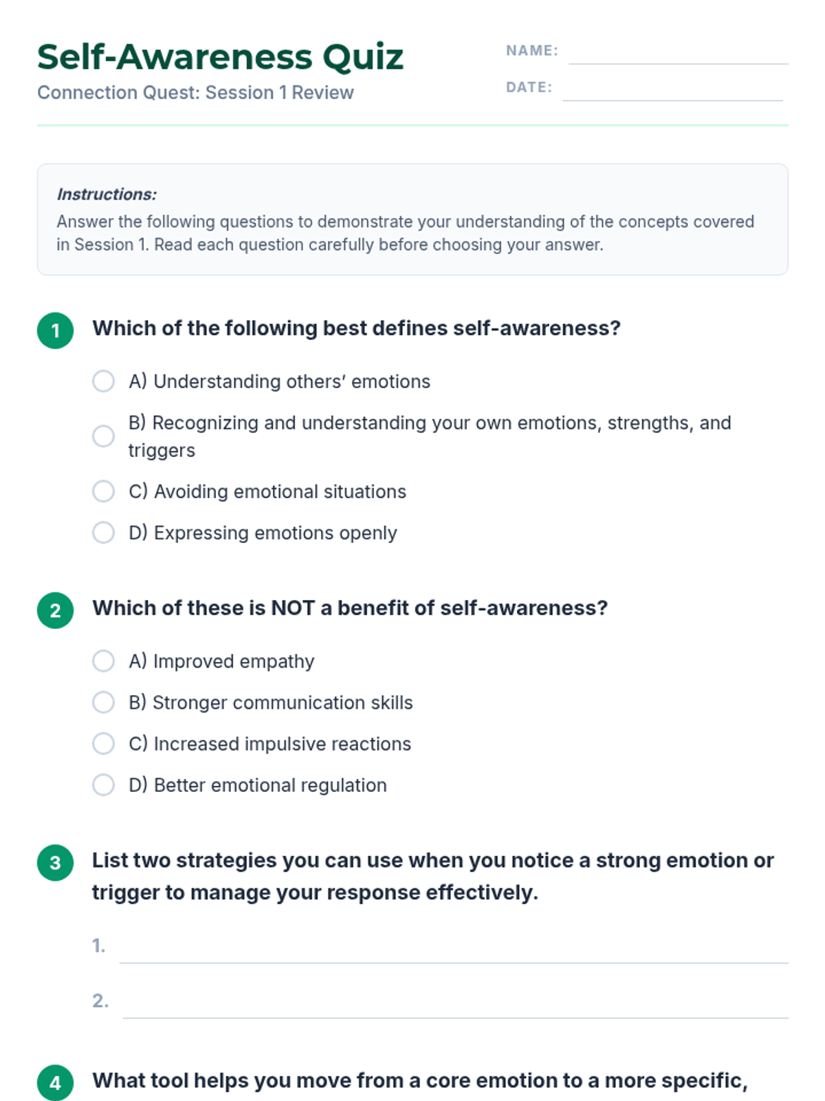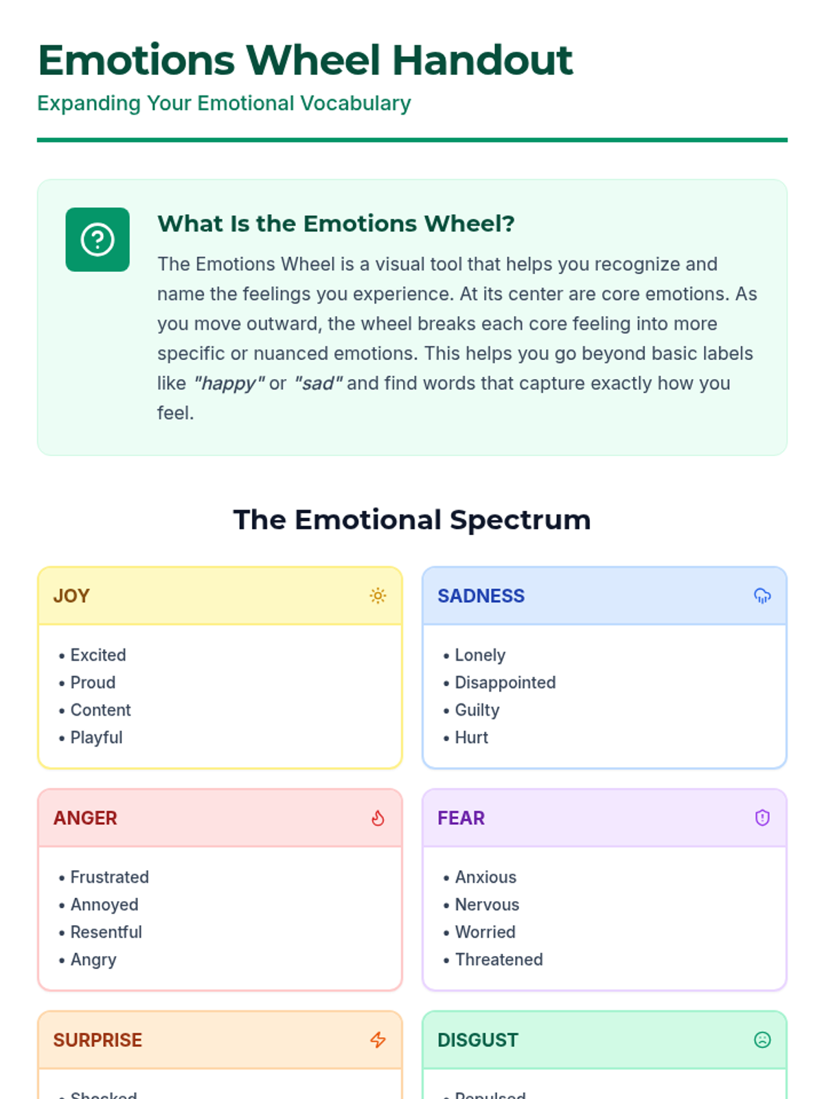 A 4-session small group counseling program for high school girls focused on identifying anxiety triggers, practicing mindfulness, and developing a personalized toolkit of coping strategies. The sequence emphasizes peer support, empowerment, and practical application within the school environment.