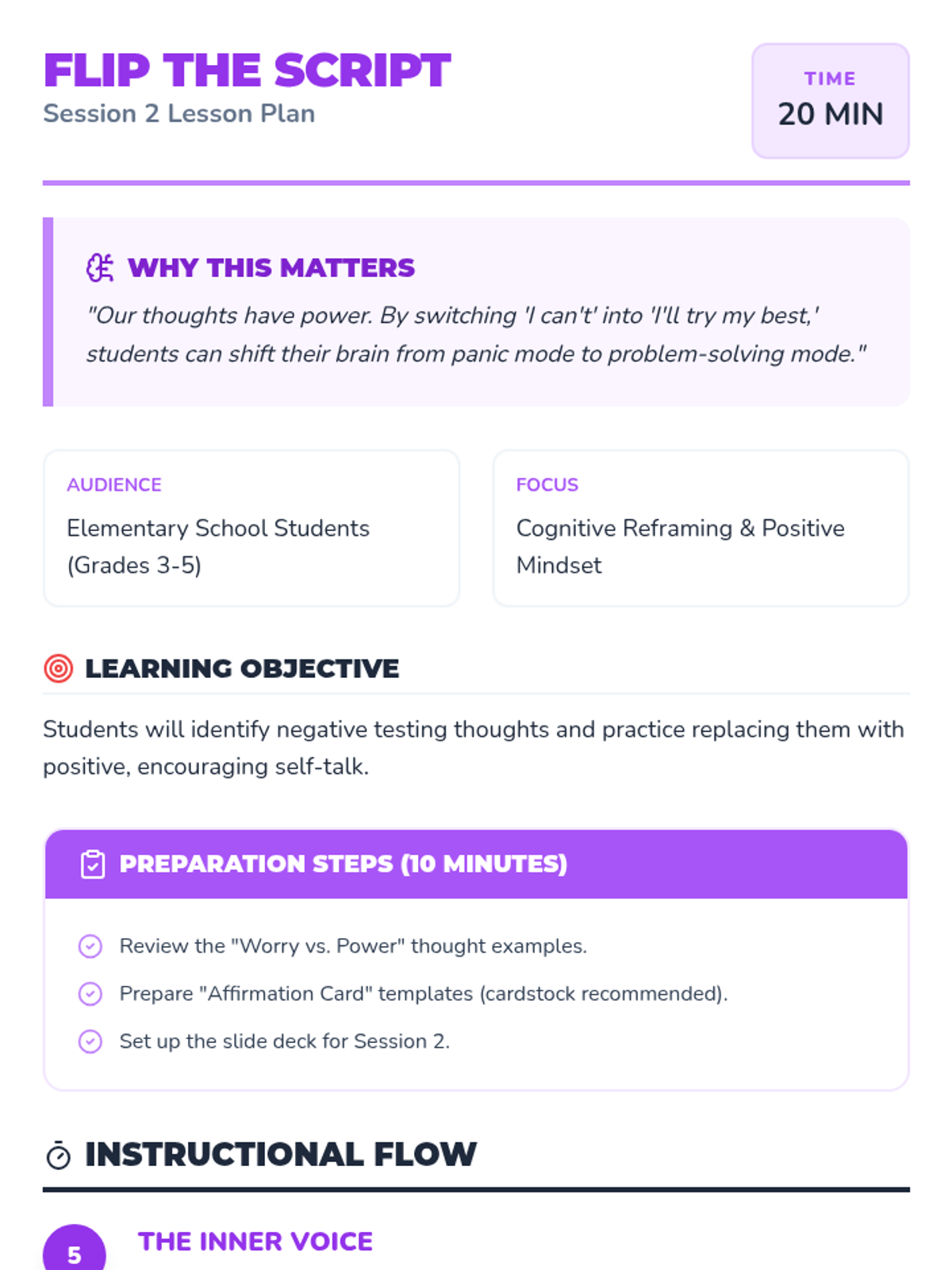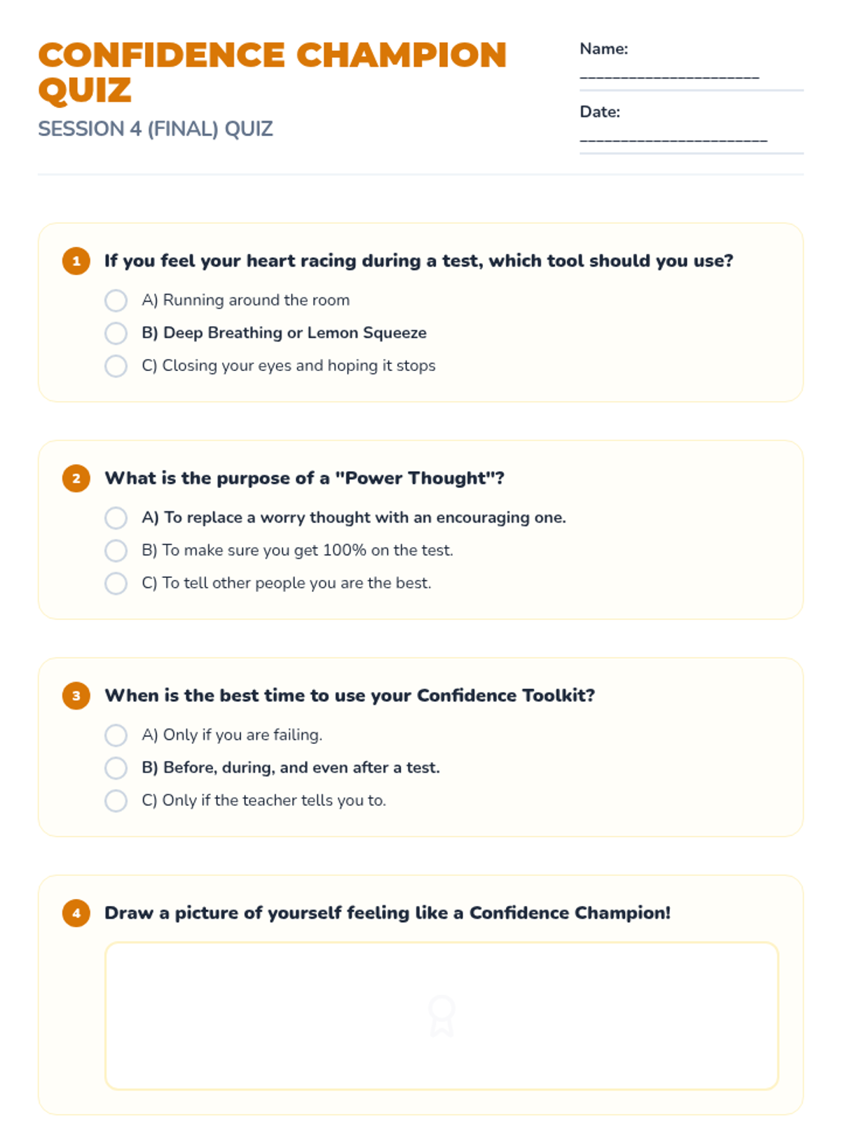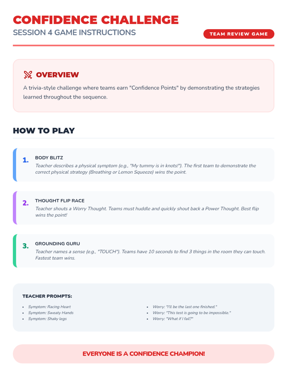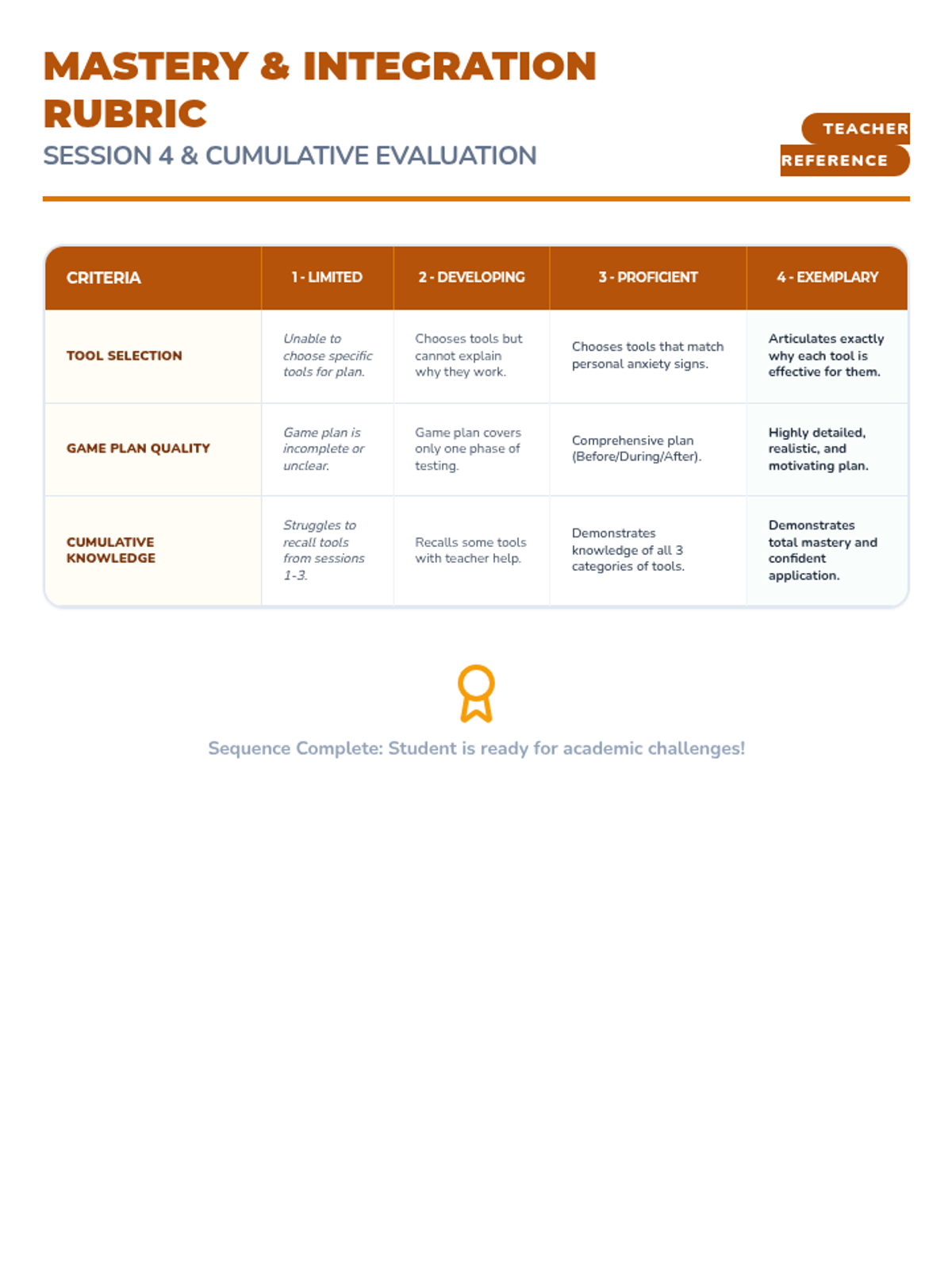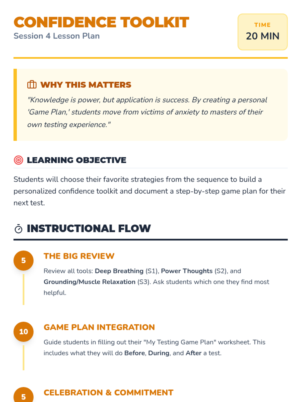 A 4-session sequence for grades 3-5 focused on recognizing signs of test anxiety, developing cognitive and physical coping strategies, and building a personalized confidence toolkit for academic success.
