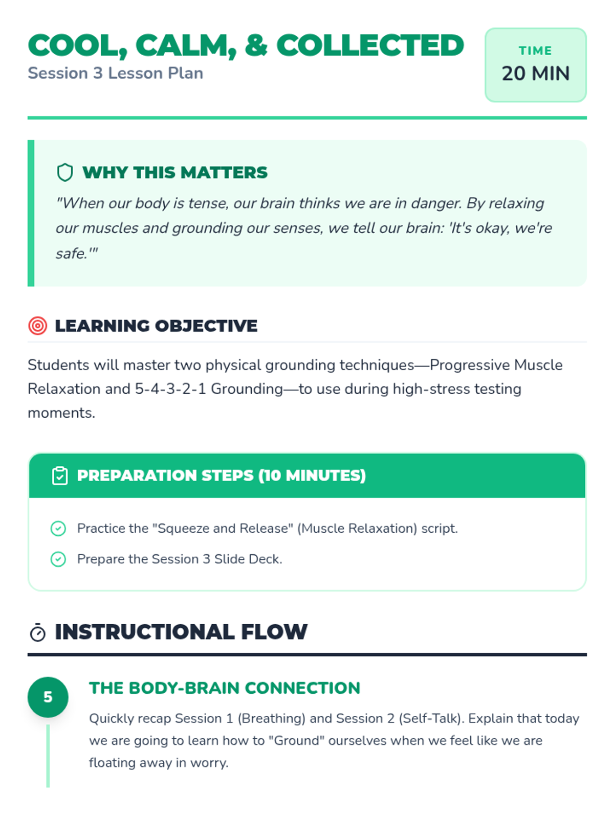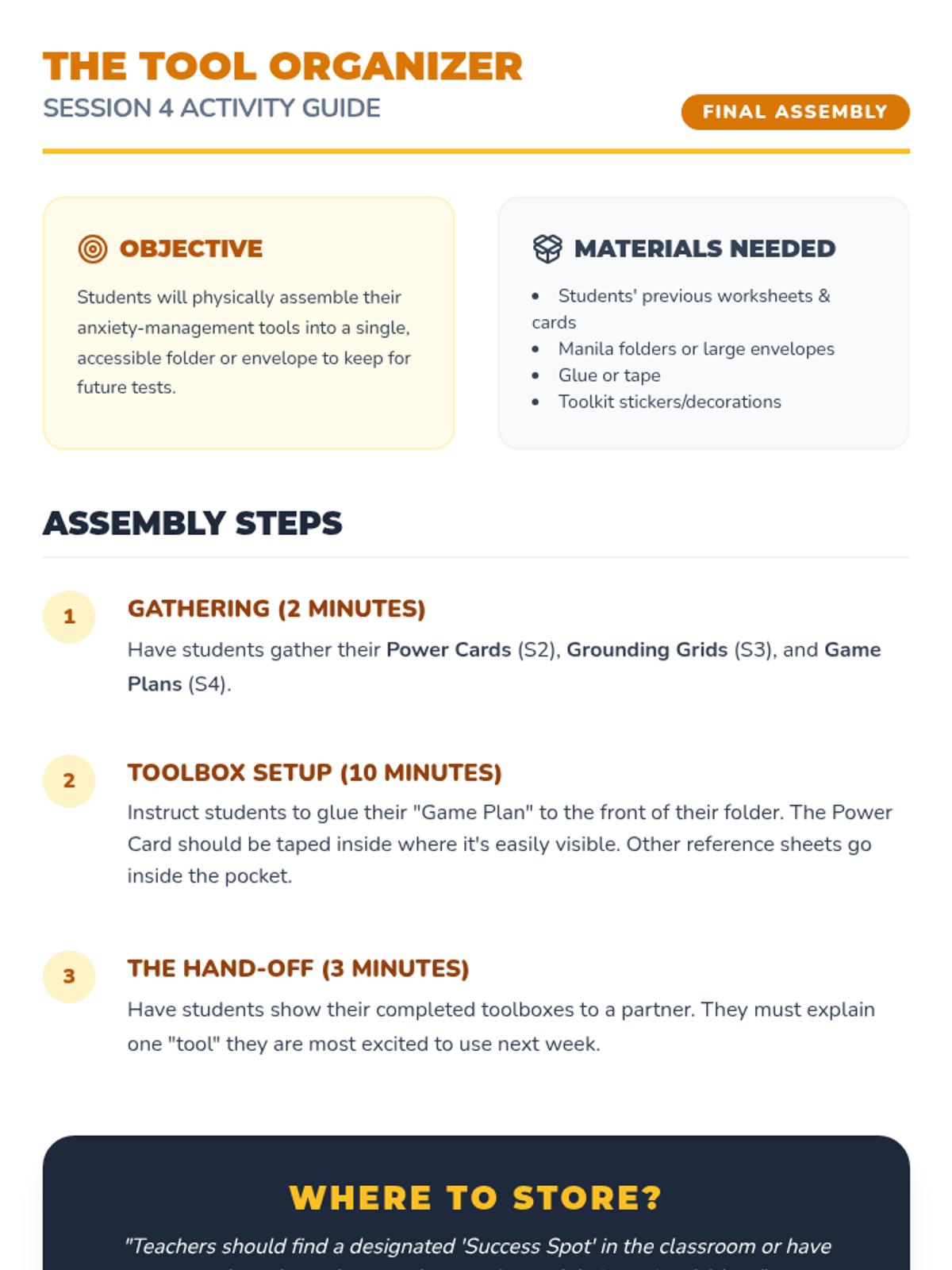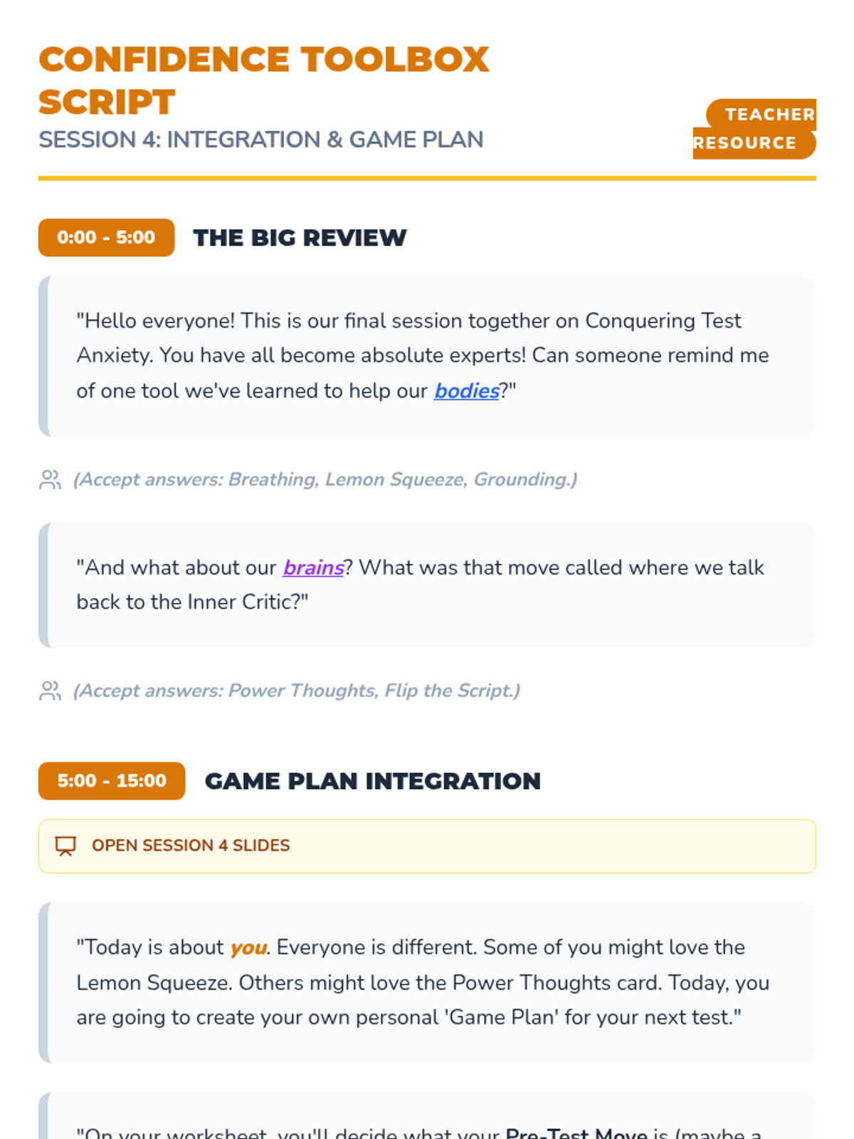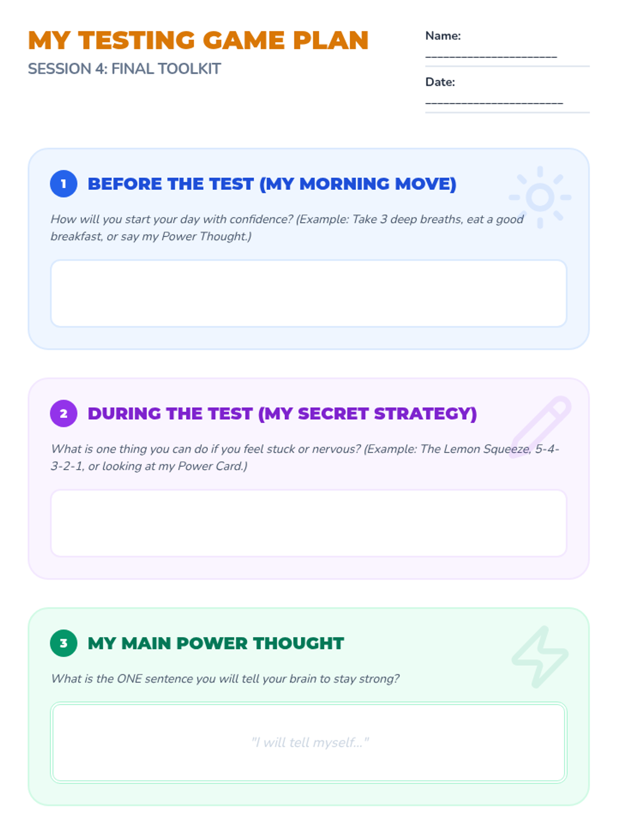 A 4-session sequence for grades 3-5 focused on recognizing signs of test anxiety, developing cognitive and physical coping strategies, and building a personalized confidence toolkit for academic success.