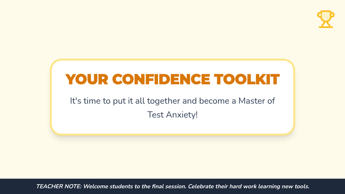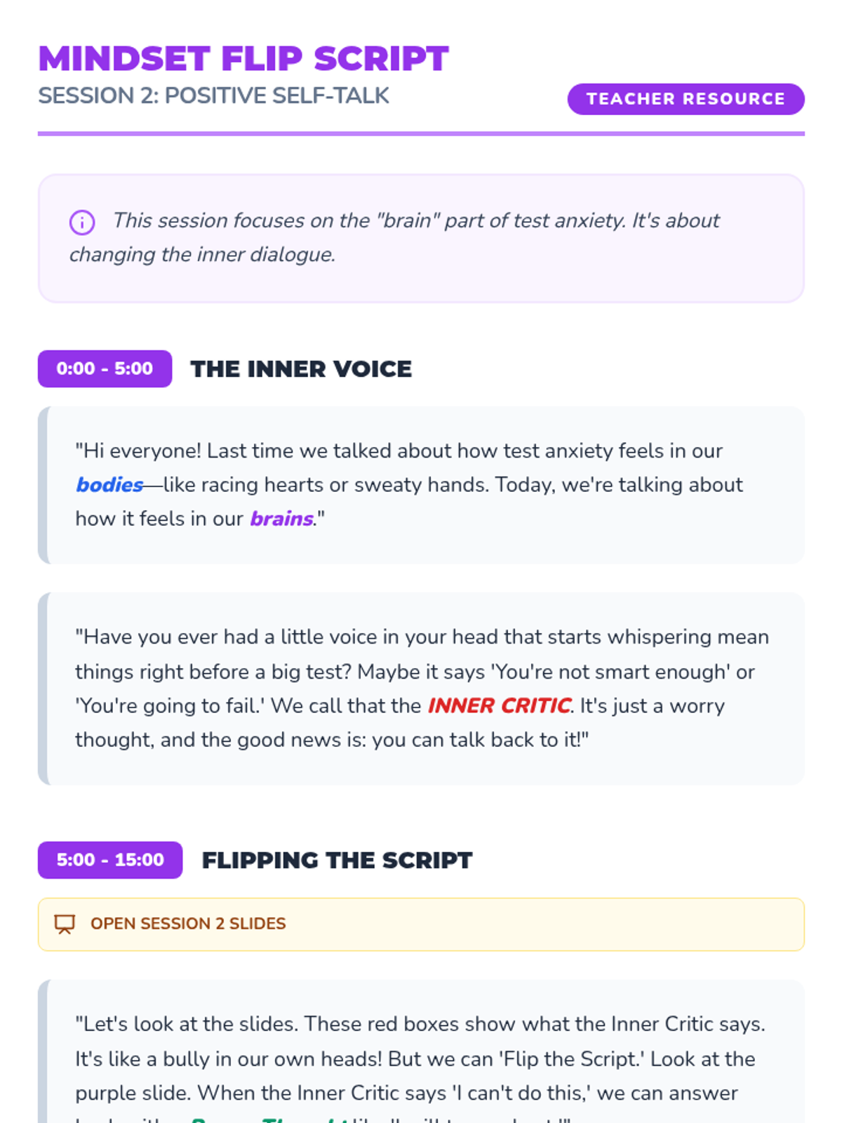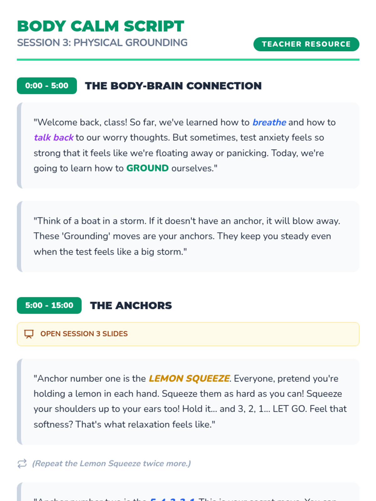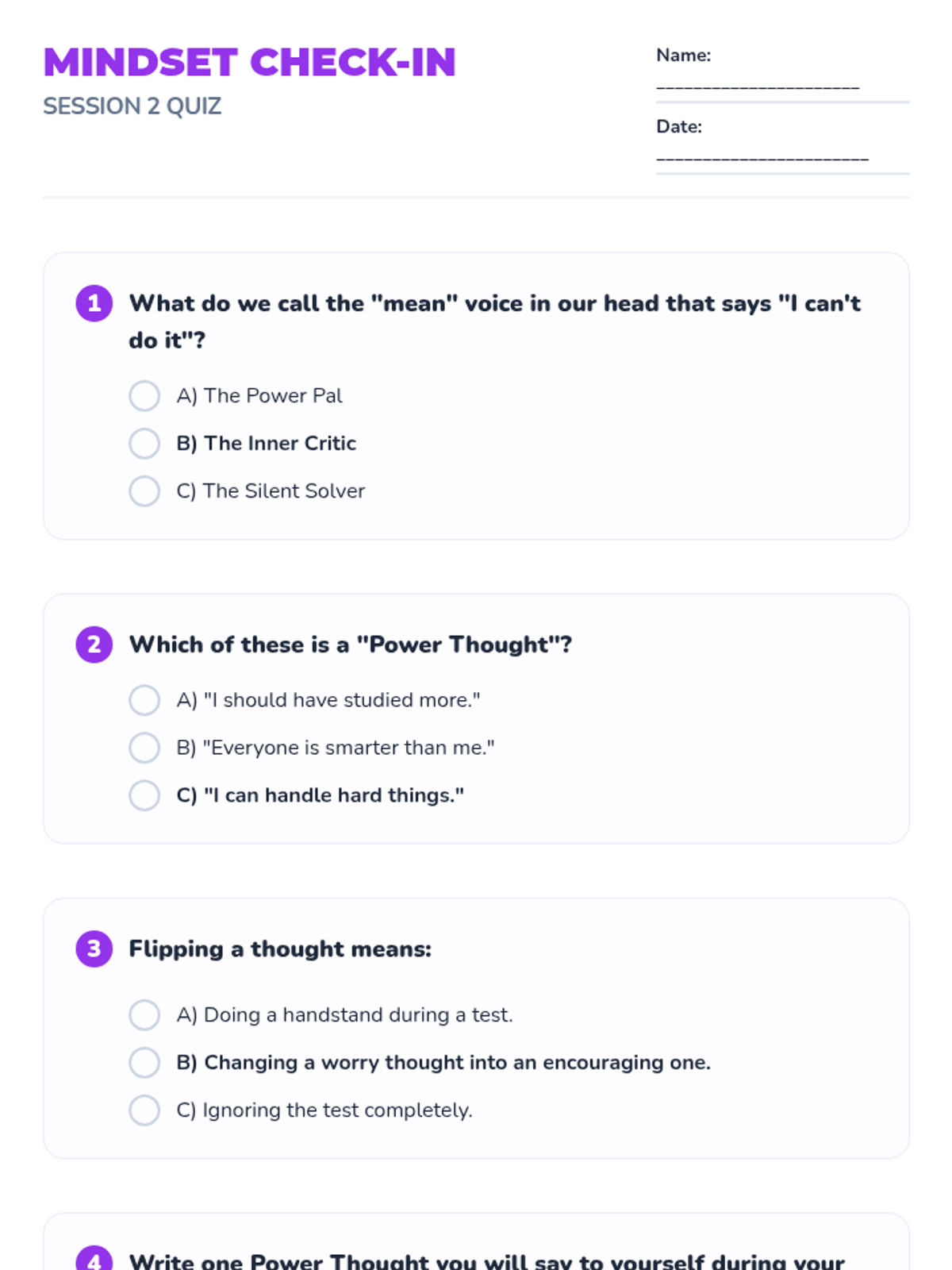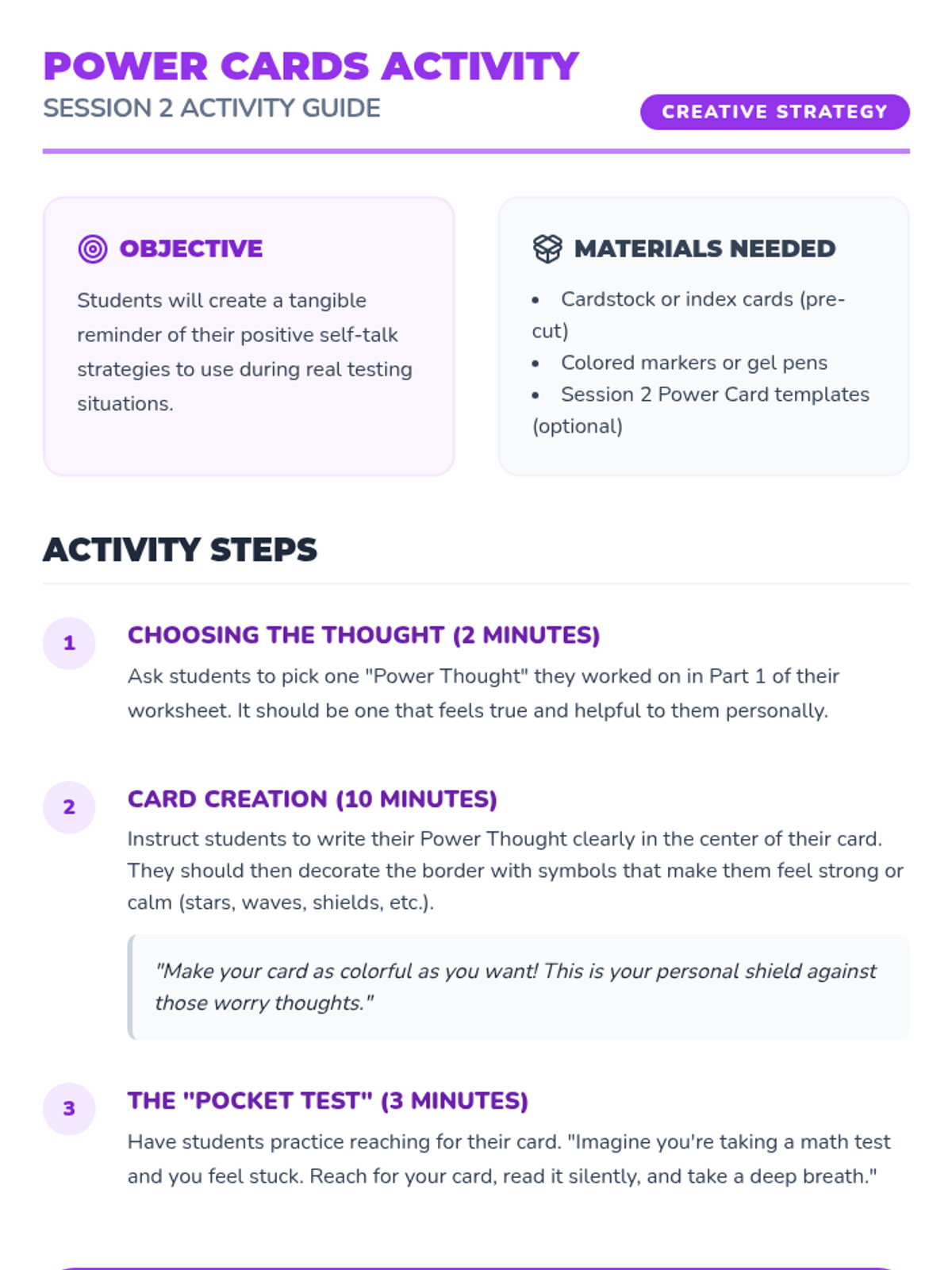 A 4-session sequence for grades 3-5 focused on recognizing signs of test anxiety, developing cognitive and physical coping strategies, and building a personalized confidence toolkit for academic success.