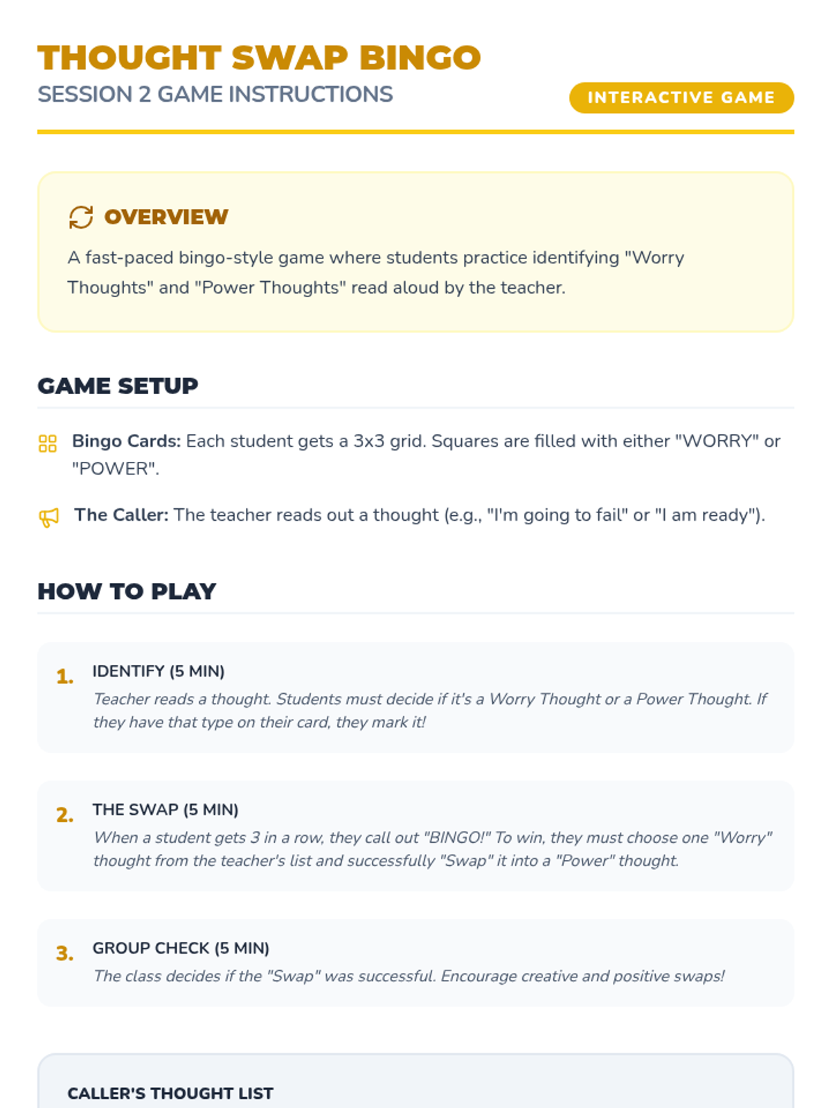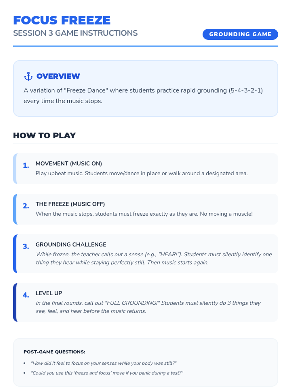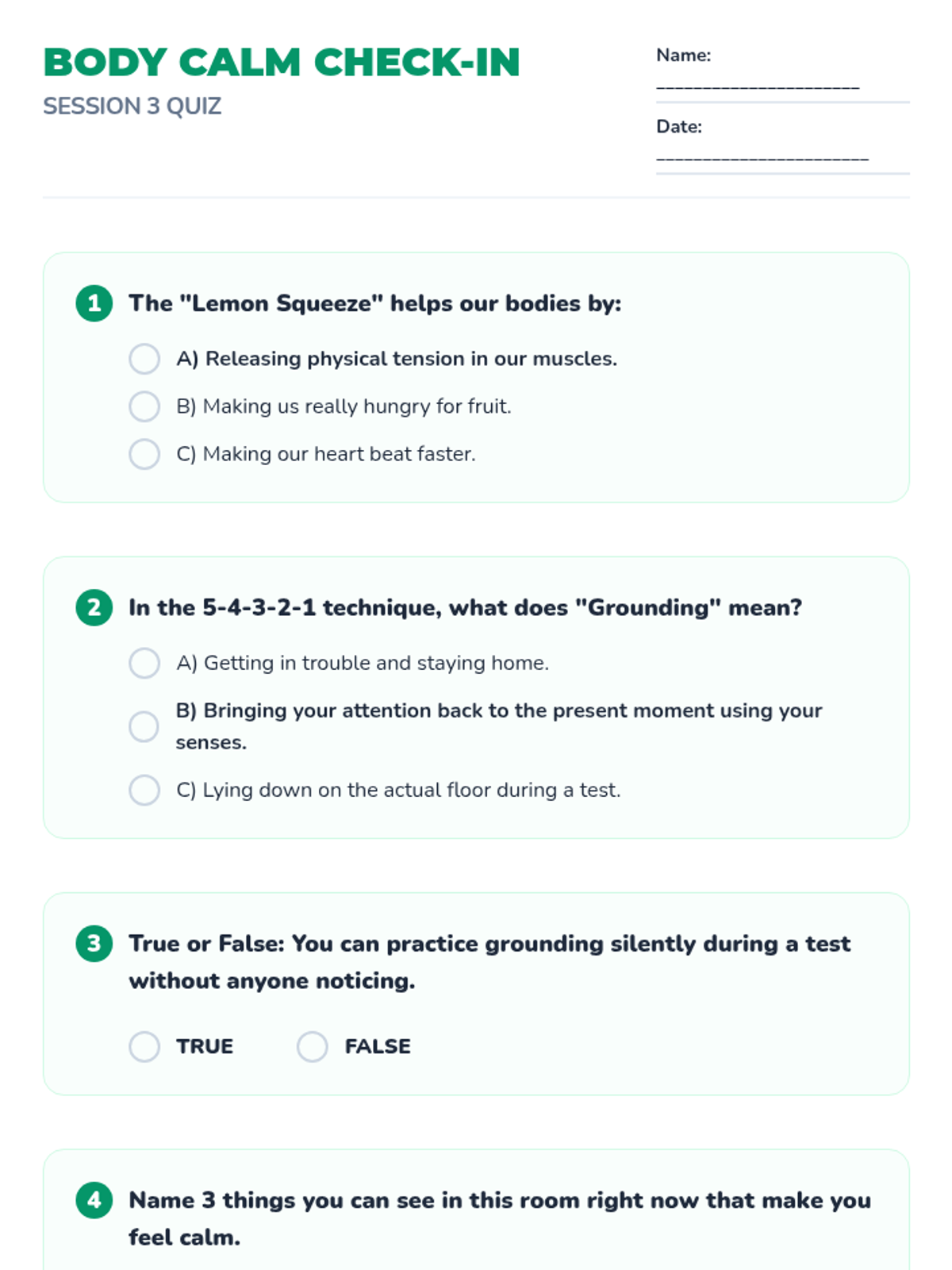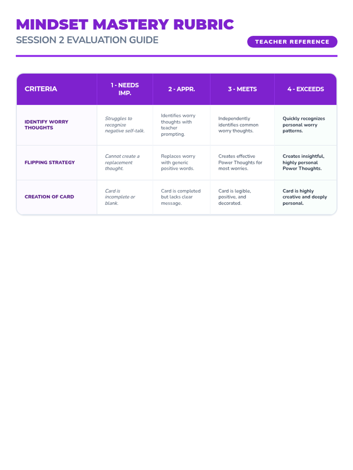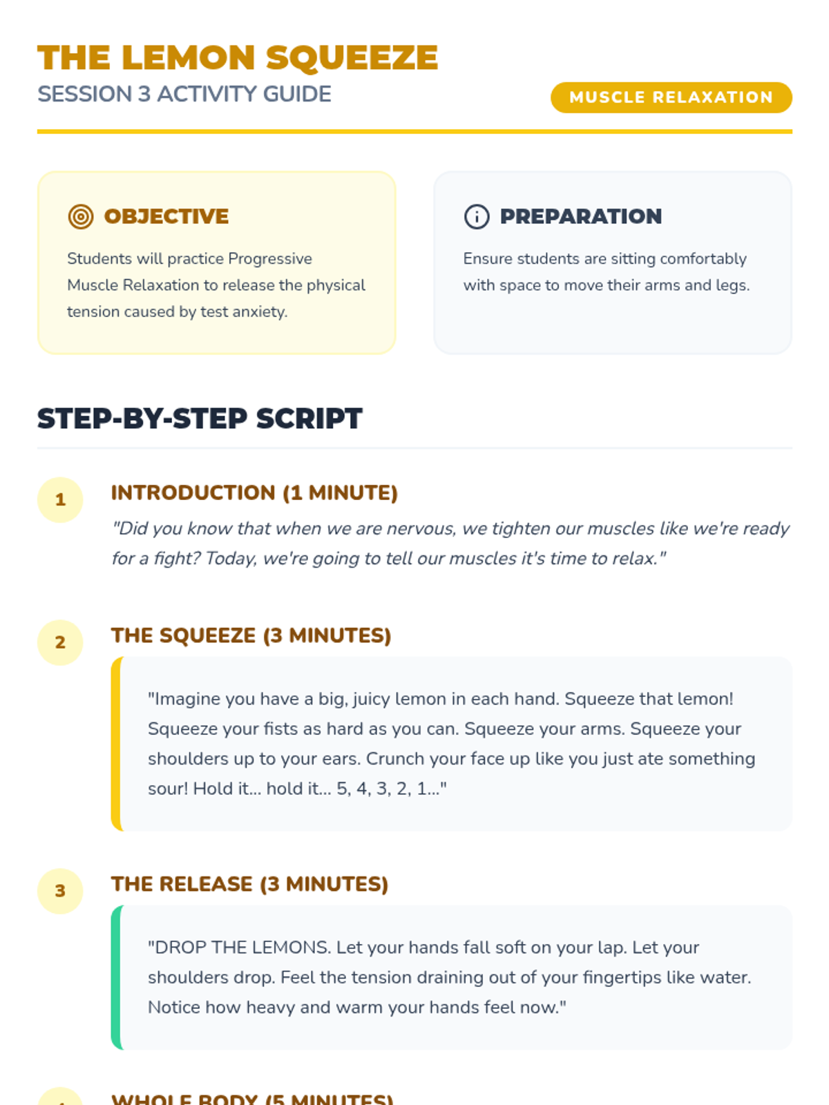 A 4-session sequence for grades 3-5 focused on recognizing signs of test anxiety, developing cognitive and physical coping strategies, and building a personalized confidence toolkit for academic success.