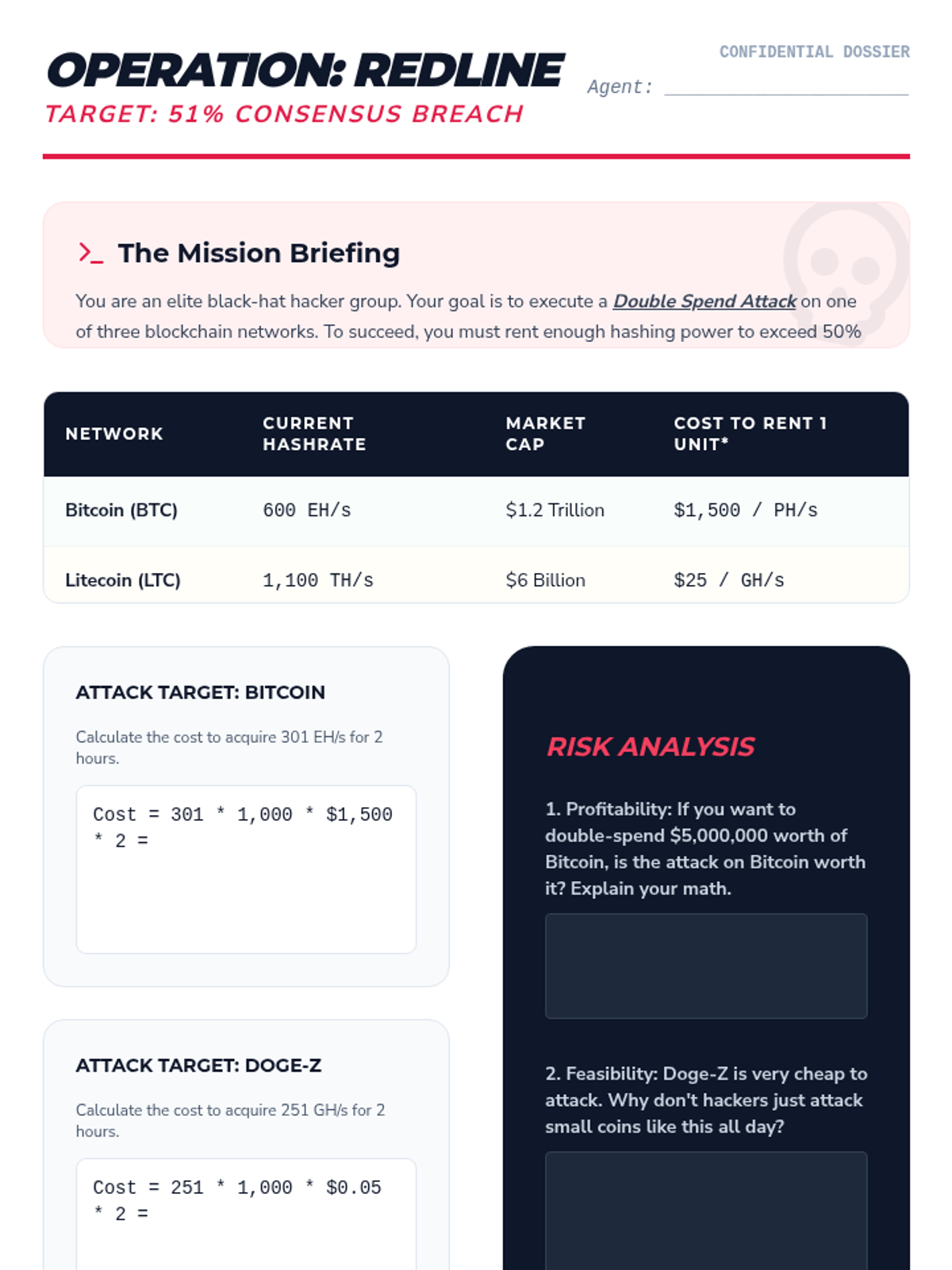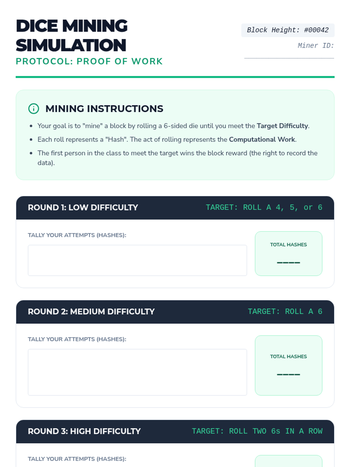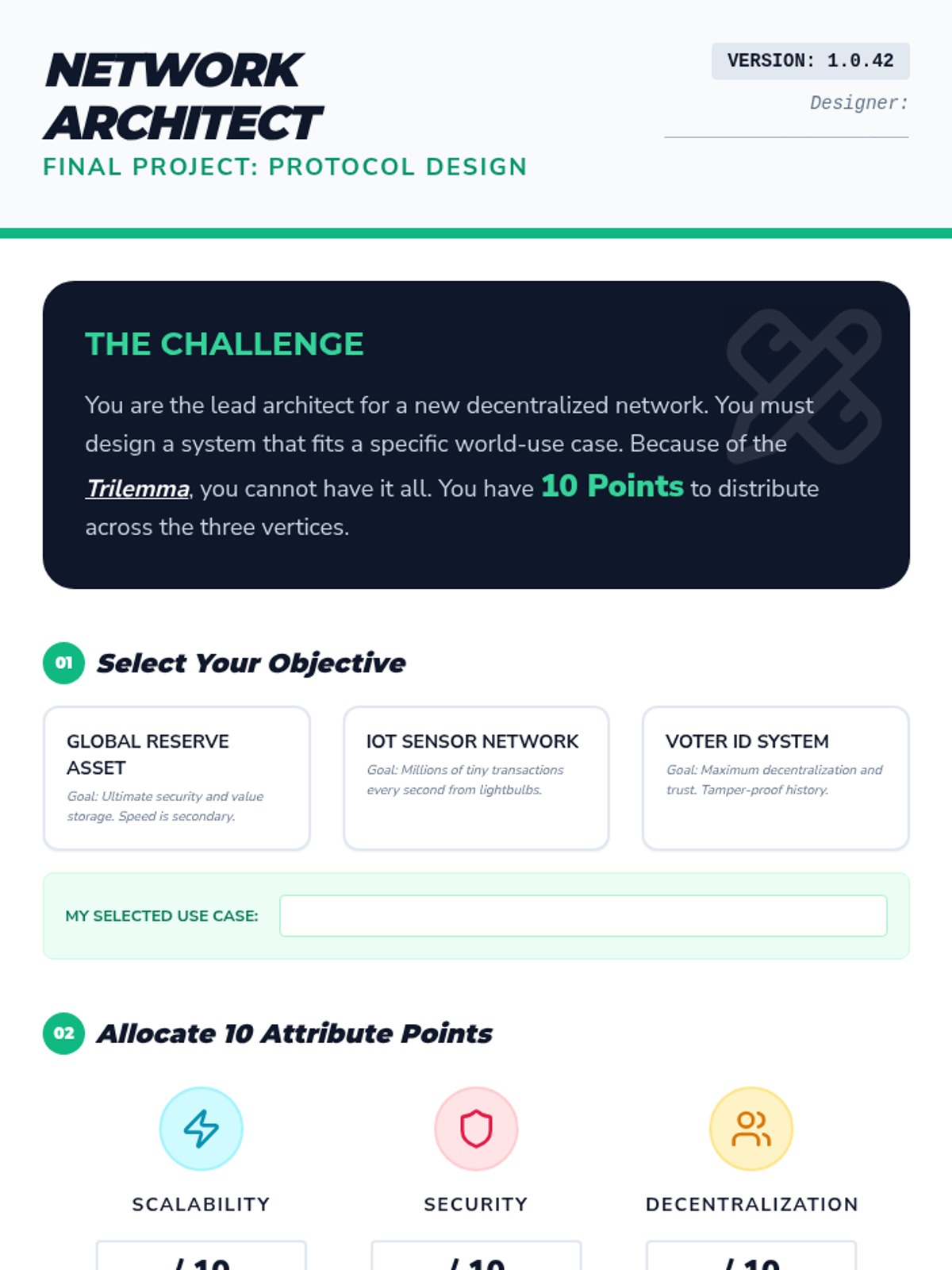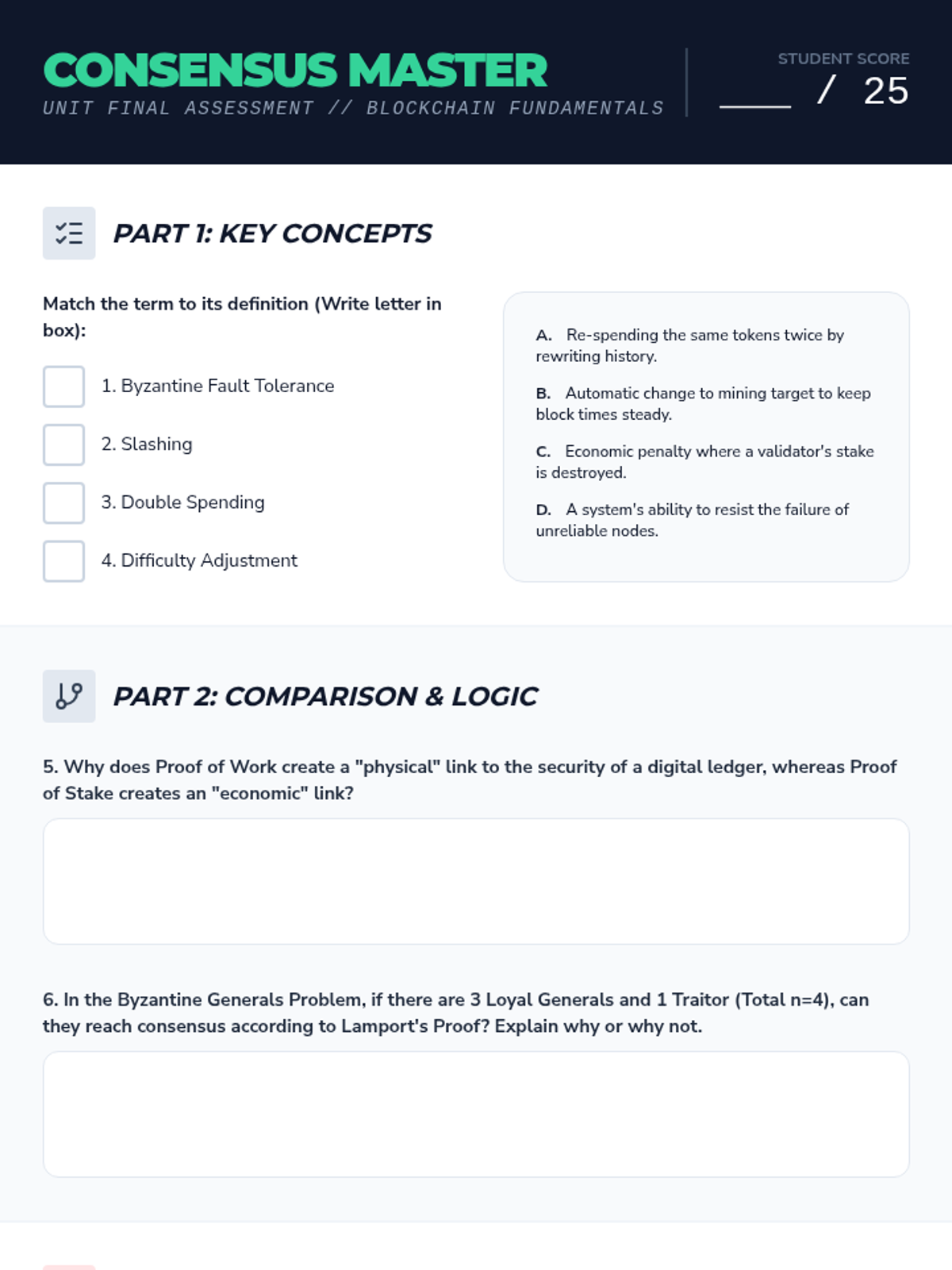 A comprehensive high school computer science sequence exploring how distributed systems reach consensus through game theory, cryptography, and economic incentives. Students analyze the Byzantine Generals Problem, compare Proof of Work and Proof of Stake, and evaluate the security of blockchain networks.