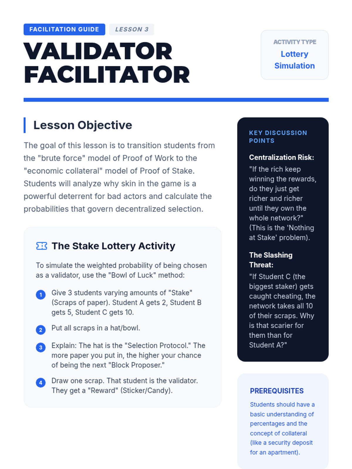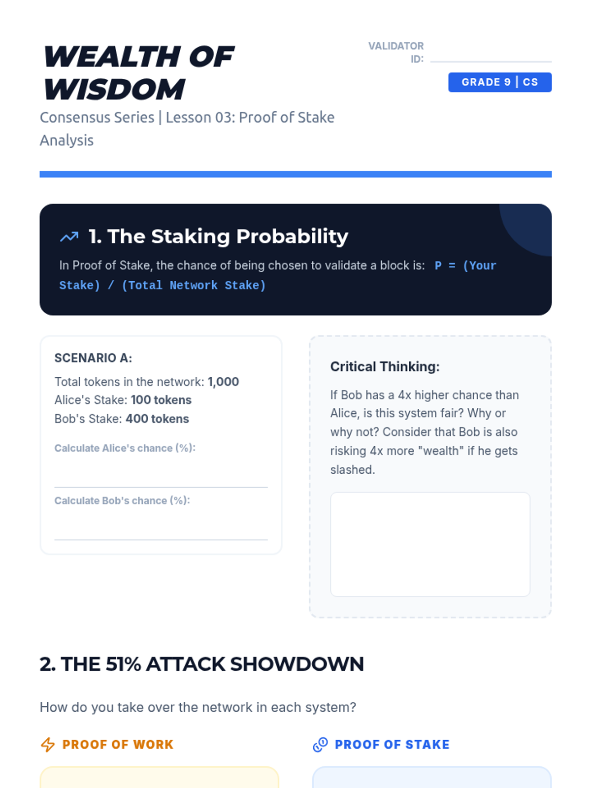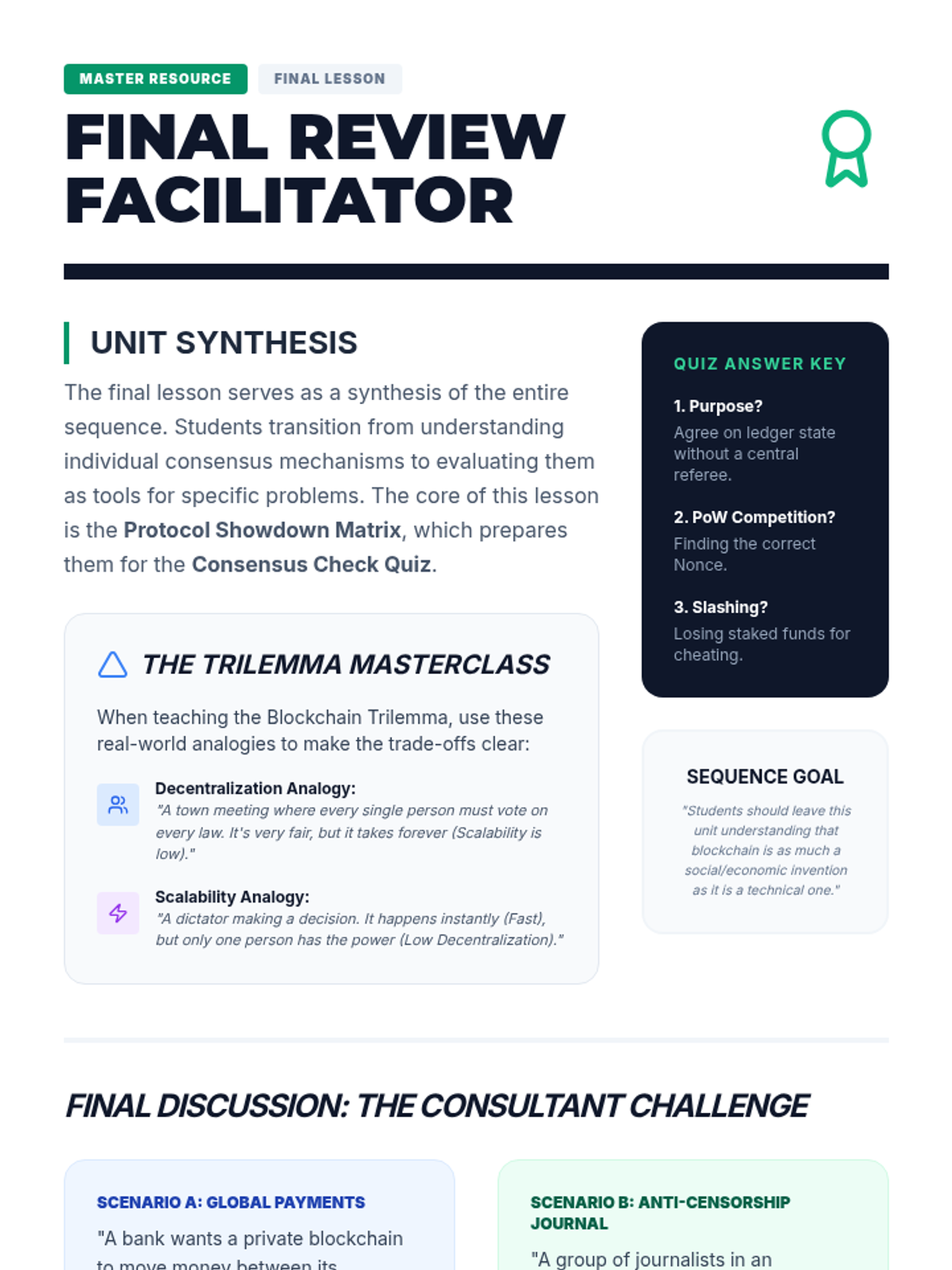 This sequence investigates the consensus algorithms that allow decentralized networks to agree on the state of the ledger. Students examine the mechanics of Proof of Work (PoW) and Proof of Stake (PoS), analyzing the economic incentives and environmental implications of each. through game-based learning, students simulate mining and staking to grasp the difficulty of achieving consensus.