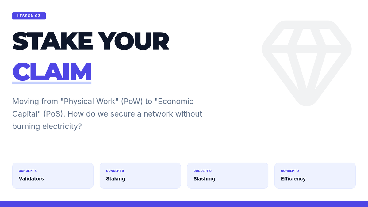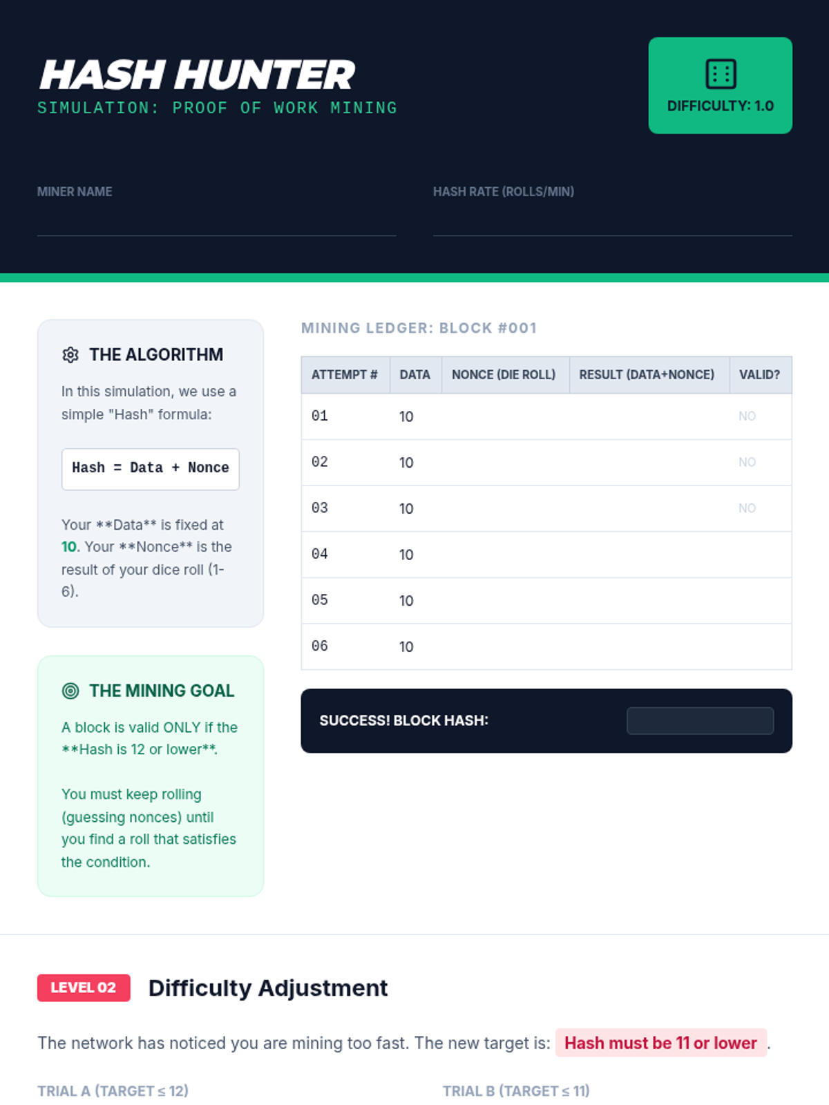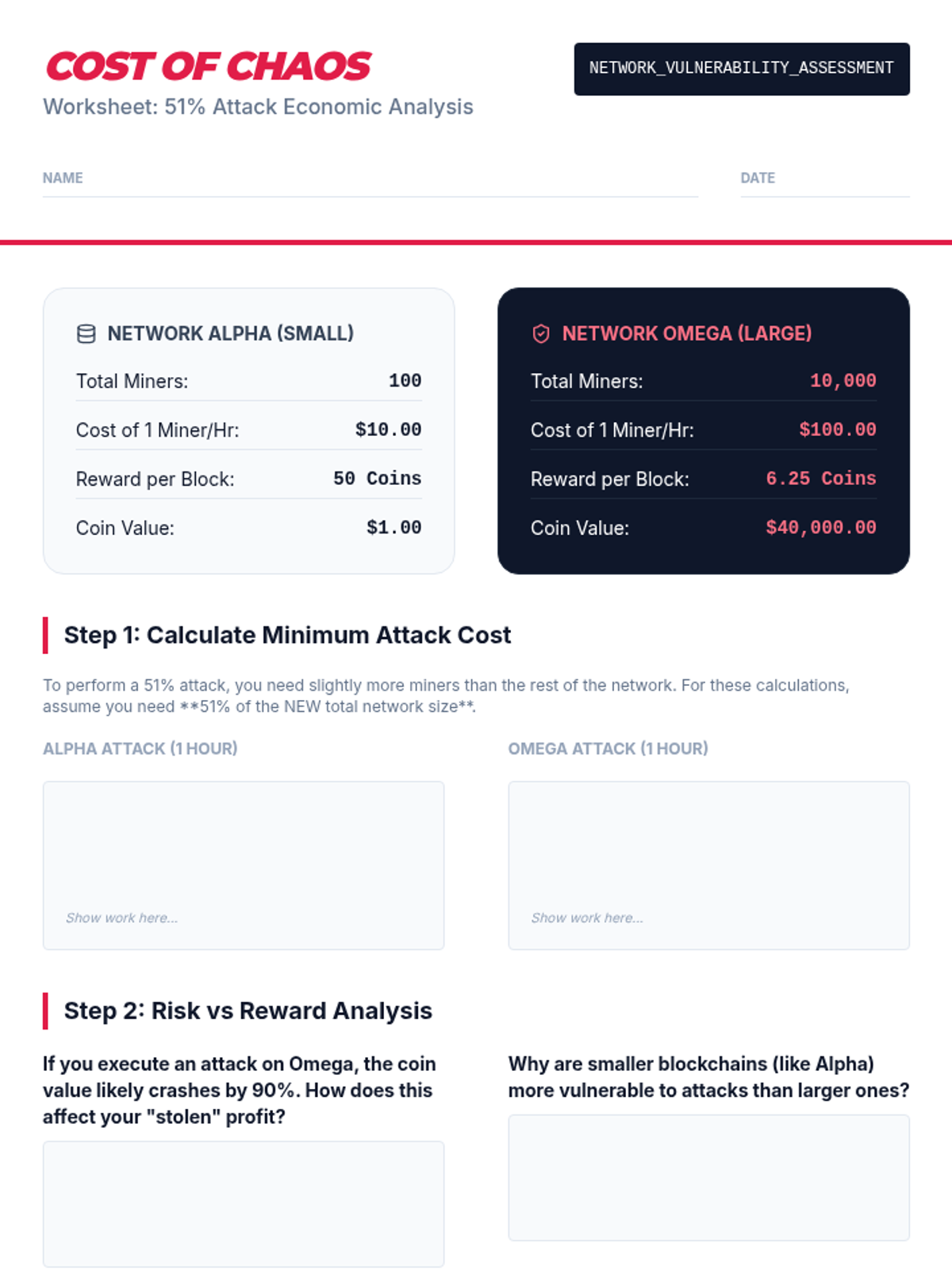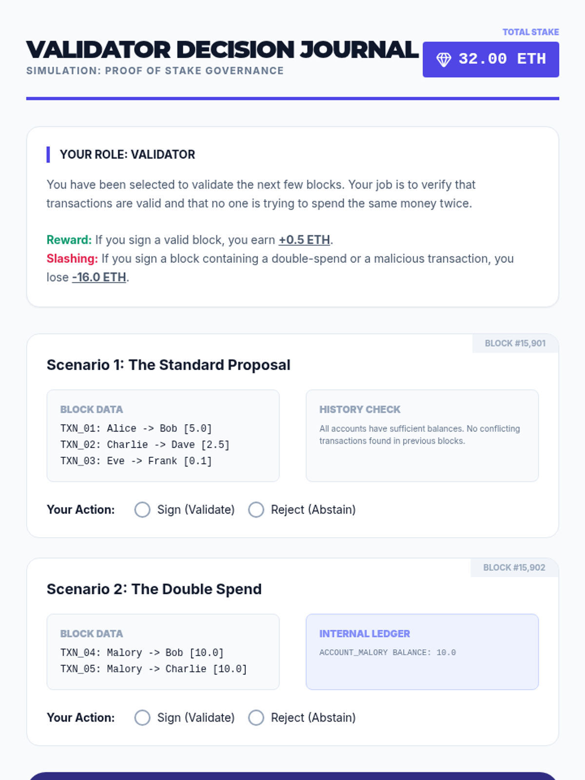 Students investigate the economic and algorithmic rules that secure blockchains, known as consensus mechanisms. The sequence compares Proof of Work (PoW) and Proof of Stake (PoS), analyzing their security models, energy consumption, and resistance to attacks using game theory concepts like the Byzantine Generals Problem.