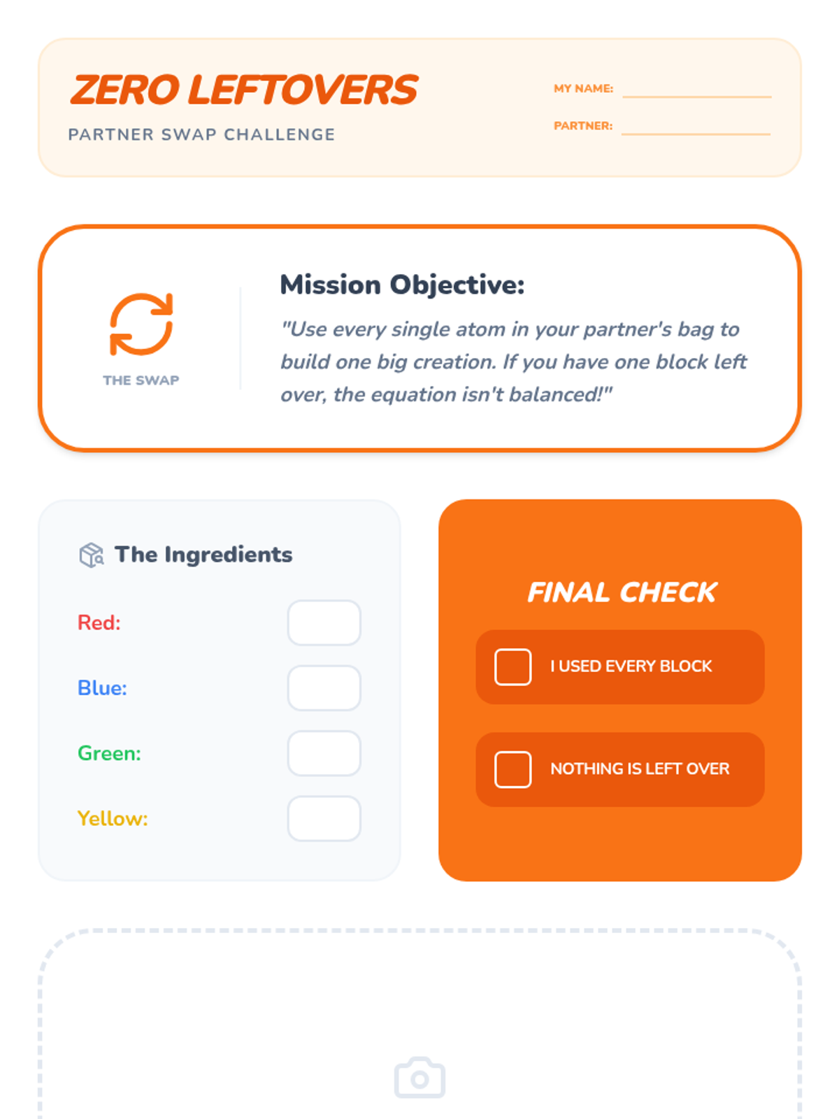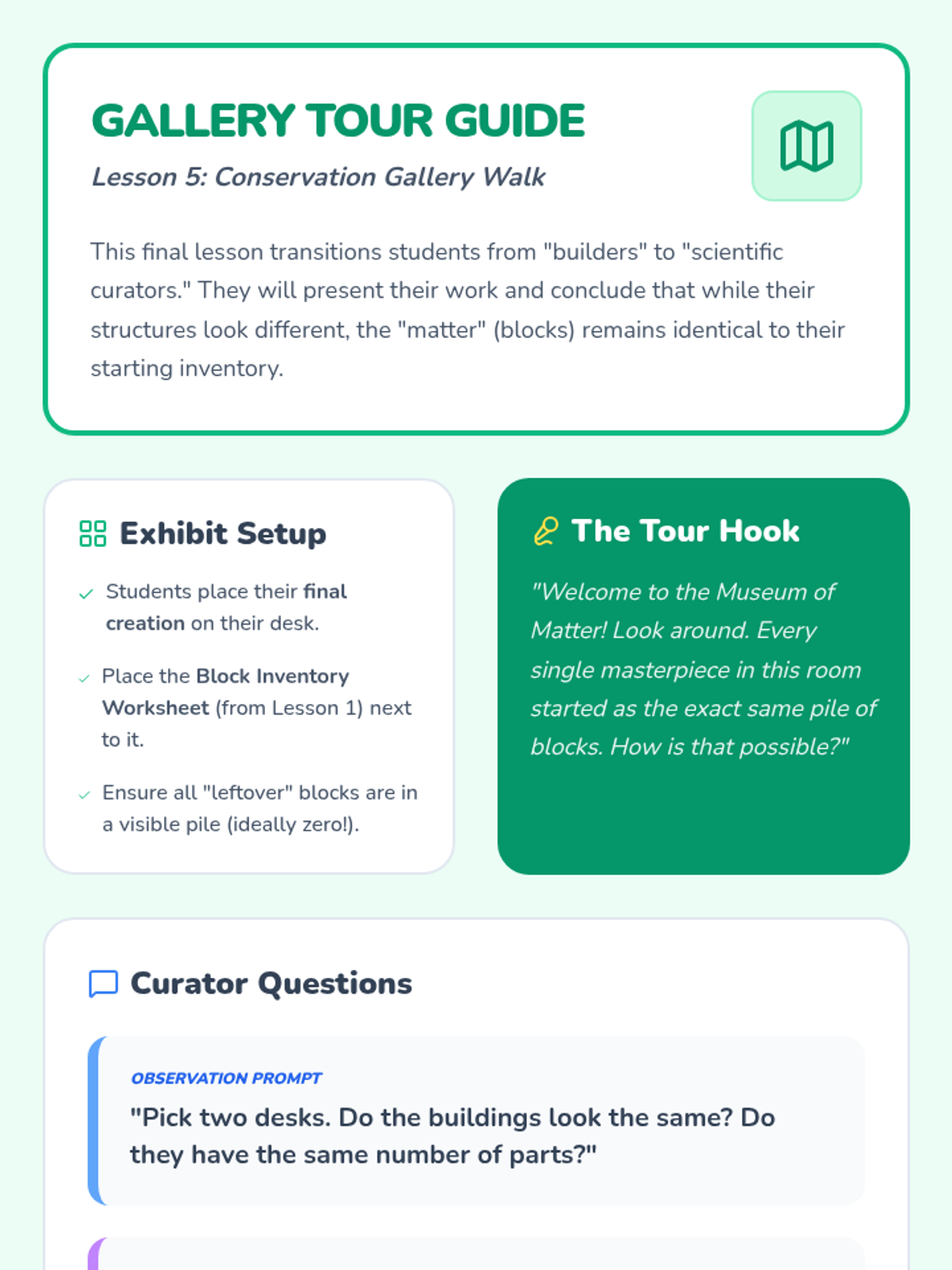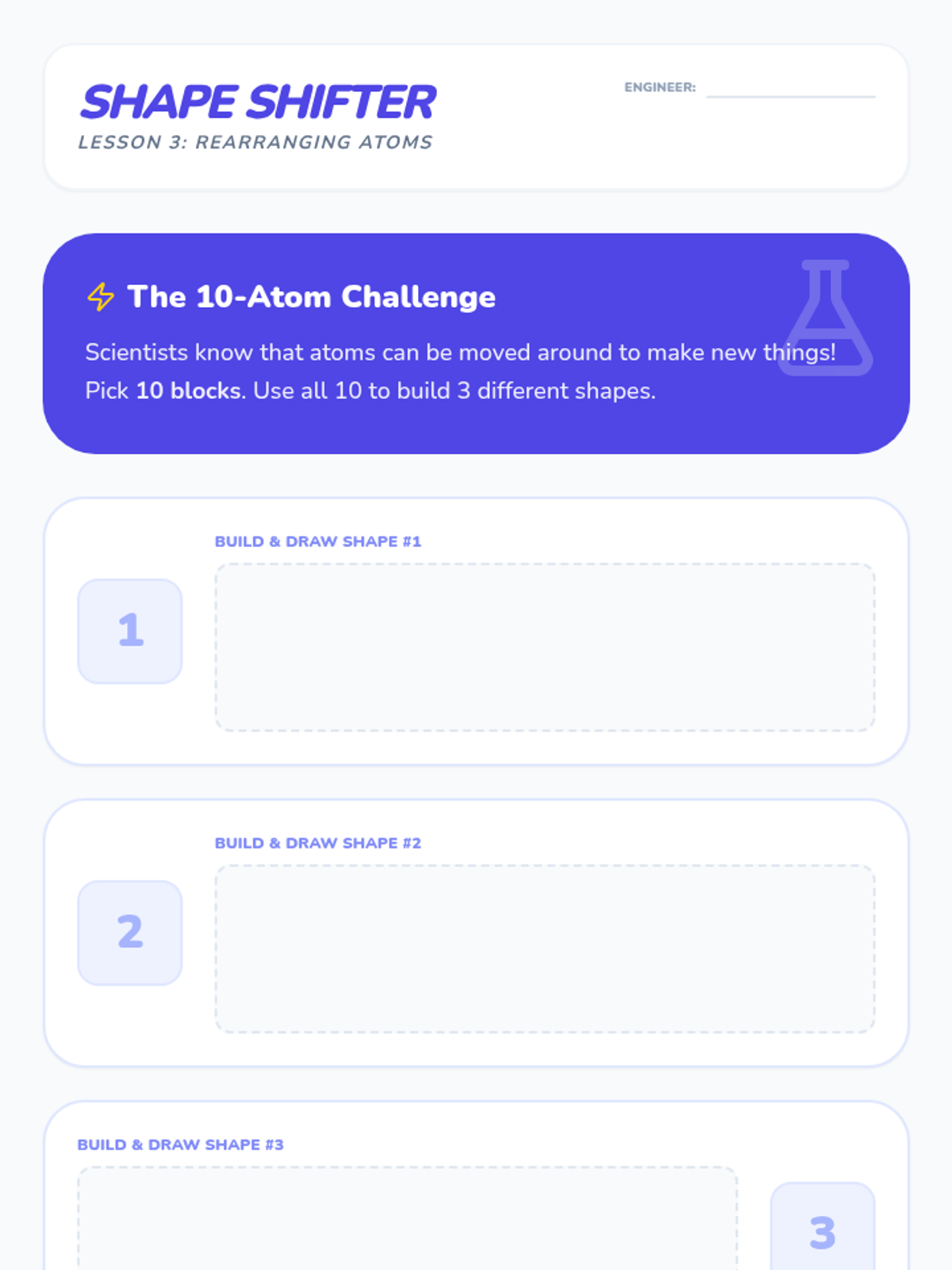A 1st-grade chemistry sequence that uses construction blocks to introduce the Law of Conservation of Mass. Students learn that matter is neither created nor destroyed, only rearranged, through hands-on building, deconstructing, and inventorying.