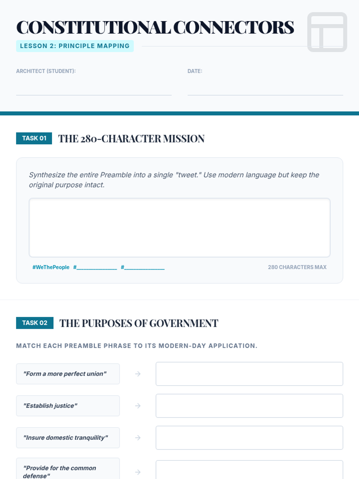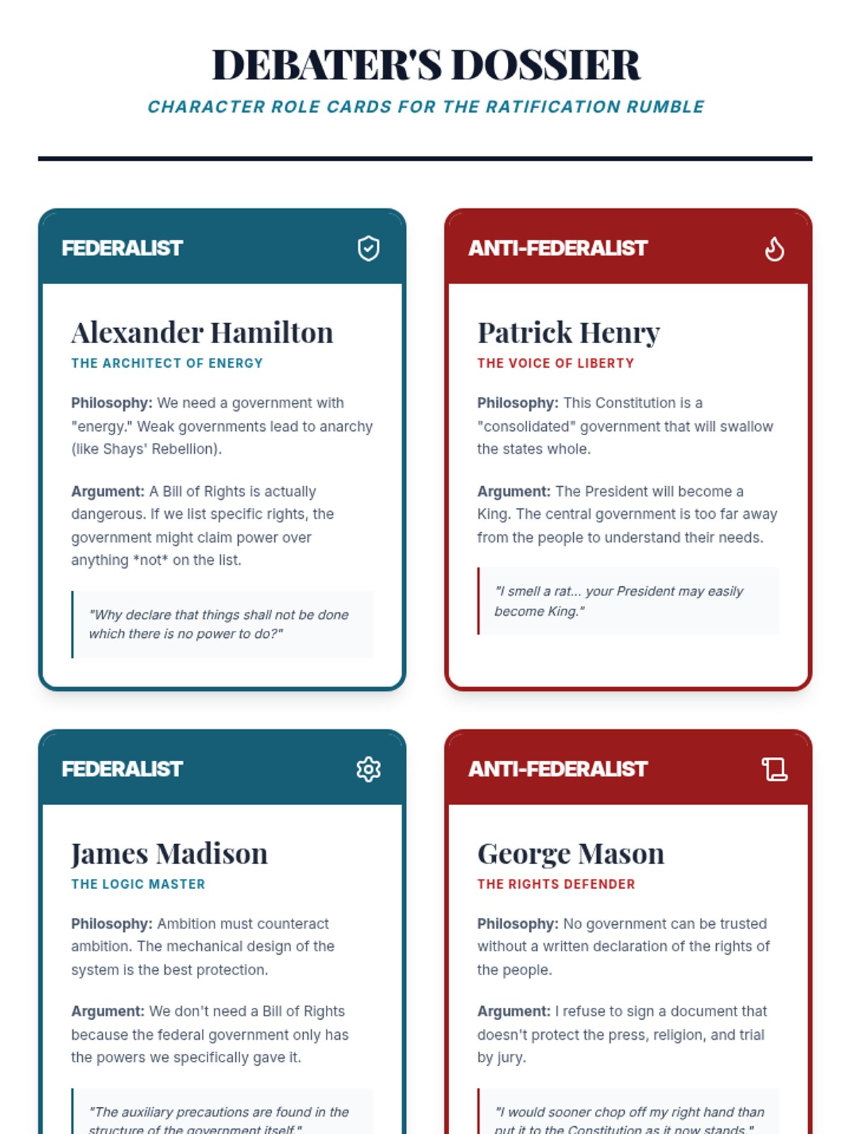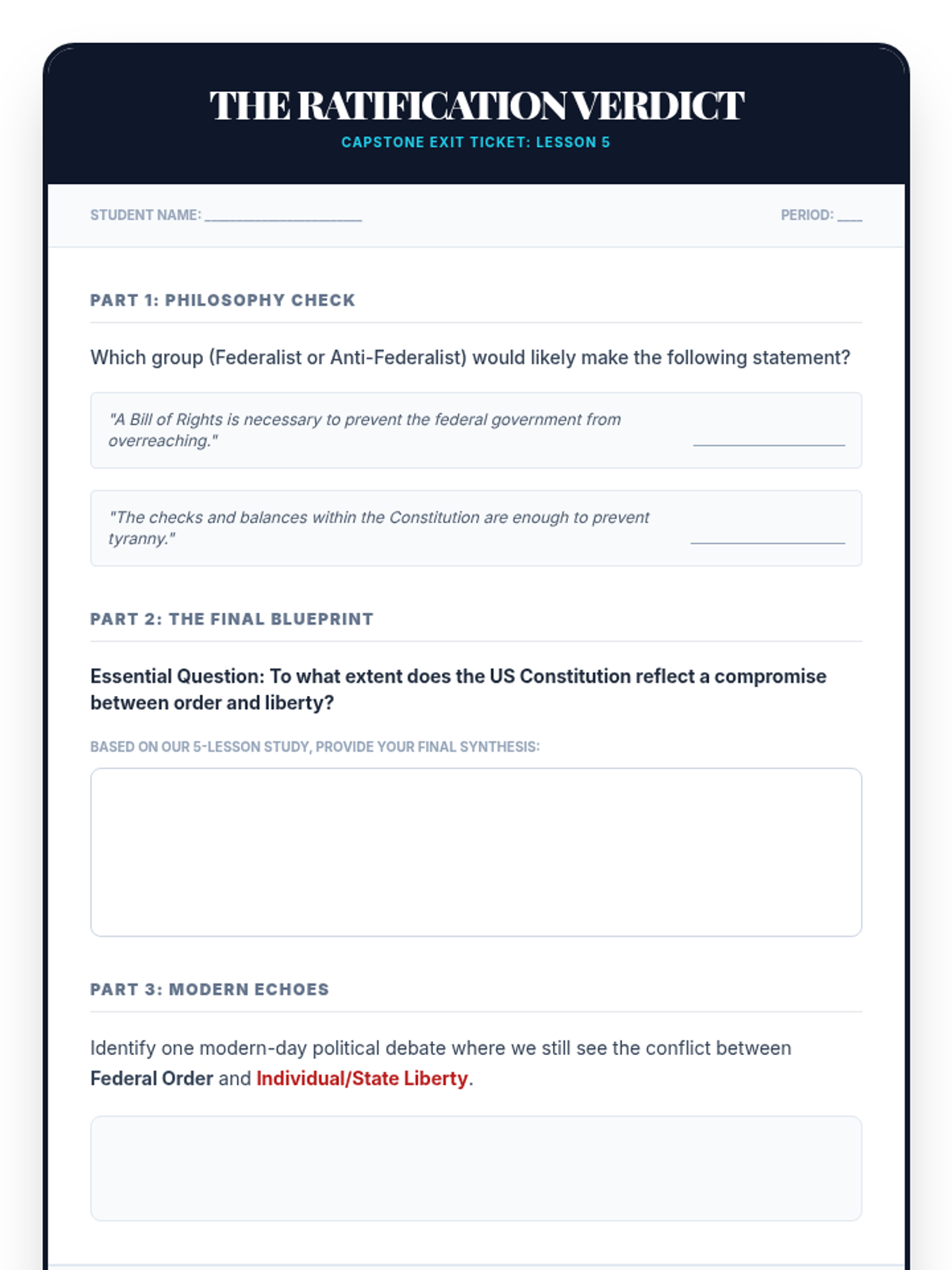 A high school civics sequence exploring the philosophical and historical foundations of the US Constitution, focusing on the transition from the Articles of Confederation to the Federal framework. Students analyze primary sources like The Federalist Papers and debate the core compromises that defined the American government's structure.