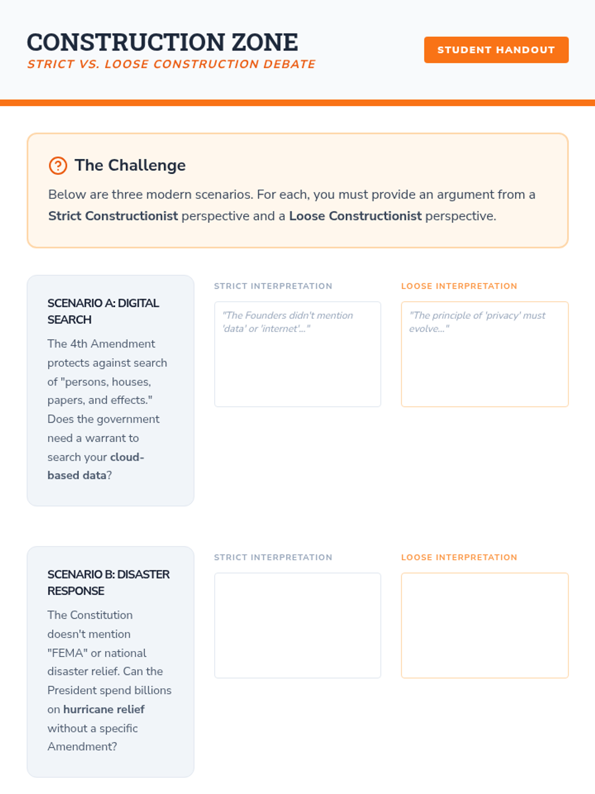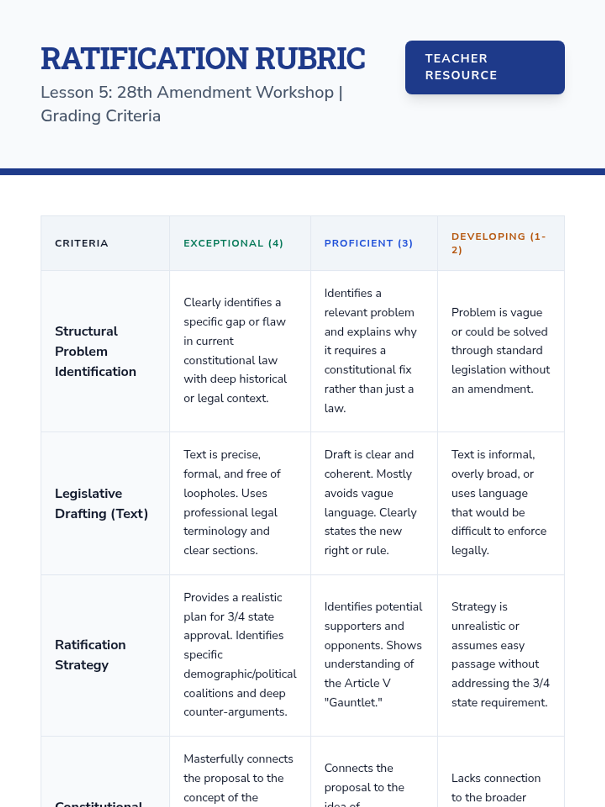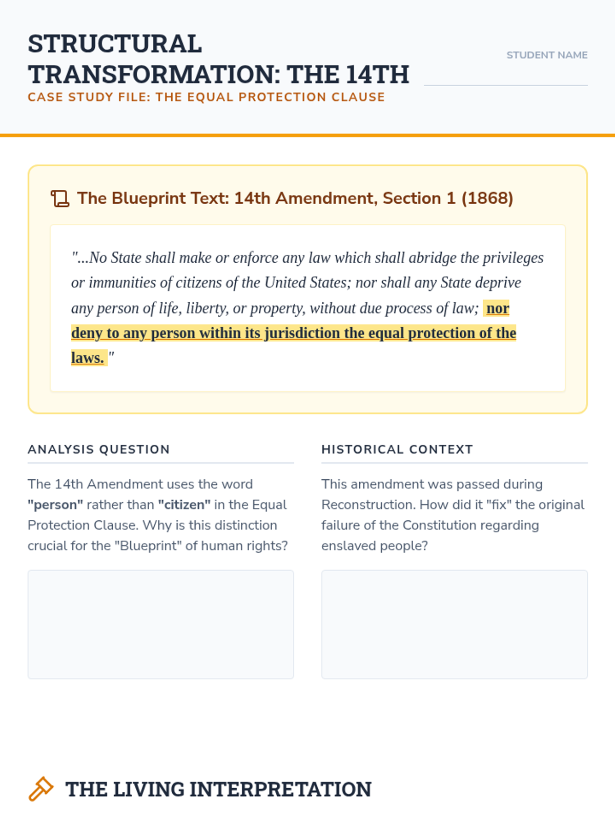 This 12th-grade Civics workshop examines the US Constitution as a 'living document,' focusing on Article V, the 14th Amendment, voting rights, and informal interpretation. Students conclude by researching and drafting their own 28th Amendment to address modern governance challenges.