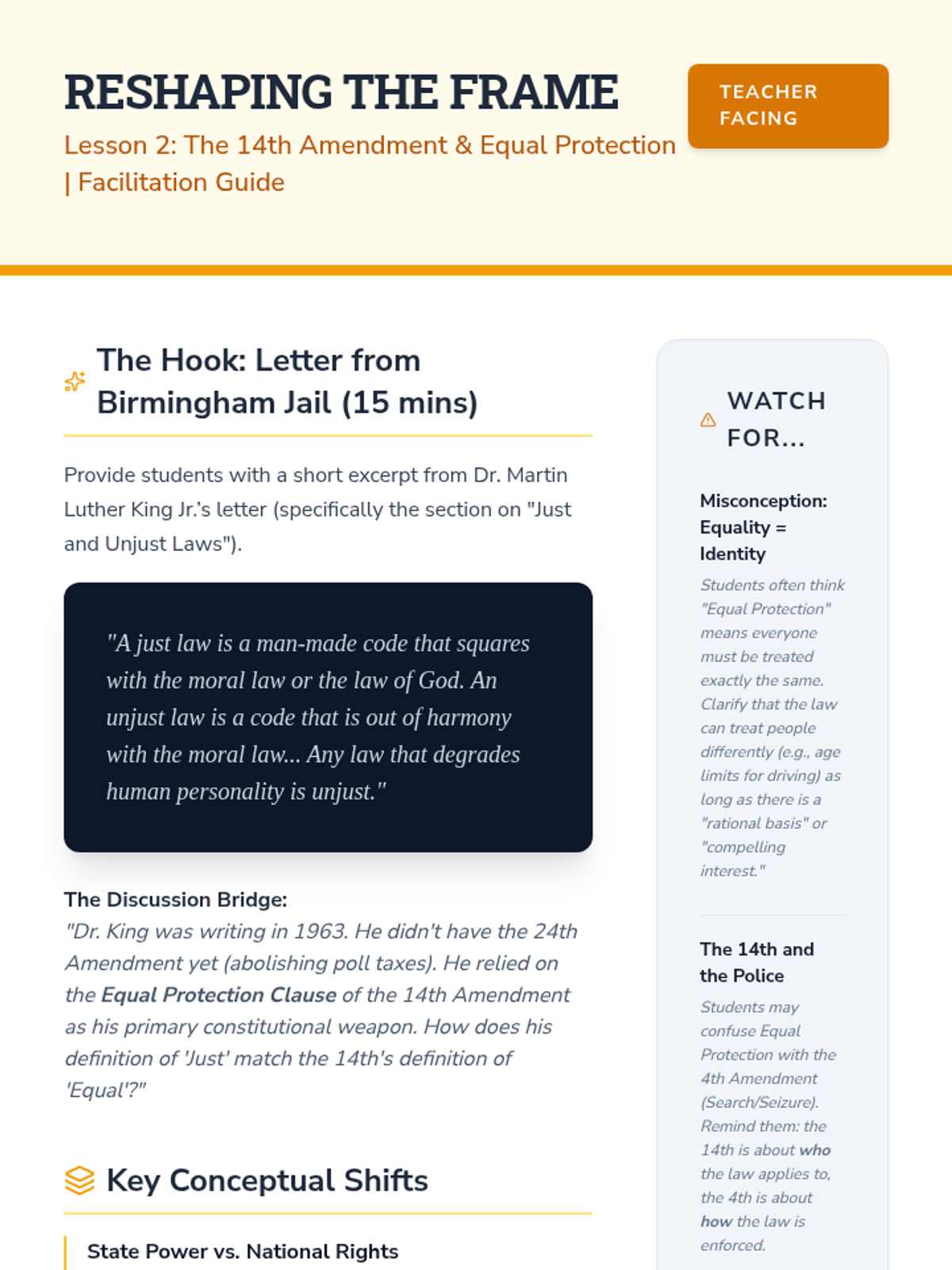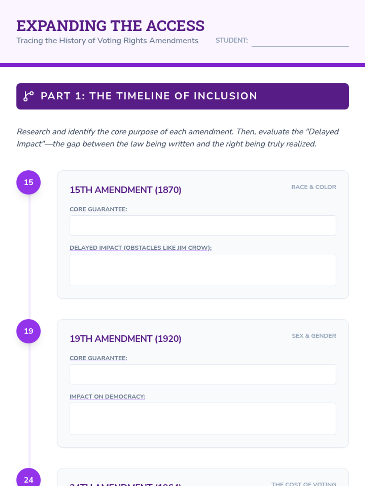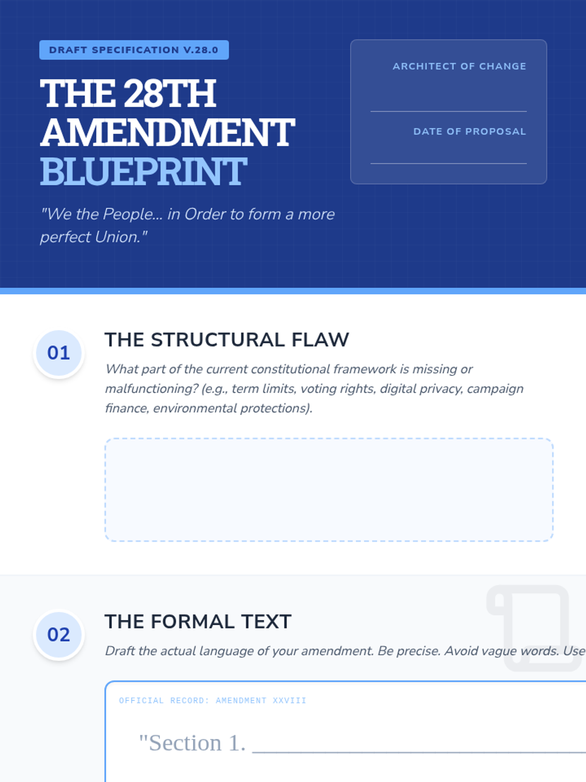 This 12th-grade Civics workshop examines the US Constitution as a 'living document,' focusing on Article V, the 14th Amendment, voting rights, and informal interpretation. Students conclude by researching and drafting their own 28th Amendment to address modern governance challenges.