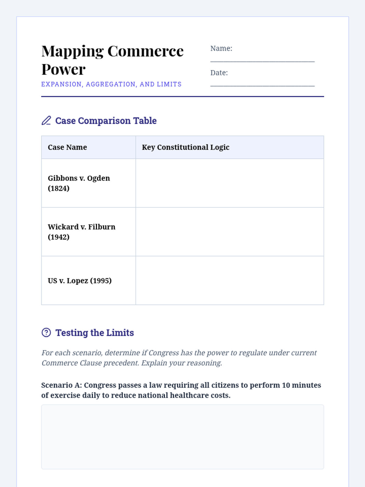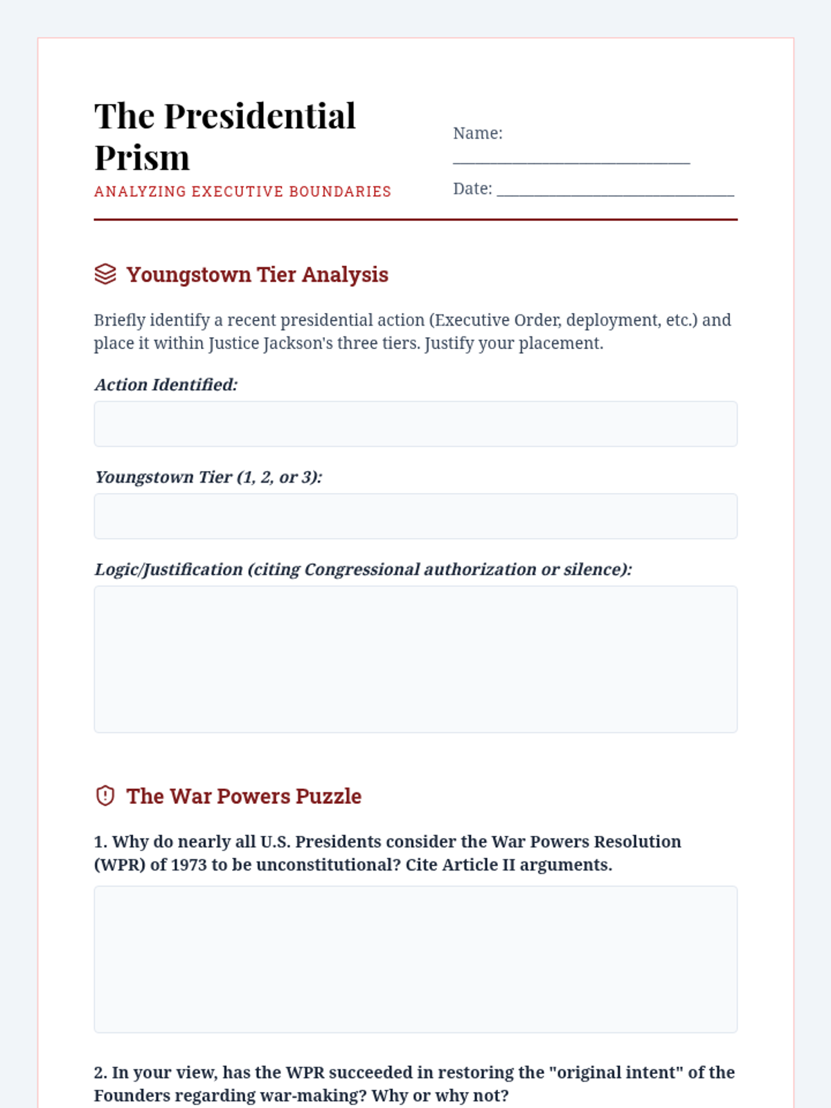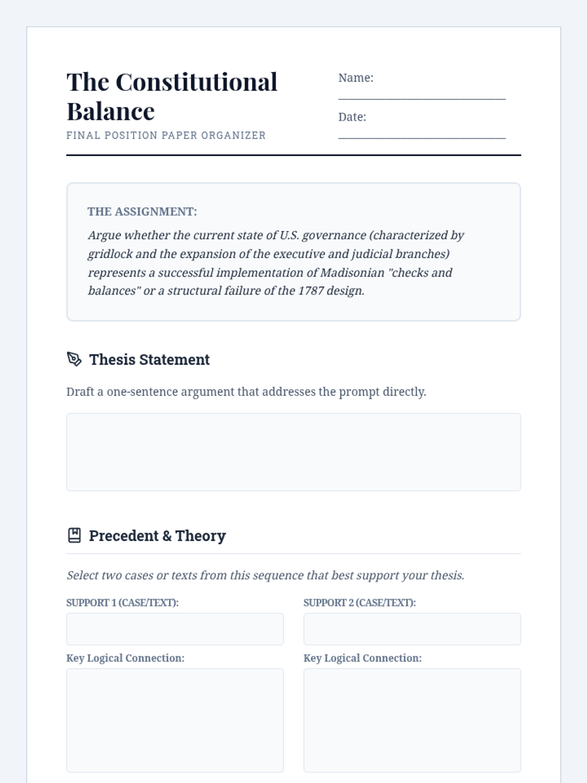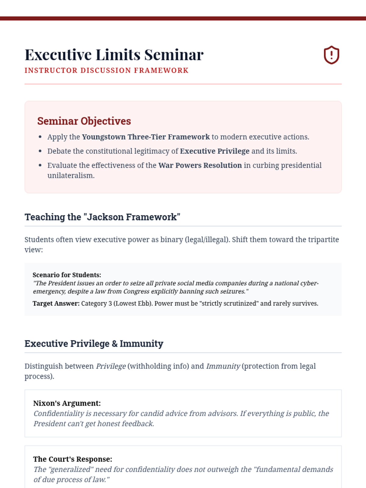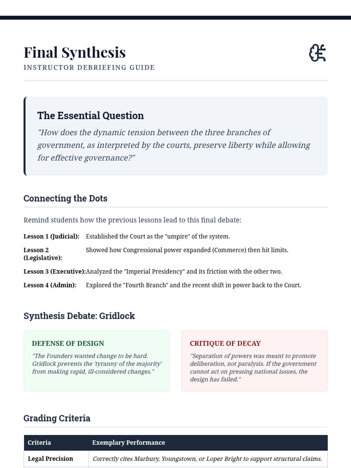 This sequence immerses undergraduate students in the structural mechanics of the US government through the lens of landmark Supreme Court jurisprudence, tracing the evolution of separation of powers and federal authority.
