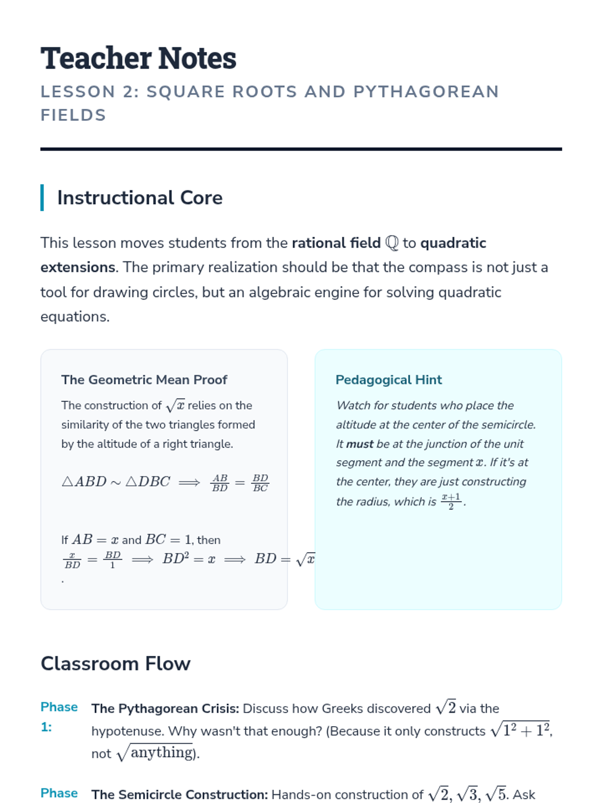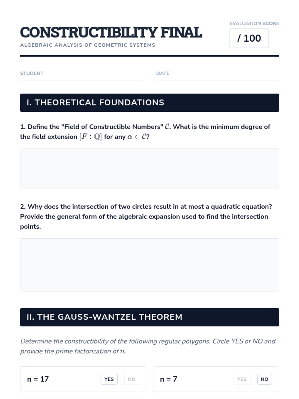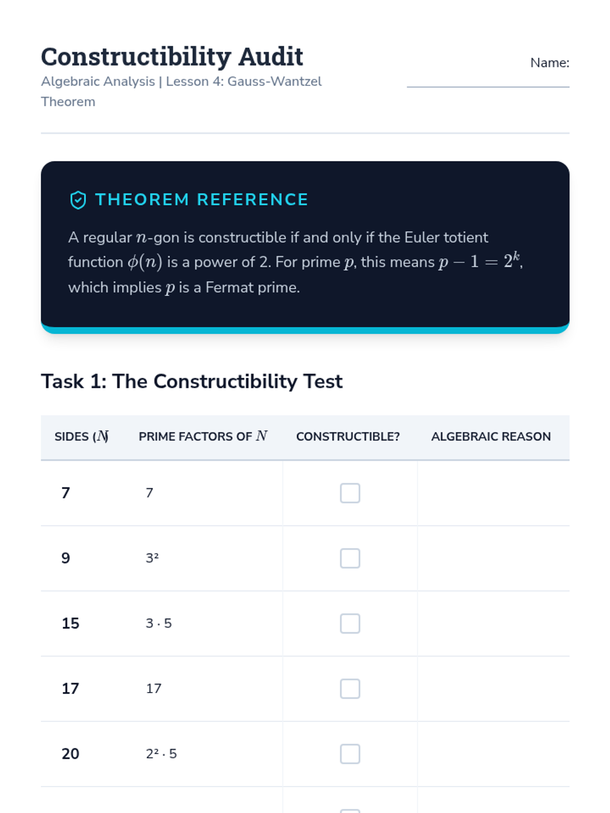 This sequence bridges Euclidean geometry with abstract algebra, investigating the field of constructible numbers and the Gauss-Wantzel Theorem to determine which regular polygons can be constructed using a ruler and compass.
