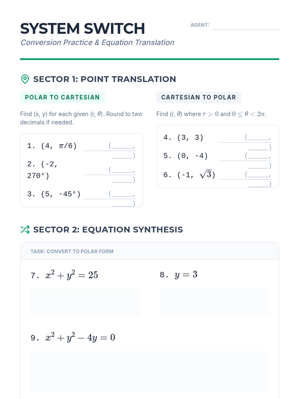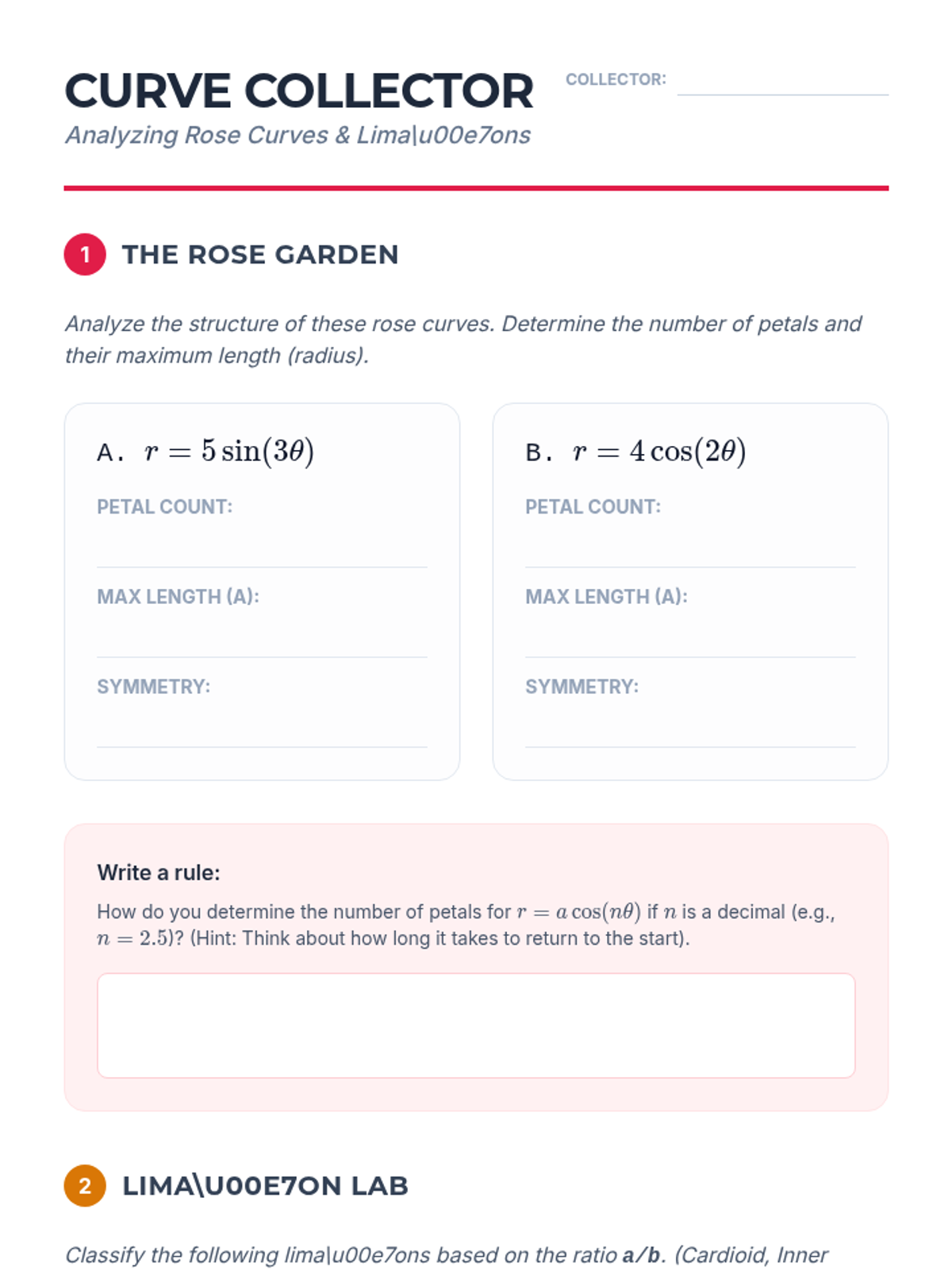 Students transition from Cartesian to polar coordinates, exploring the geometry of circular grids and the equations that define complex curves like roses and lima\u00e7ons. The unit covers plotting, conversion, and advanced graphing analysis with a focus on symmetry and intersection.