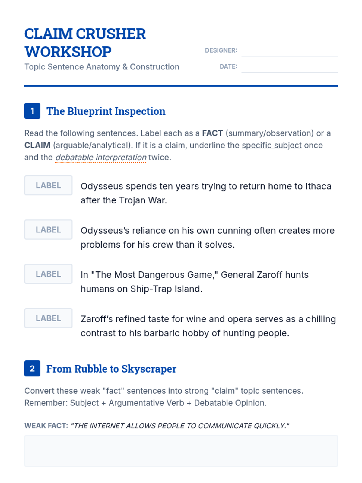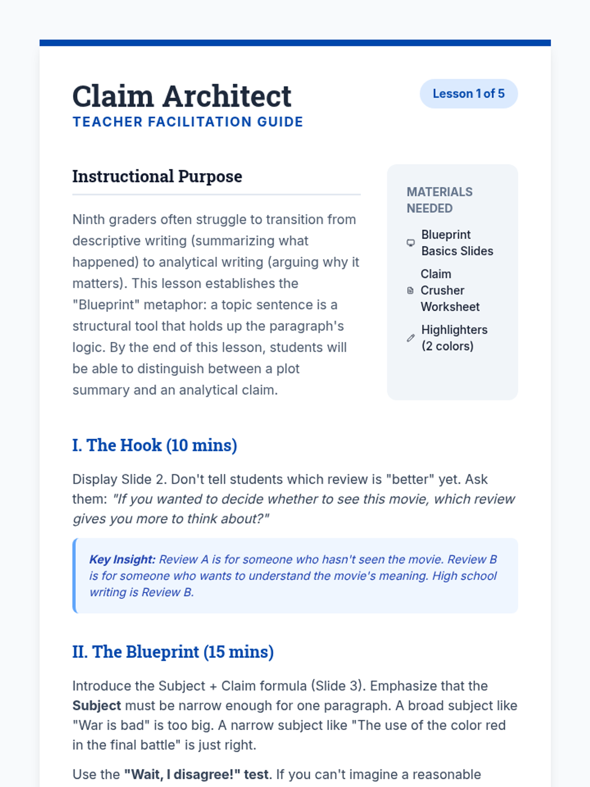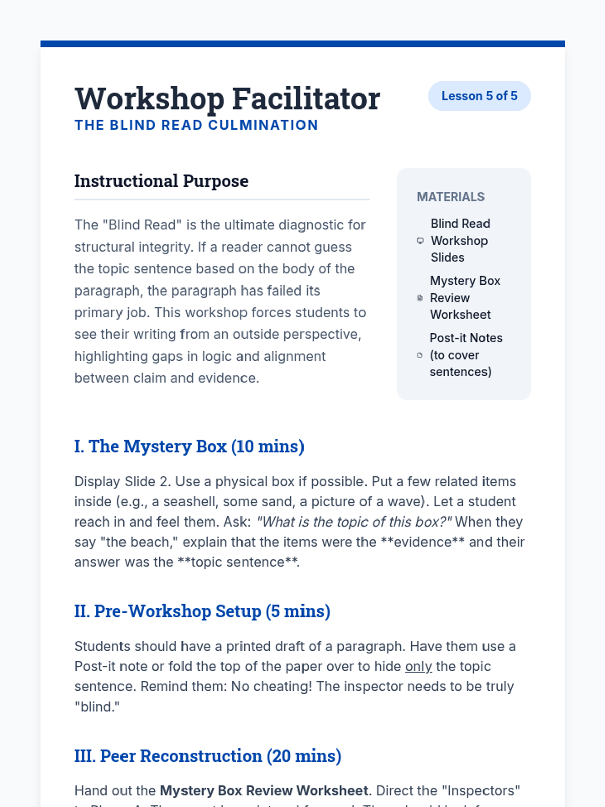 A foundational writer's workshop for ninth graders focused on the mechanics of crafting argumentative topic sentences that align with thesis statements, avoid plot summary, and maintain proper scope.