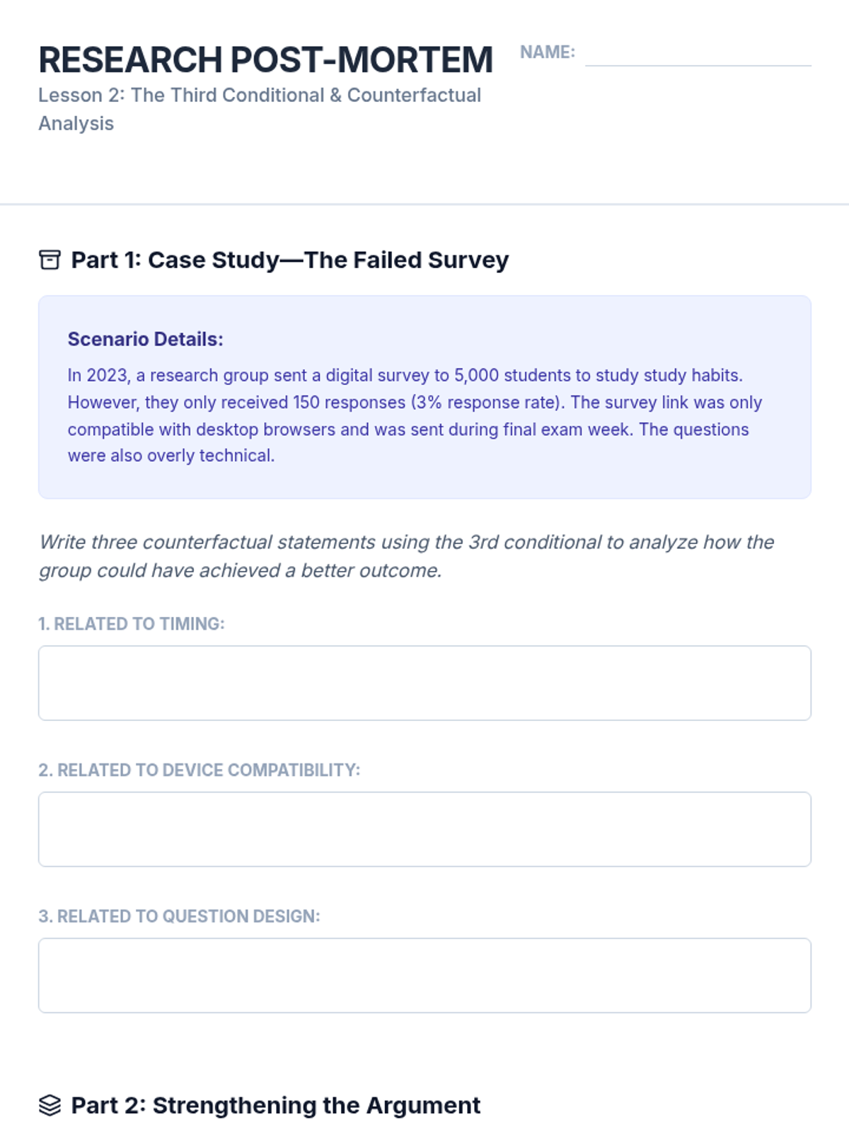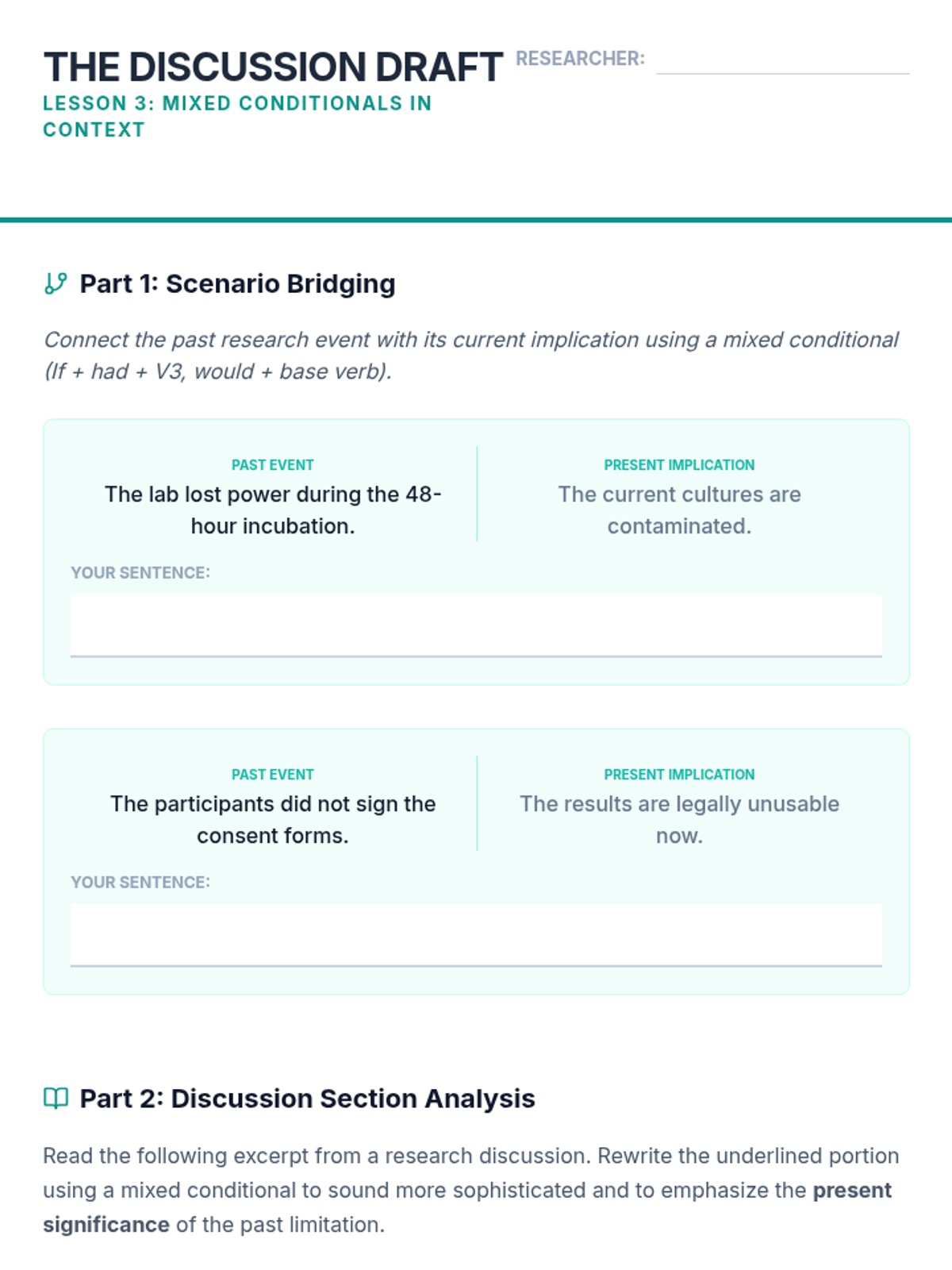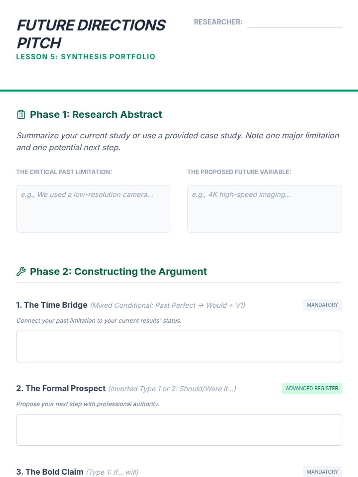 A sequence for graduate ESL students focusing on using complex conditional structures (0, 1, 2, 3, mixed, and inverted) to build academic arguments, analyze research limitations, and propose future studies. Students move from basic review to advanced stylistic inversions and synthesis in a 'Future Directions' research context.