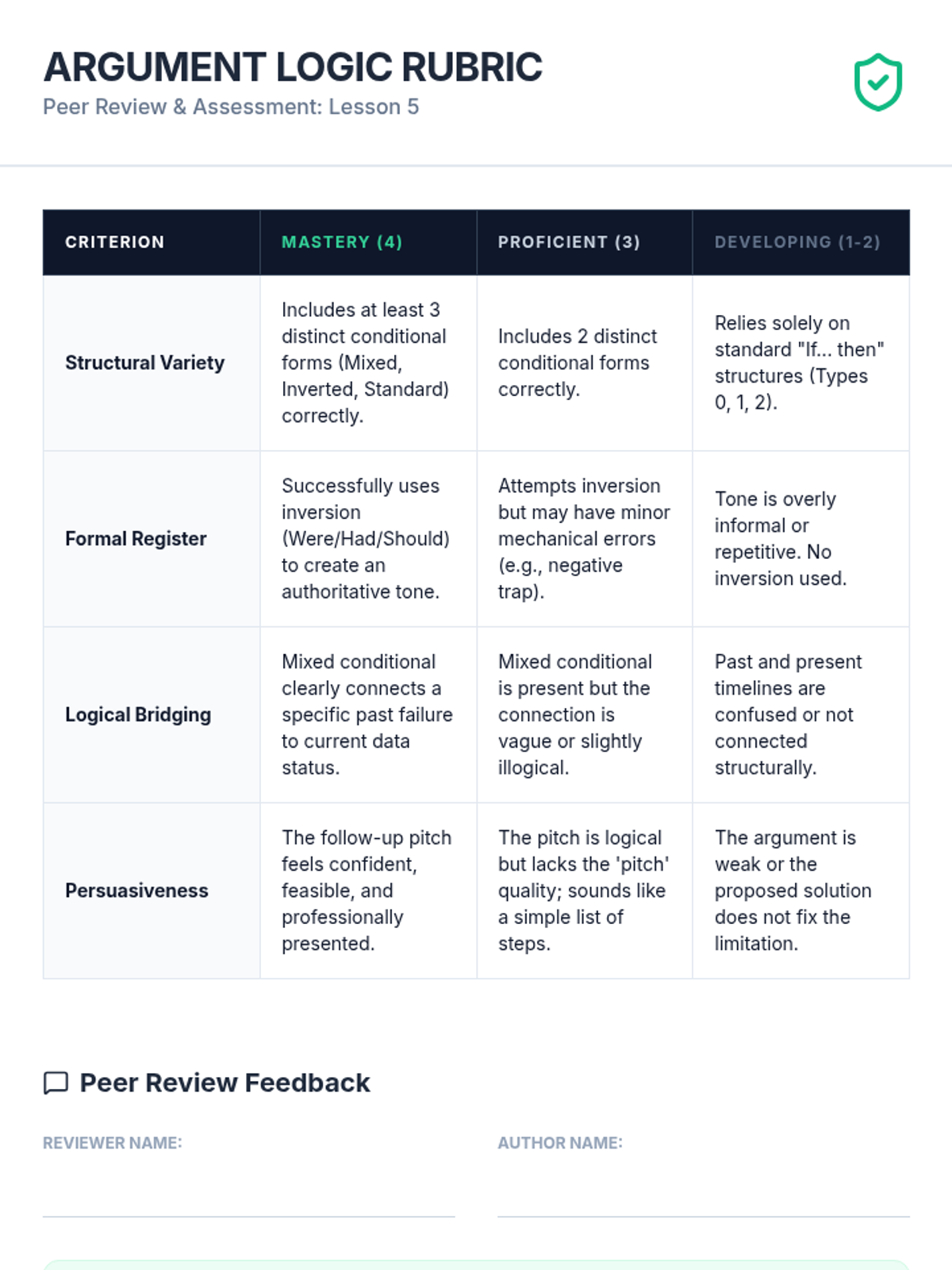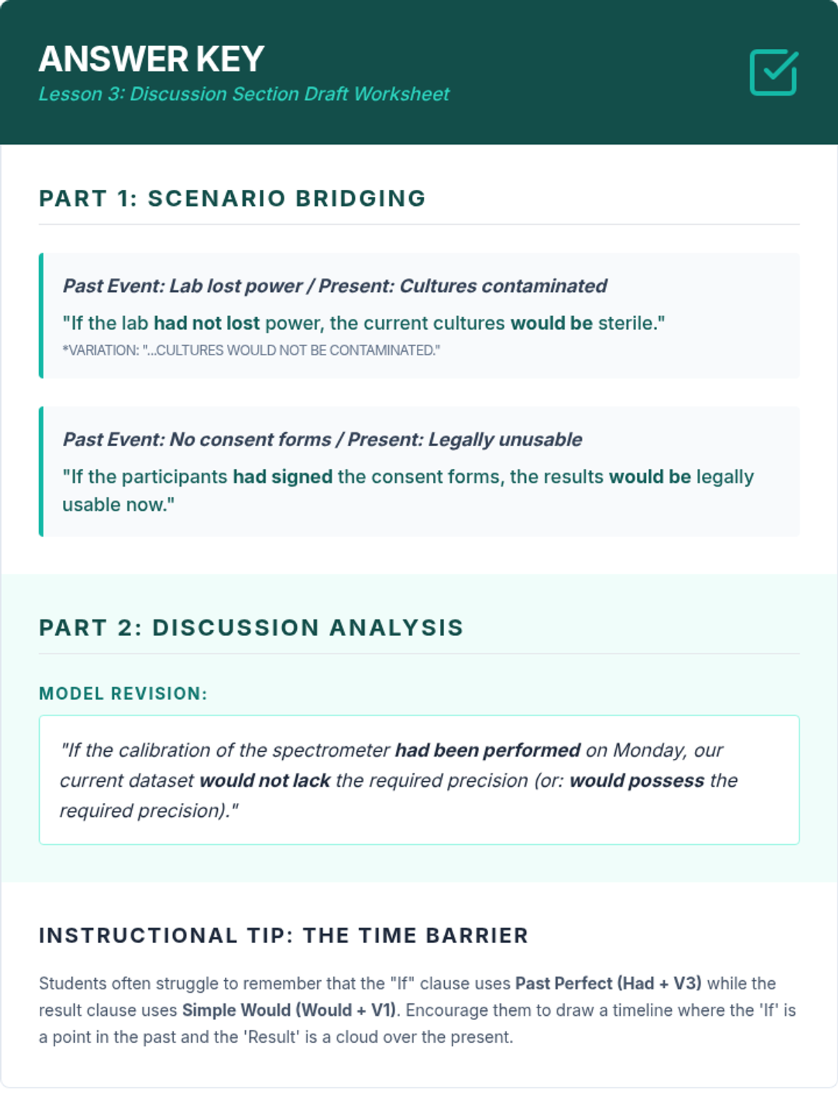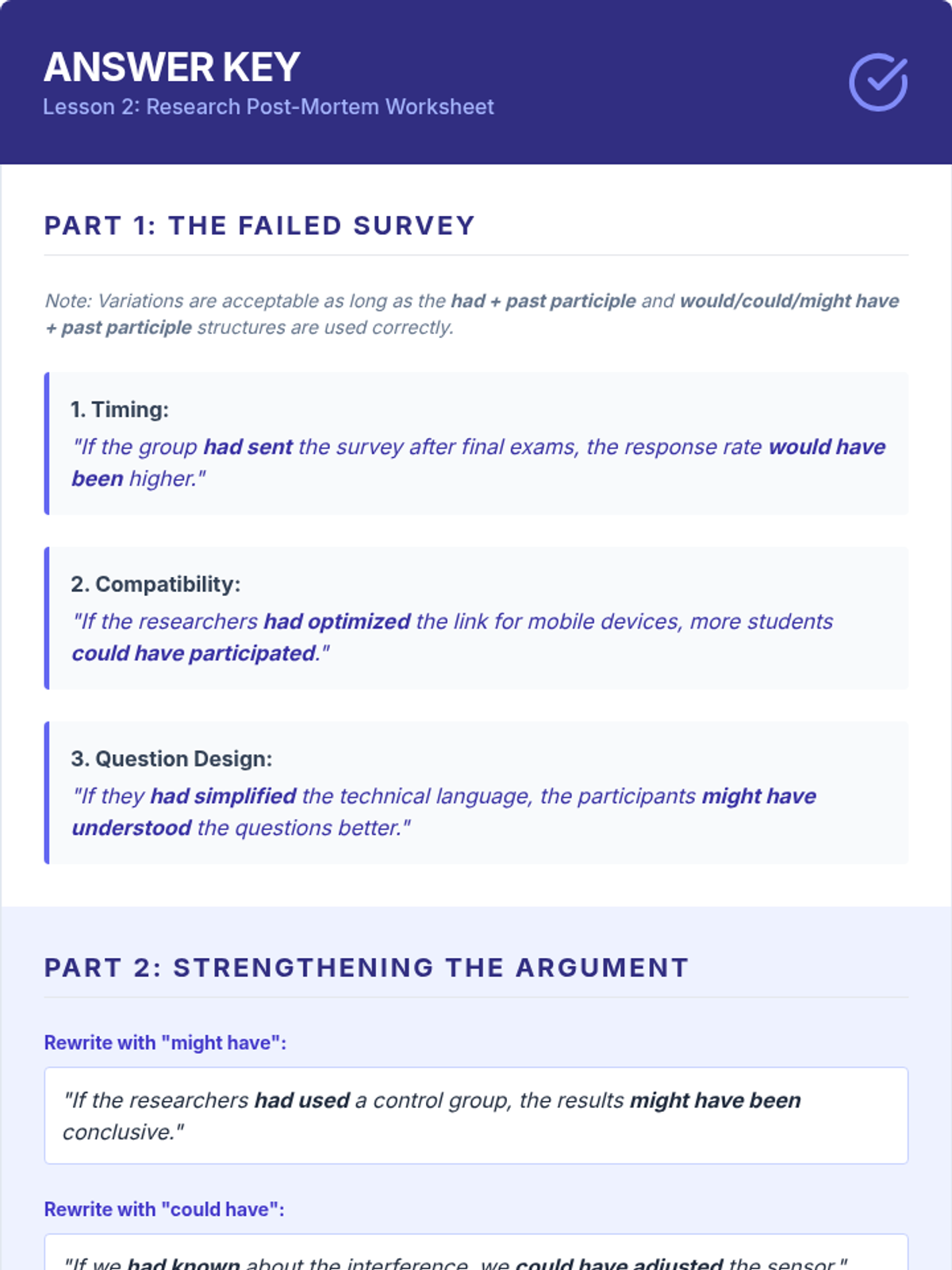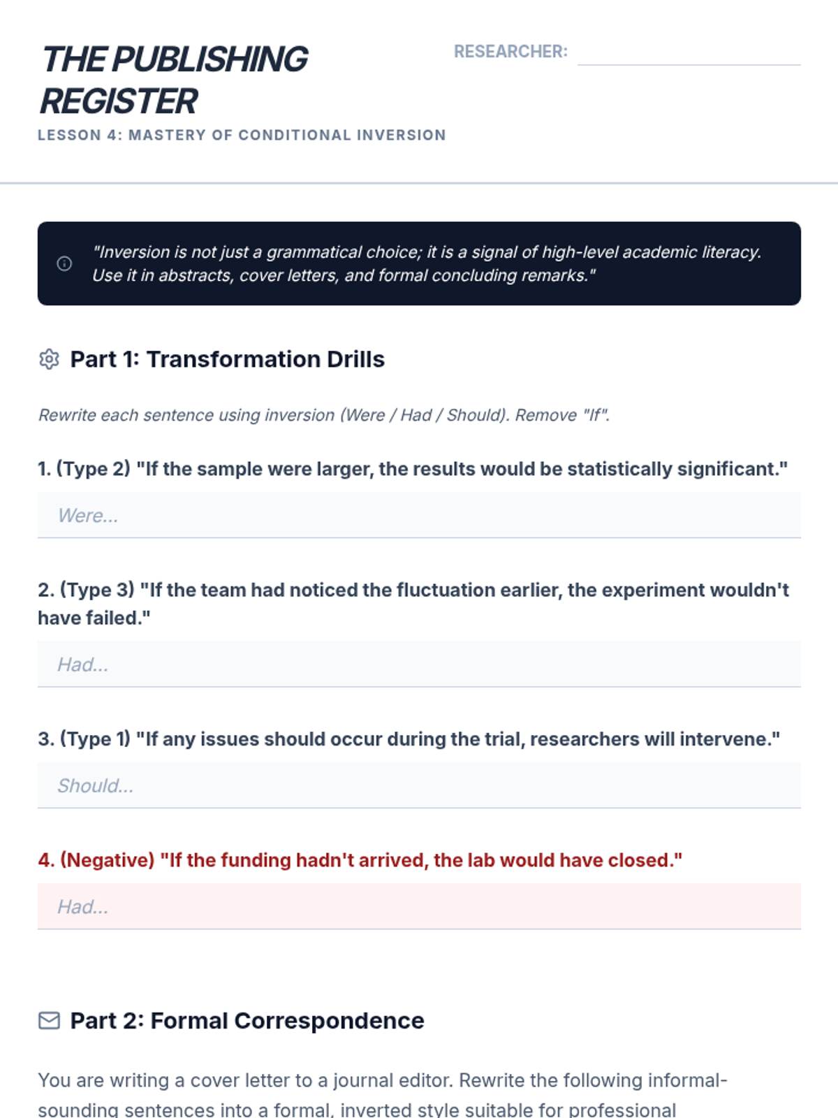 A sequence for graduate ESL students focusing on using complex conditional structures (0, 1, 2, 3, mixed, and inverted) to build academic arguments, analyze research limitations, and propose future studies. Students move from basic review to advanced stylistic inversions and synthesis in a 'Future Directions' research context.