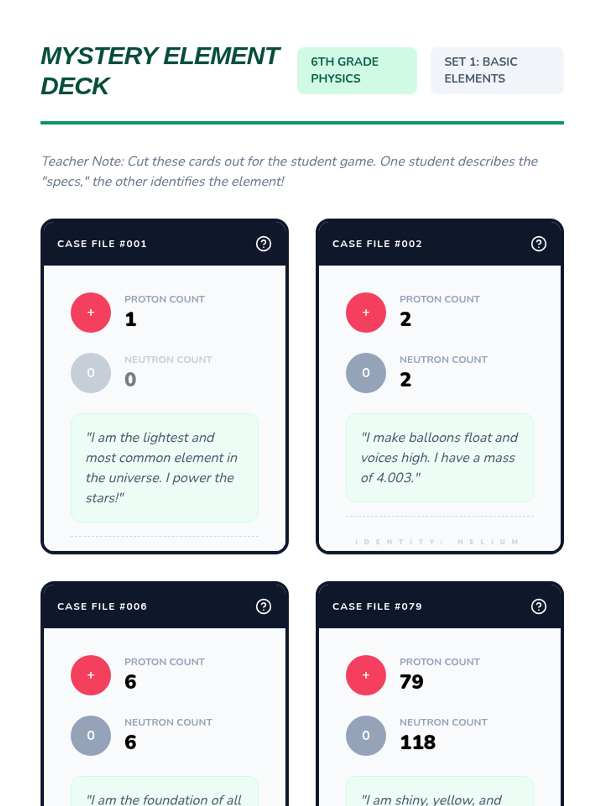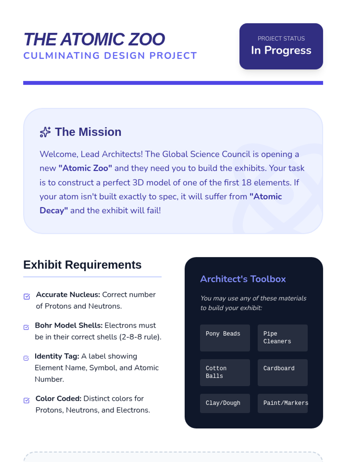This sequence introduces 6th-grade students to atomic structure, focusing on subatomic particles, atomic number, isotopes, and electron shells. Students progress from identifying fundamental particles to constructing complex Bohr models for the first eighteen elements of the periodic table.