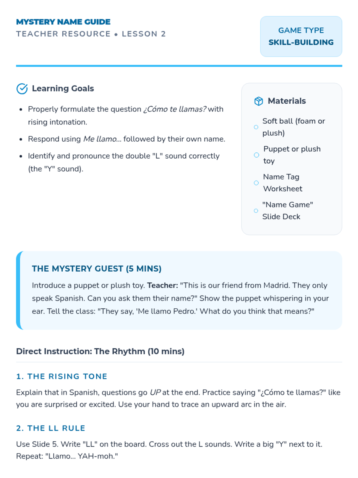 This sequence introduces 4th-grade students to foundational Spanish greetings, introductions, and polite expressions. Through interactive games, role-plays, and pronunciation practice, students build the confidence to conduct basic introductory dialogues in Spanish.