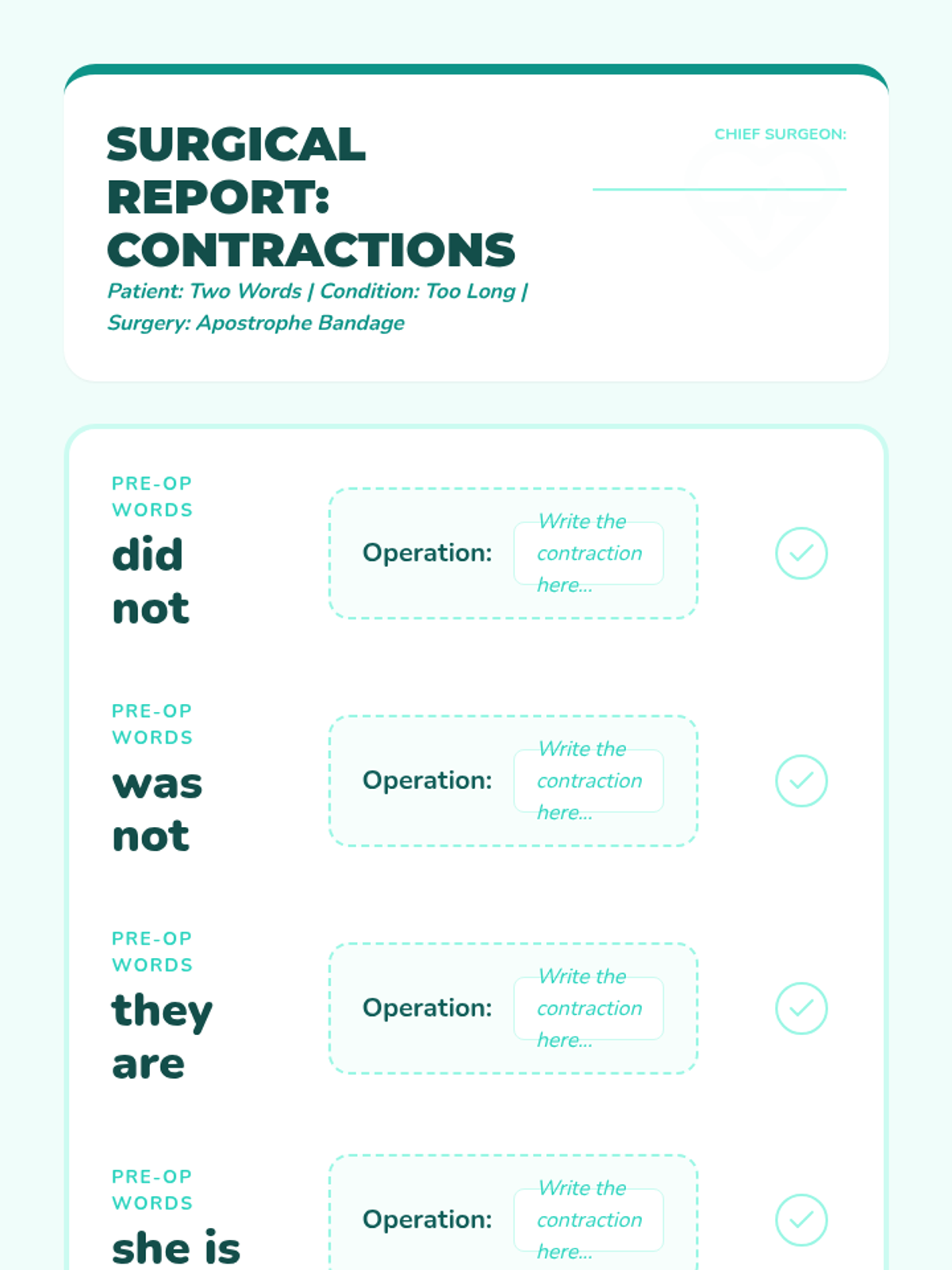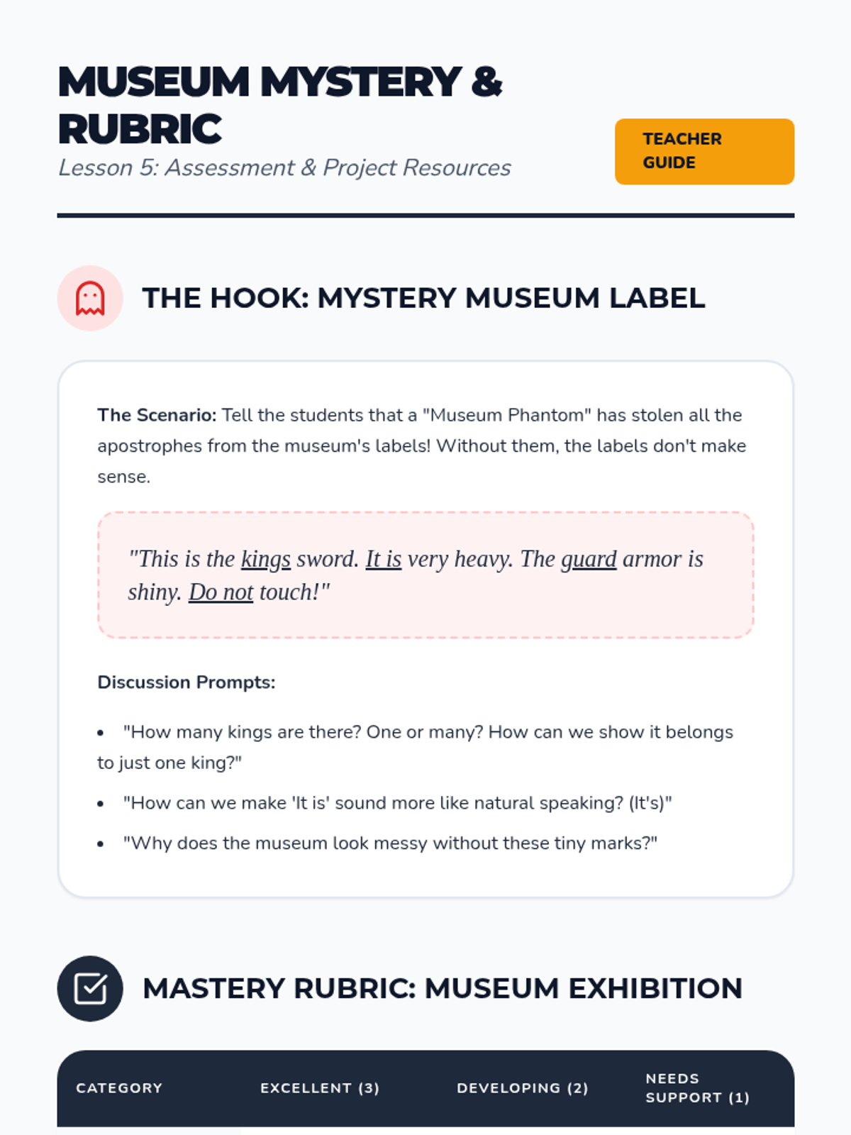 A 2nd-grade grammar sequence exploring the dual roles of the apostrophe in possessives and contractions through a 'Word Surgery' and 'Museum of Belonging' theme. Students practice forming singular possessives, distinguishing them from plurals, and physically 'operating' on word pairs to create contractions.