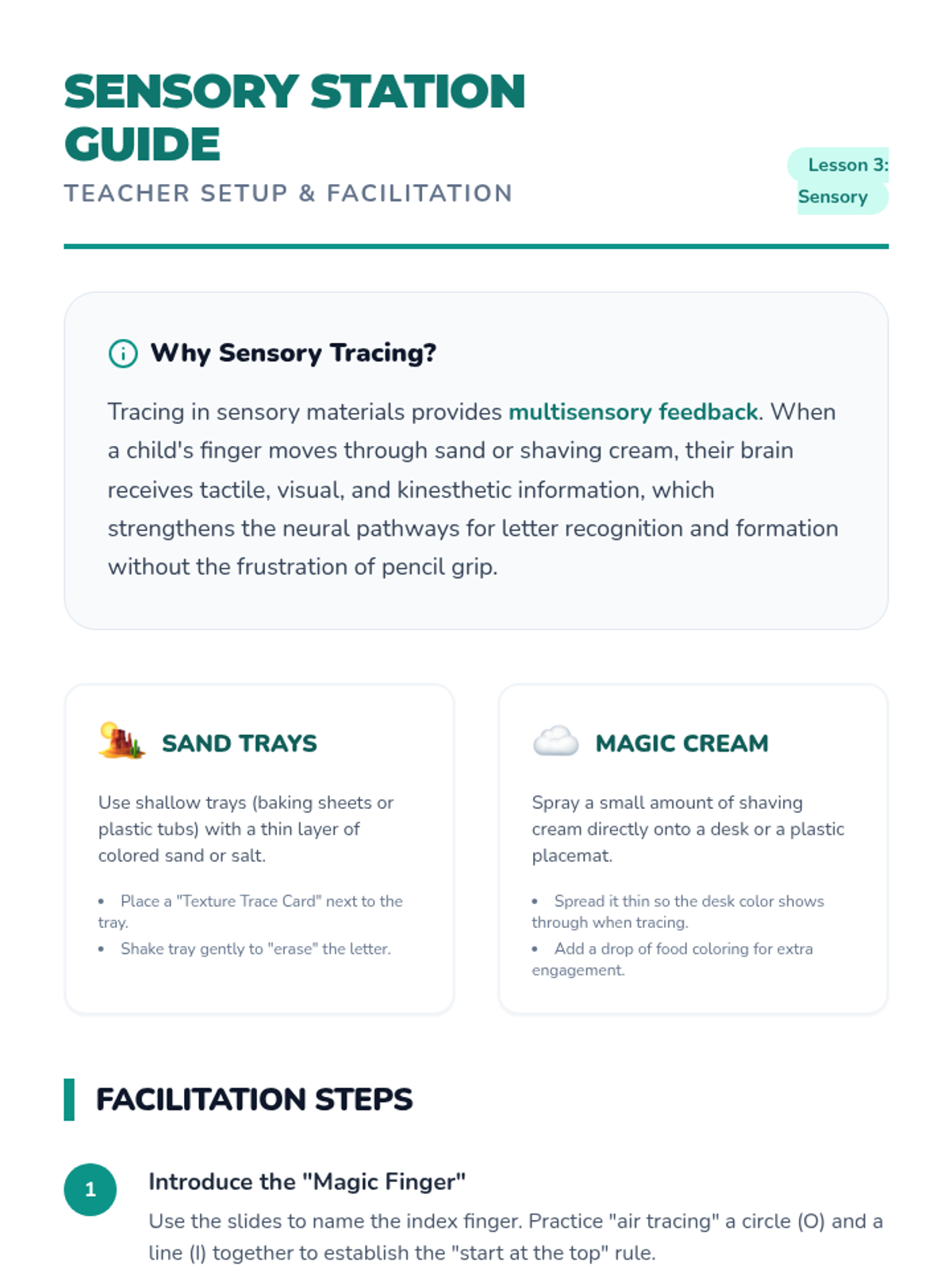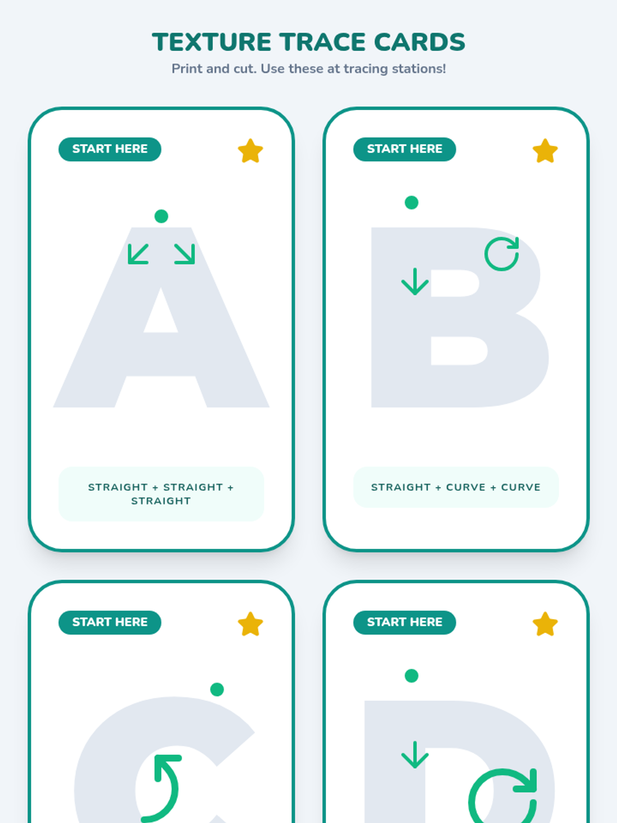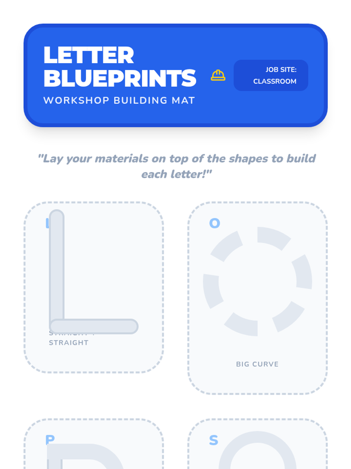 A foundational Pre-K sequence that introduces students to letterforms by exploring straight lines and curves through tactile, sensory, and kinesthetic activities. Students build, trace, and move to recognize letters before searching for them in real-world print.
