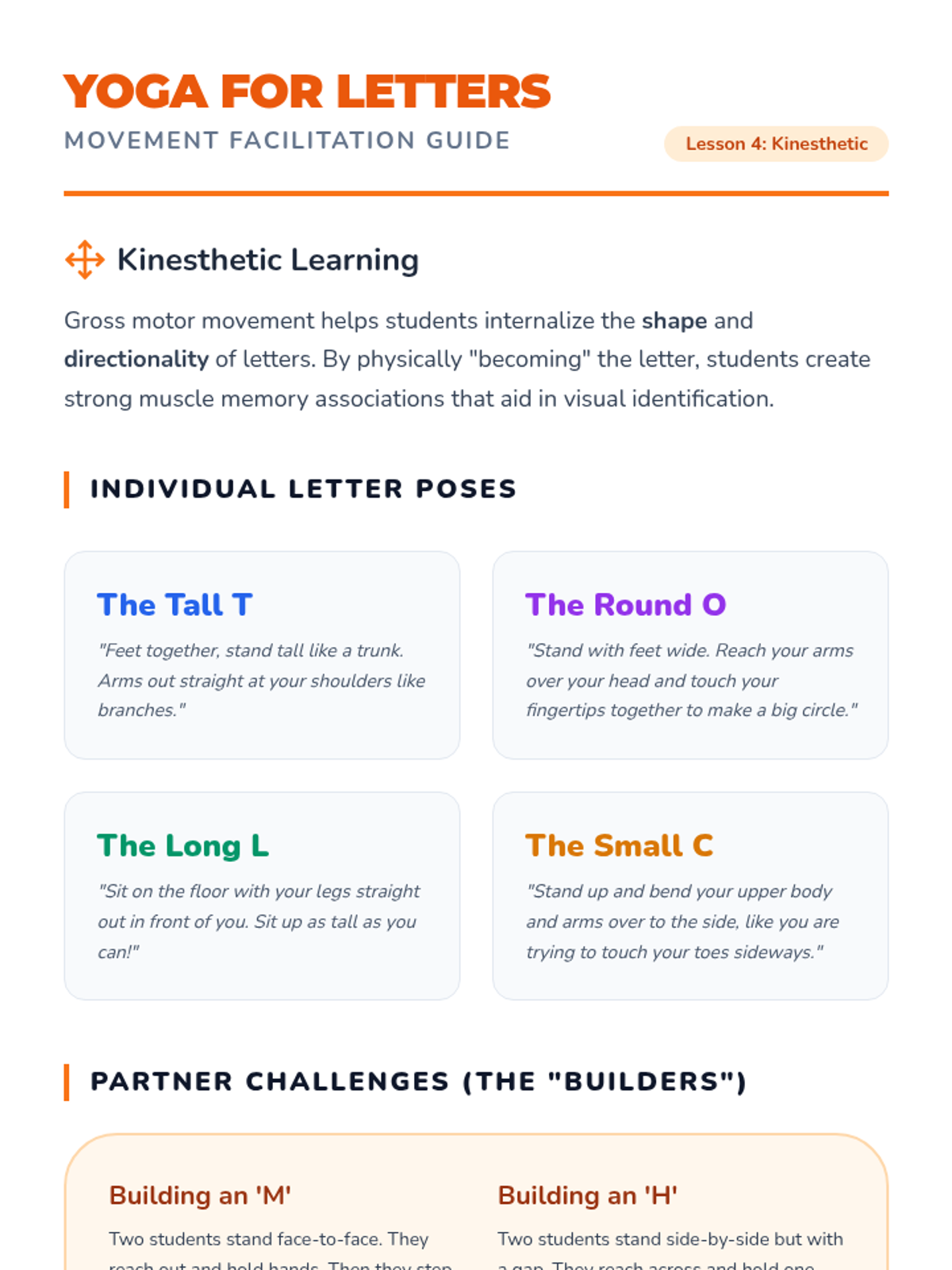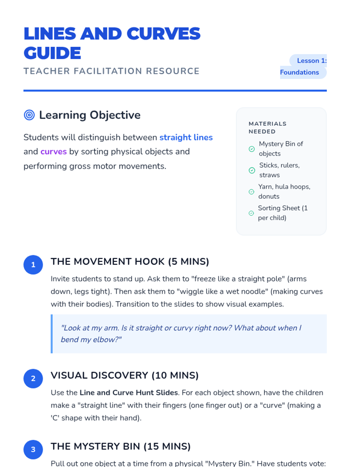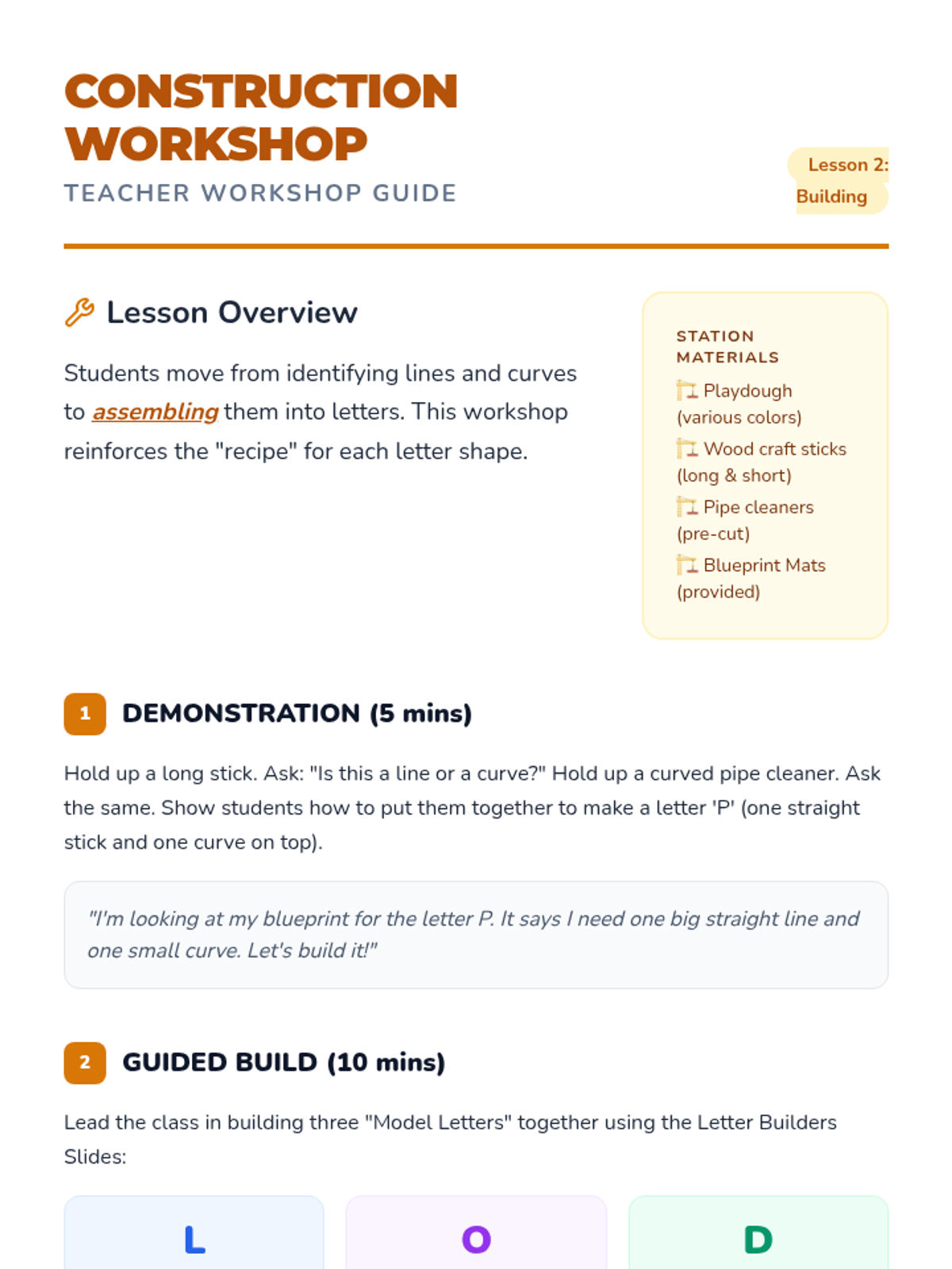 A foundational Pre-K sequence that introduces students to letterforms by exploring straight lines and curves through tactile, sensory, and kinesthetic activities. Students build, trace, and move to recognize letters before searching for them in real-world print.