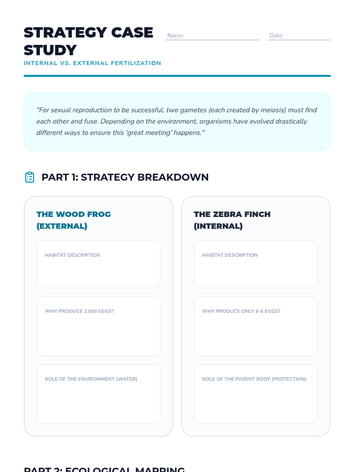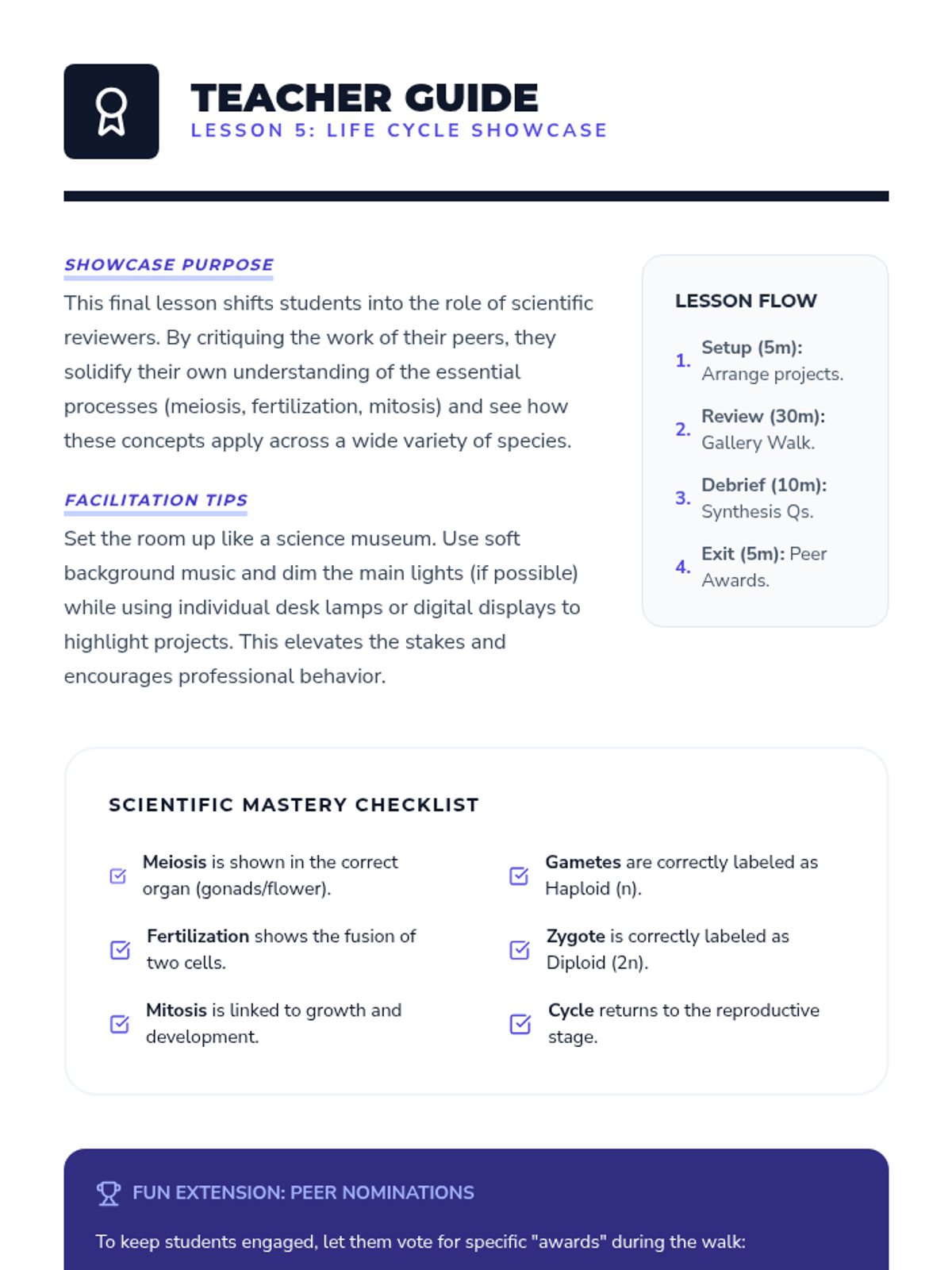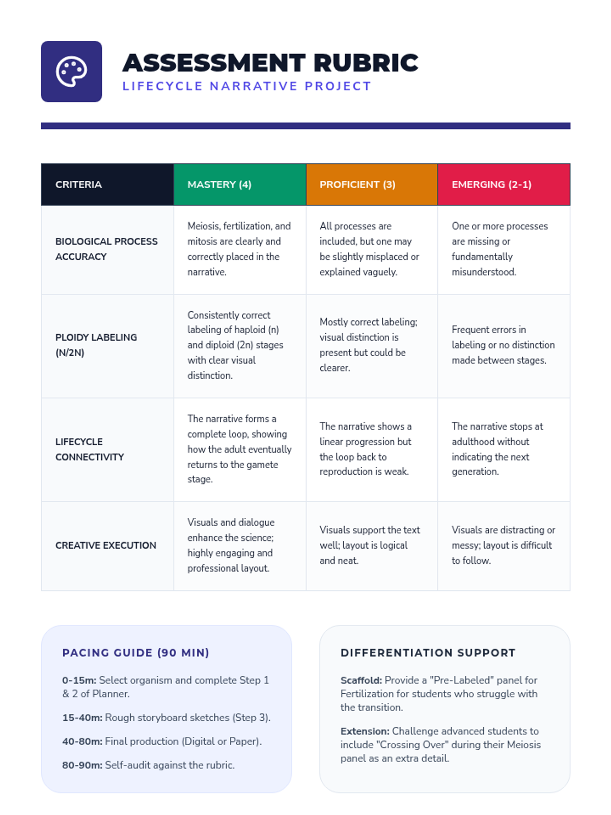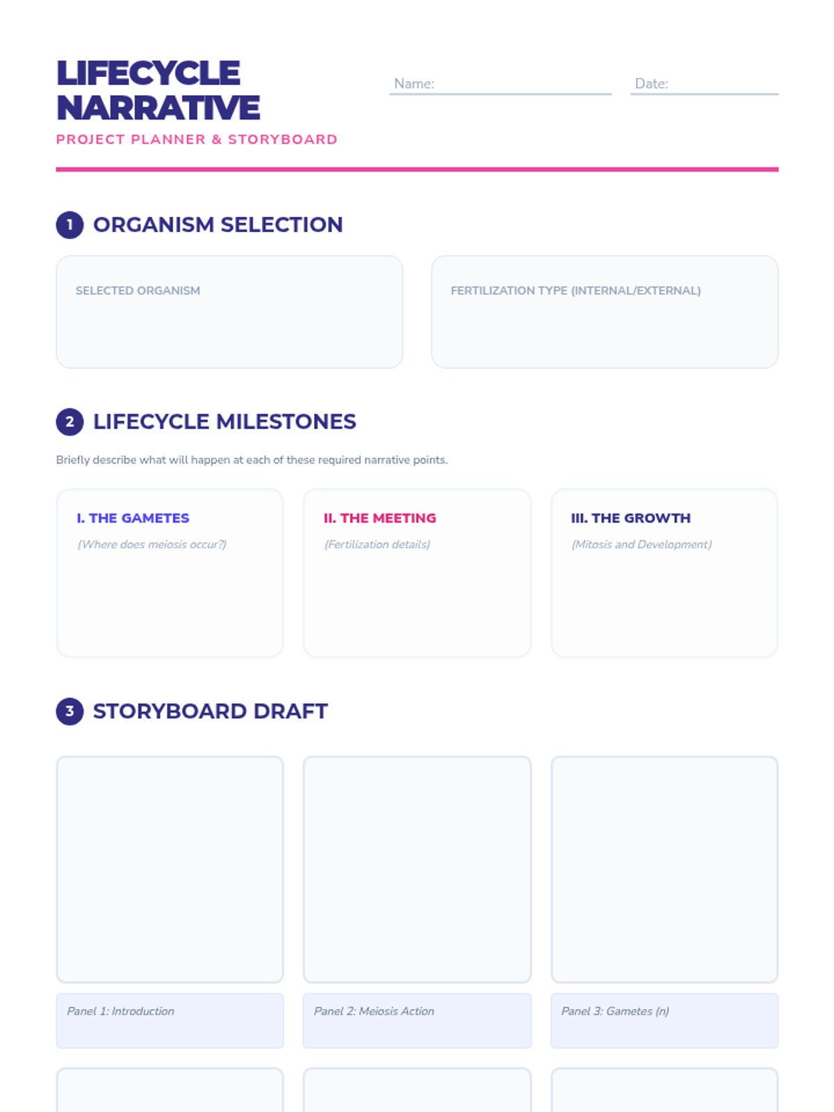Students explore the full journey from gamete formation to a mature organism, integrating concepts of meiosis, fertilization, and mitosis to construct visual narratives of life cycles.