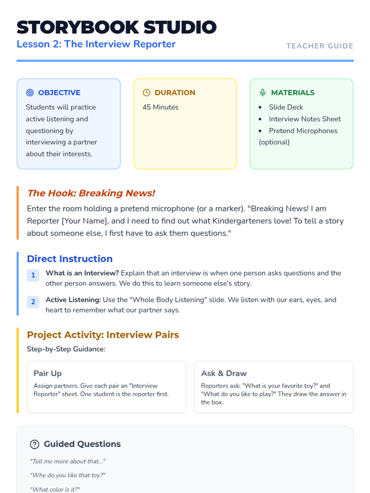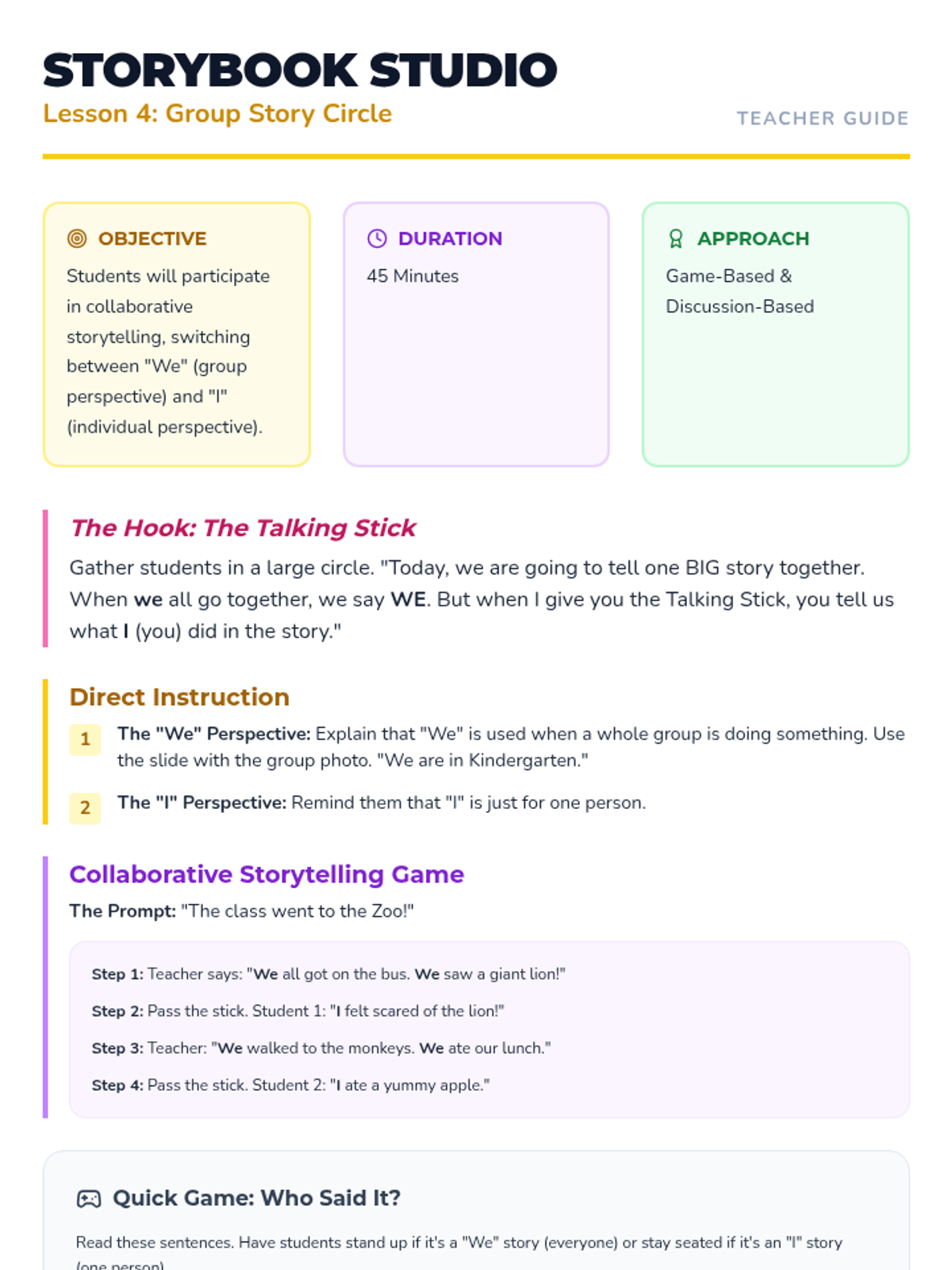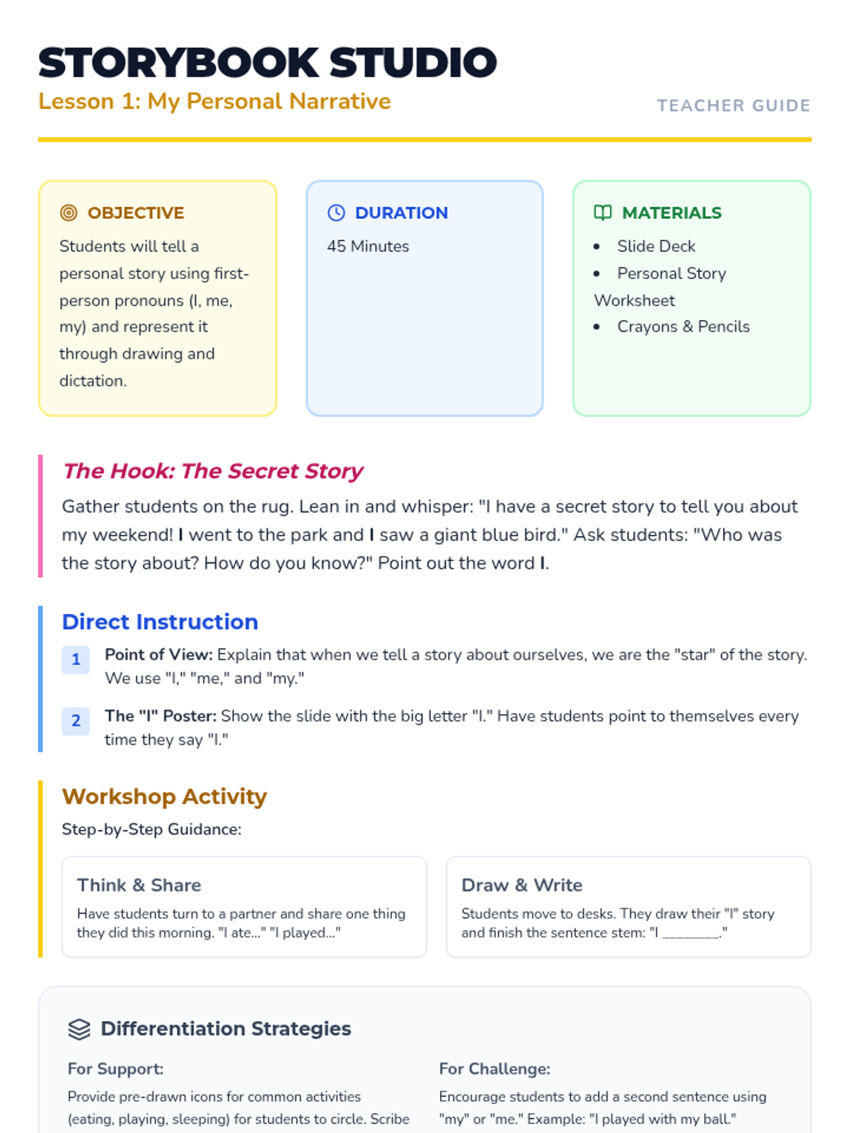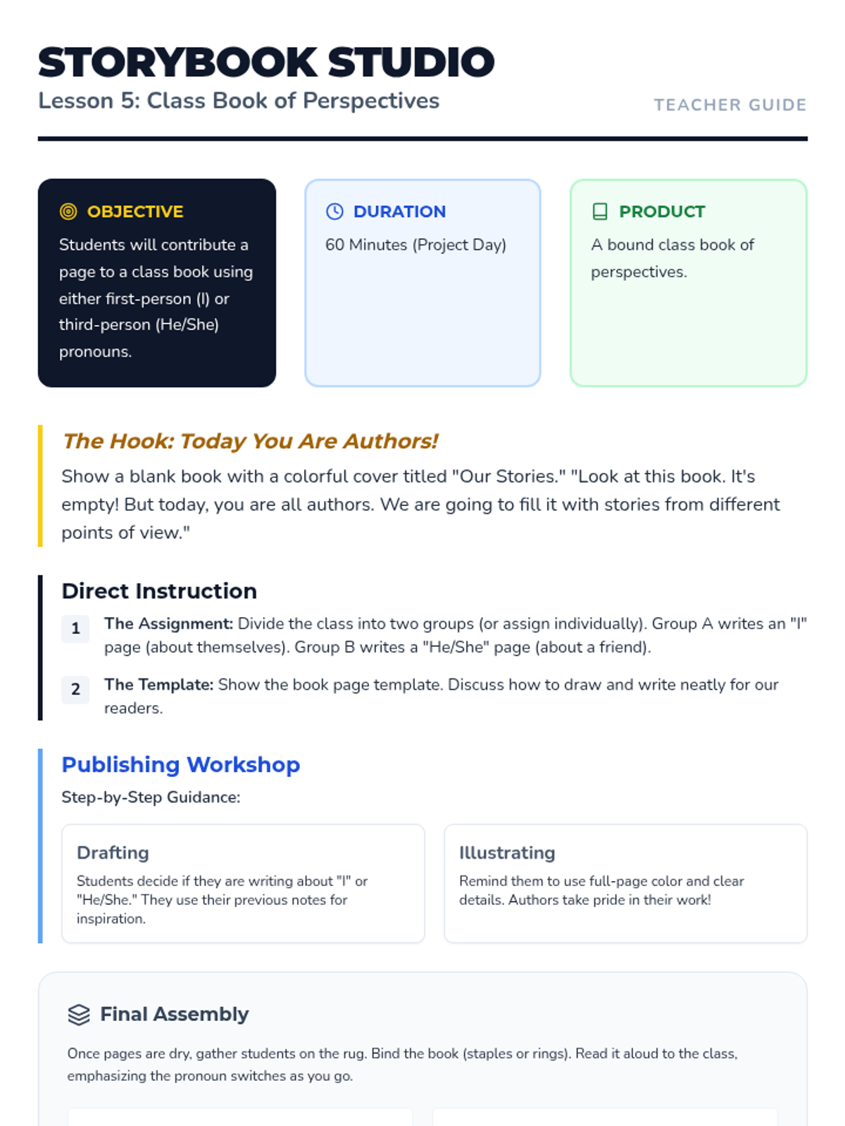 A Kindergarten ELA sequence focused on point of view, helping students distinguish between first-person ('I') and third-person ('He/She') through personal storytelling and peer interviews.