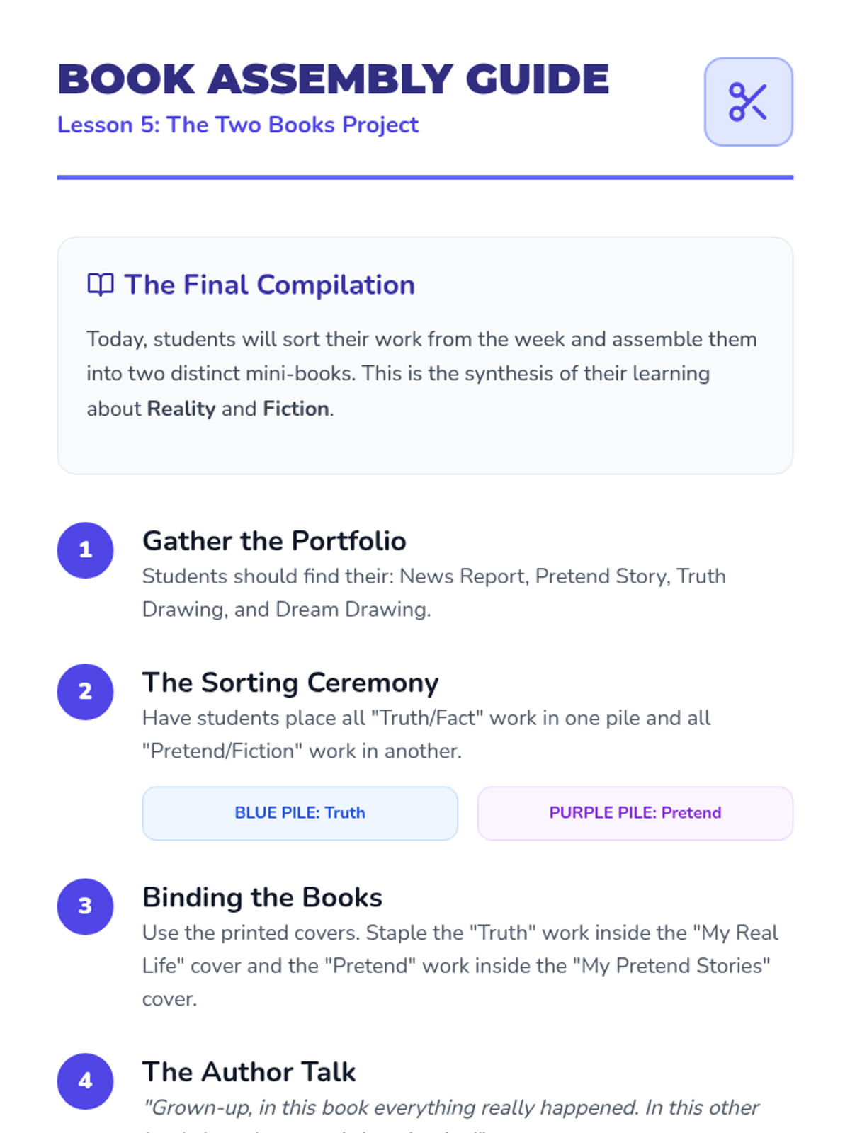 A project-based unit for Pre-K students to explore the difference between reality and fiction by creating their own stories based on personal experiences and creative imagination. Students transition from reporting real-life events to spinning imaginative tales, culminating in the creation of two personal mini-books.