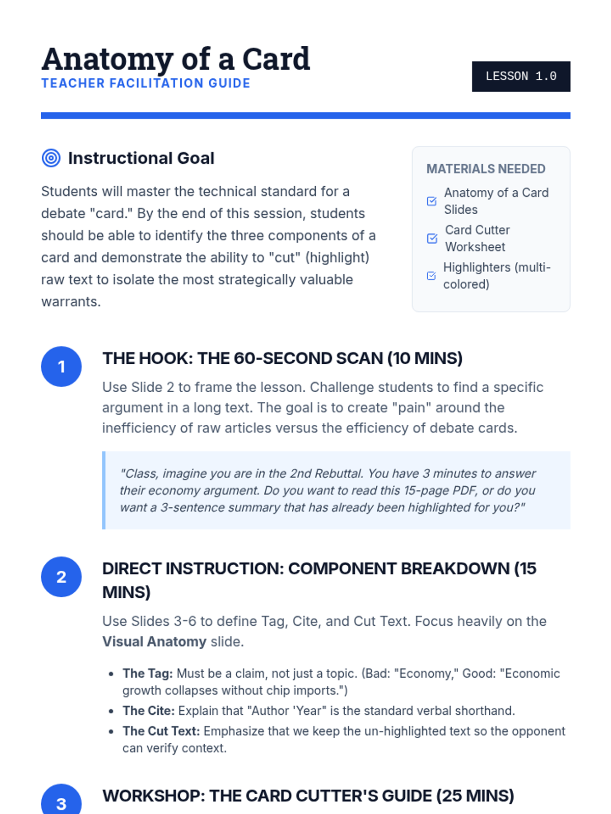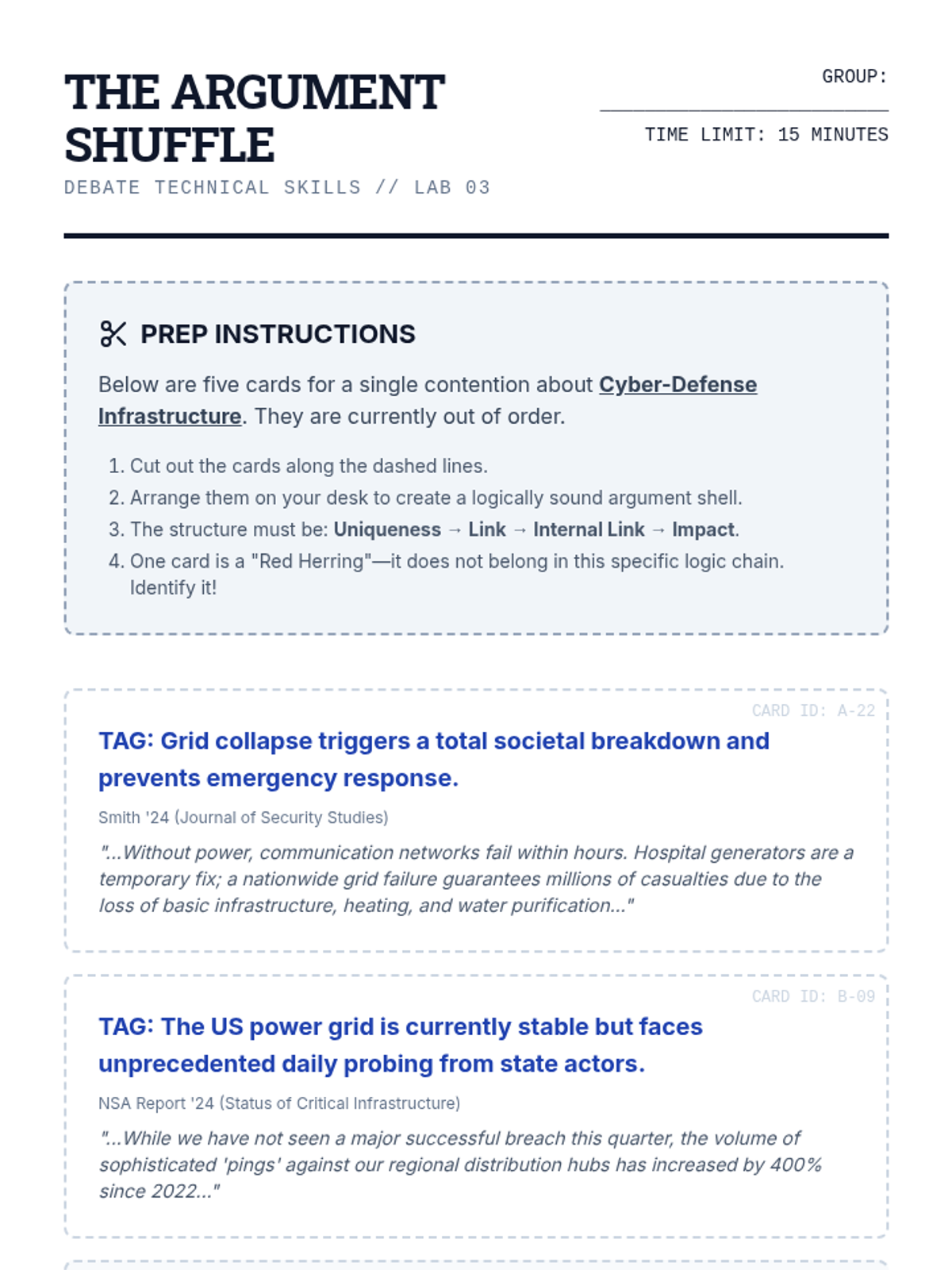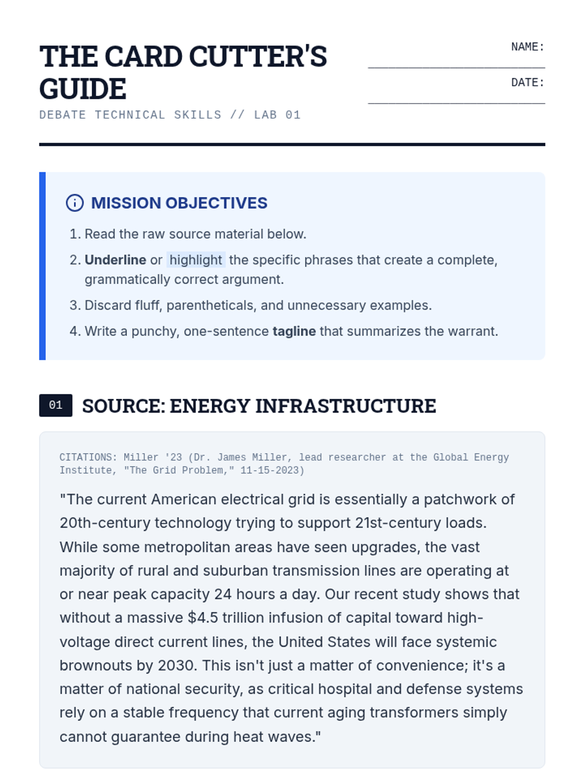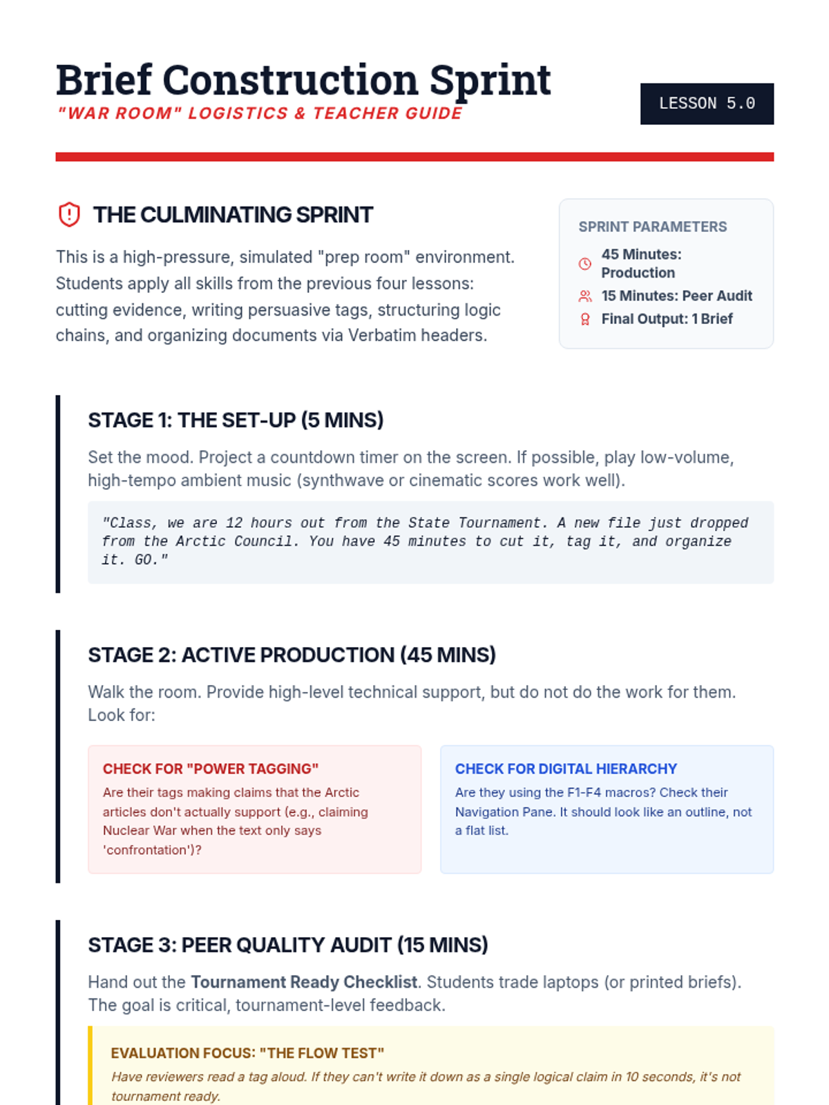 A project-based sequence for 12th-grade debate students focusing on the technical skills of evidence extraction, tagline writing, logical structuring, and digital organization to create tournament-ready debate briefs.