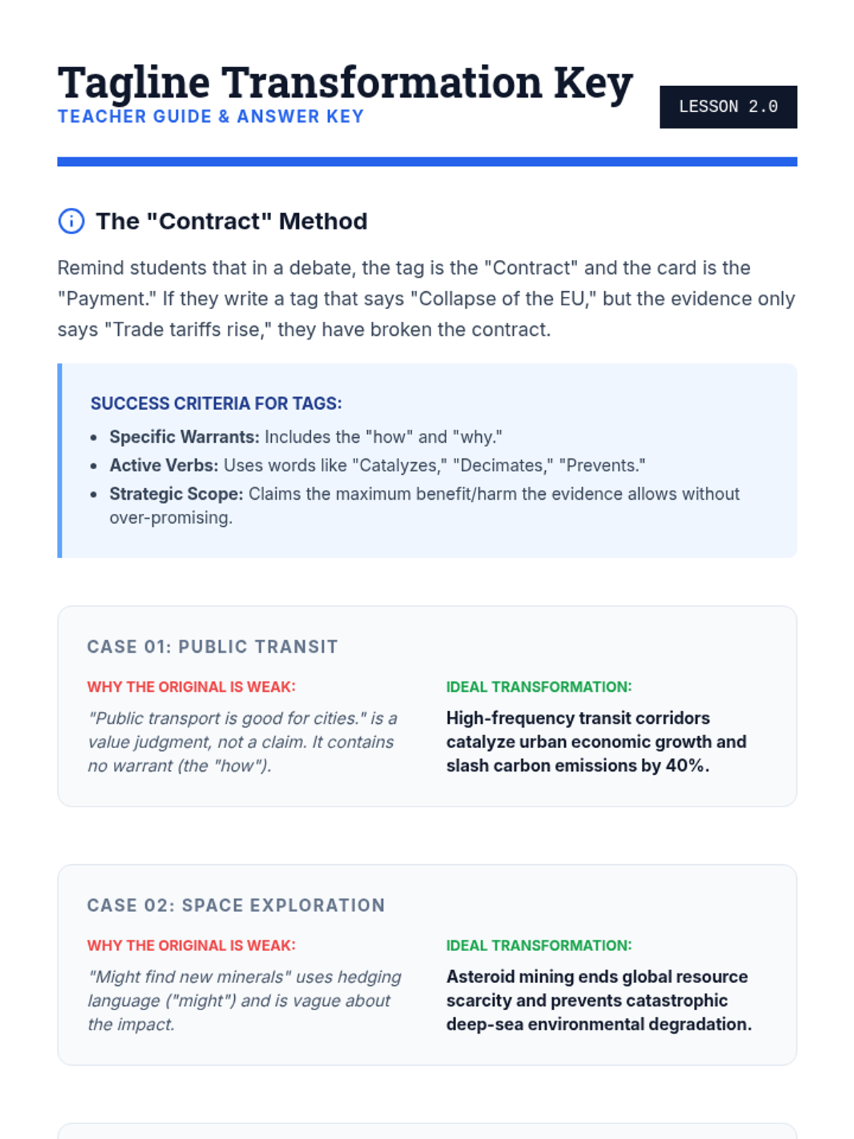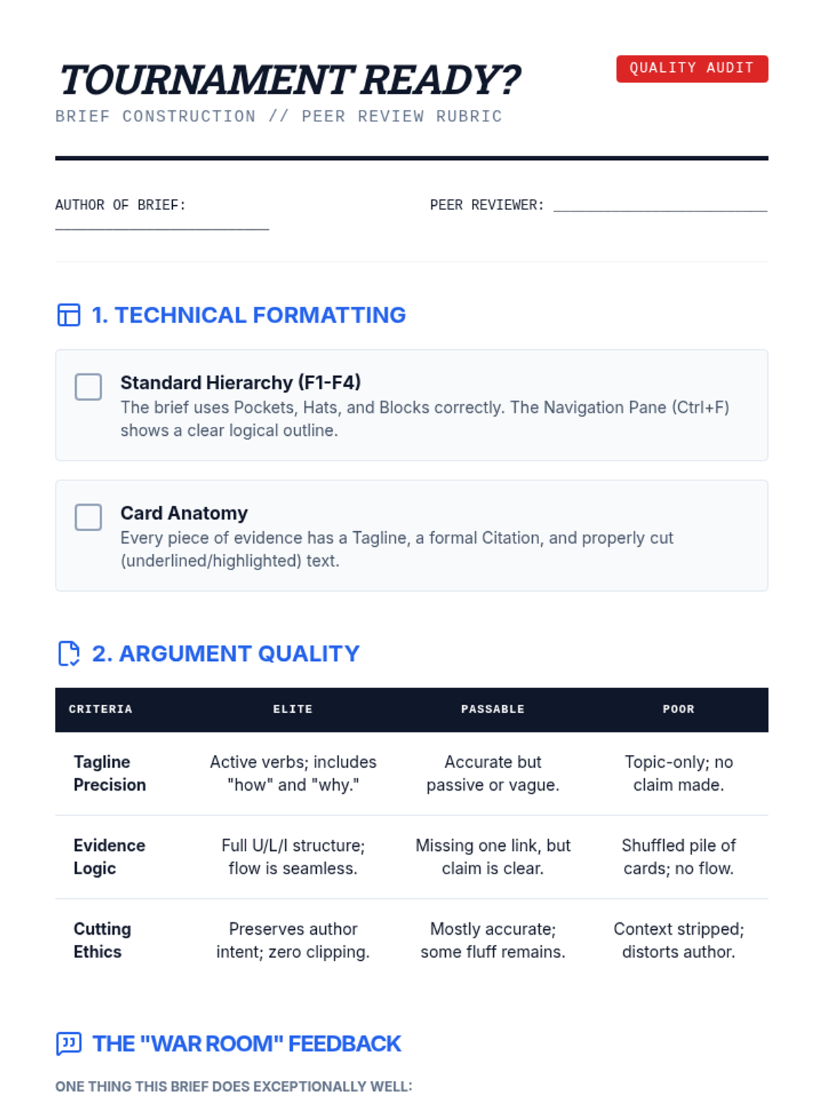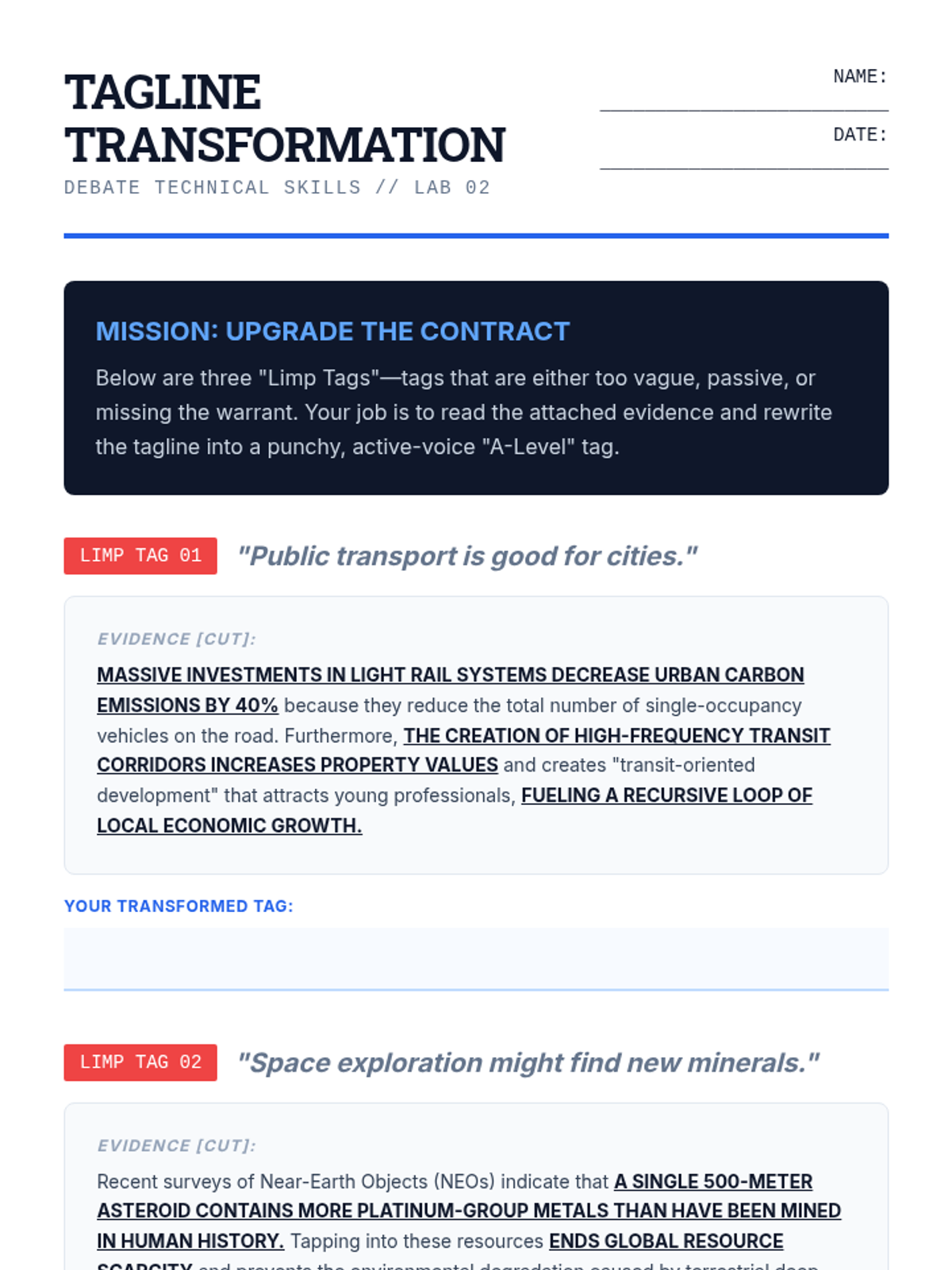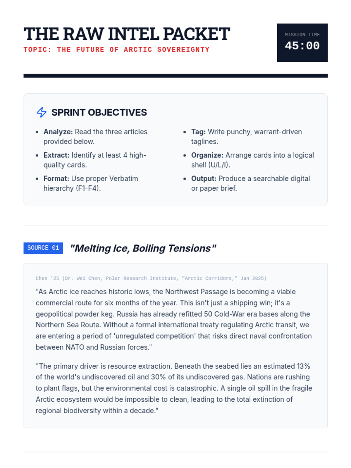 A project-based sequence for 12th-grade debate students focusing on the technical skills of evidence extraction, tagline writing, logical structuring, and digital organization to create tournament-ready debate briefs.