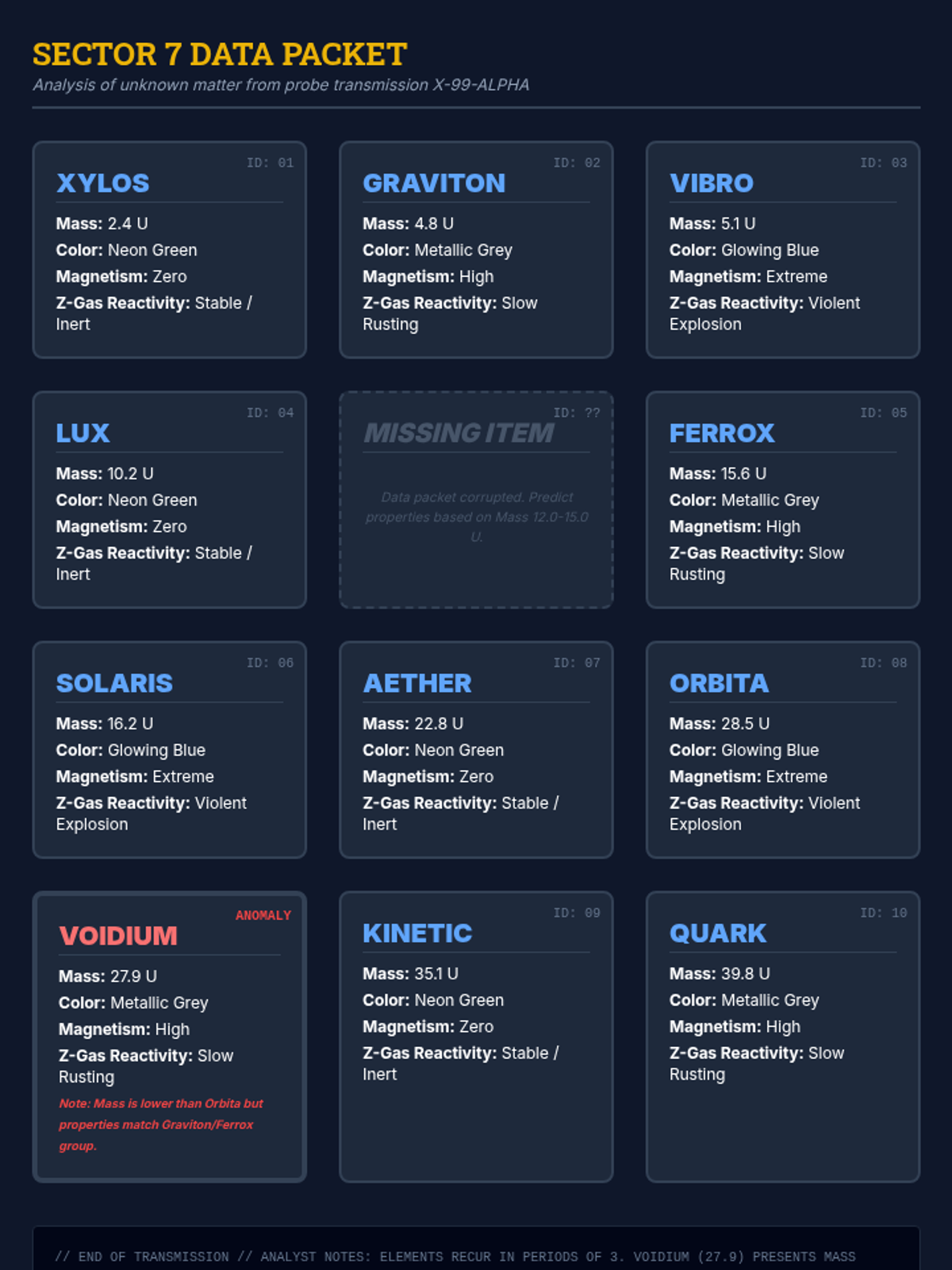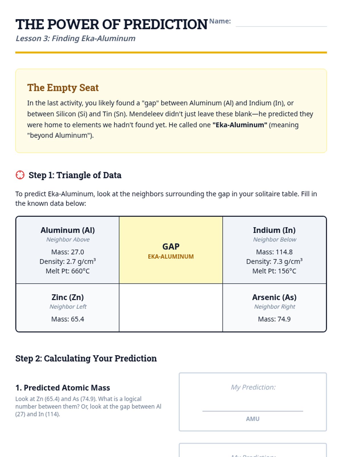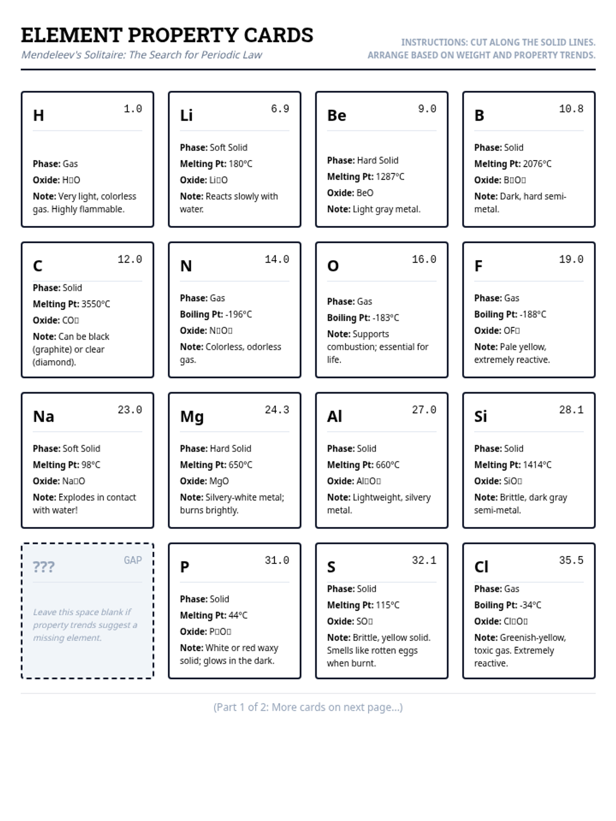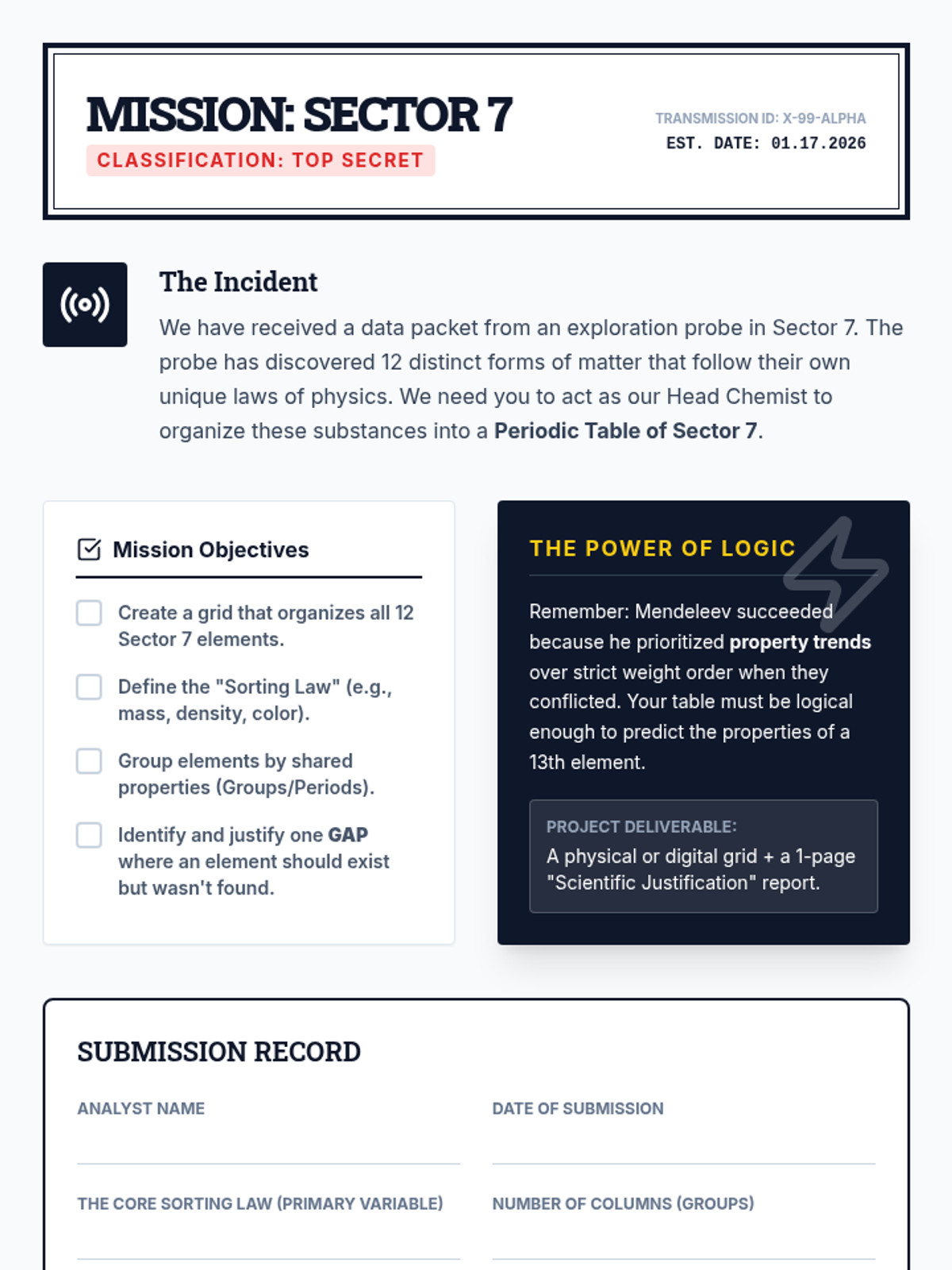 A 10th-grade physics sequence that treats the Periodic Table as a logic puzzle. Students reconstruct the table's history, moving from atomic mass patterns to the modern atomic number organization through inquiry and prediction.