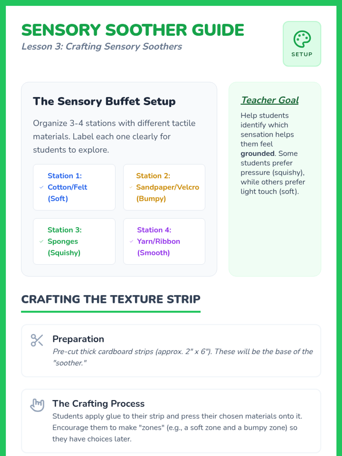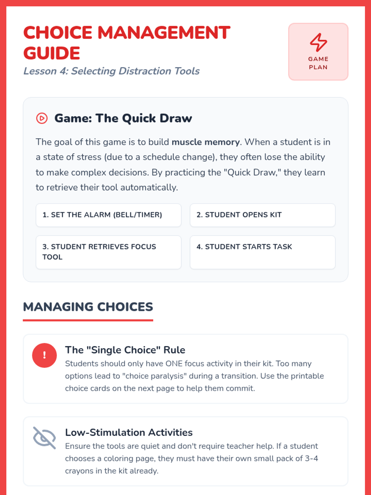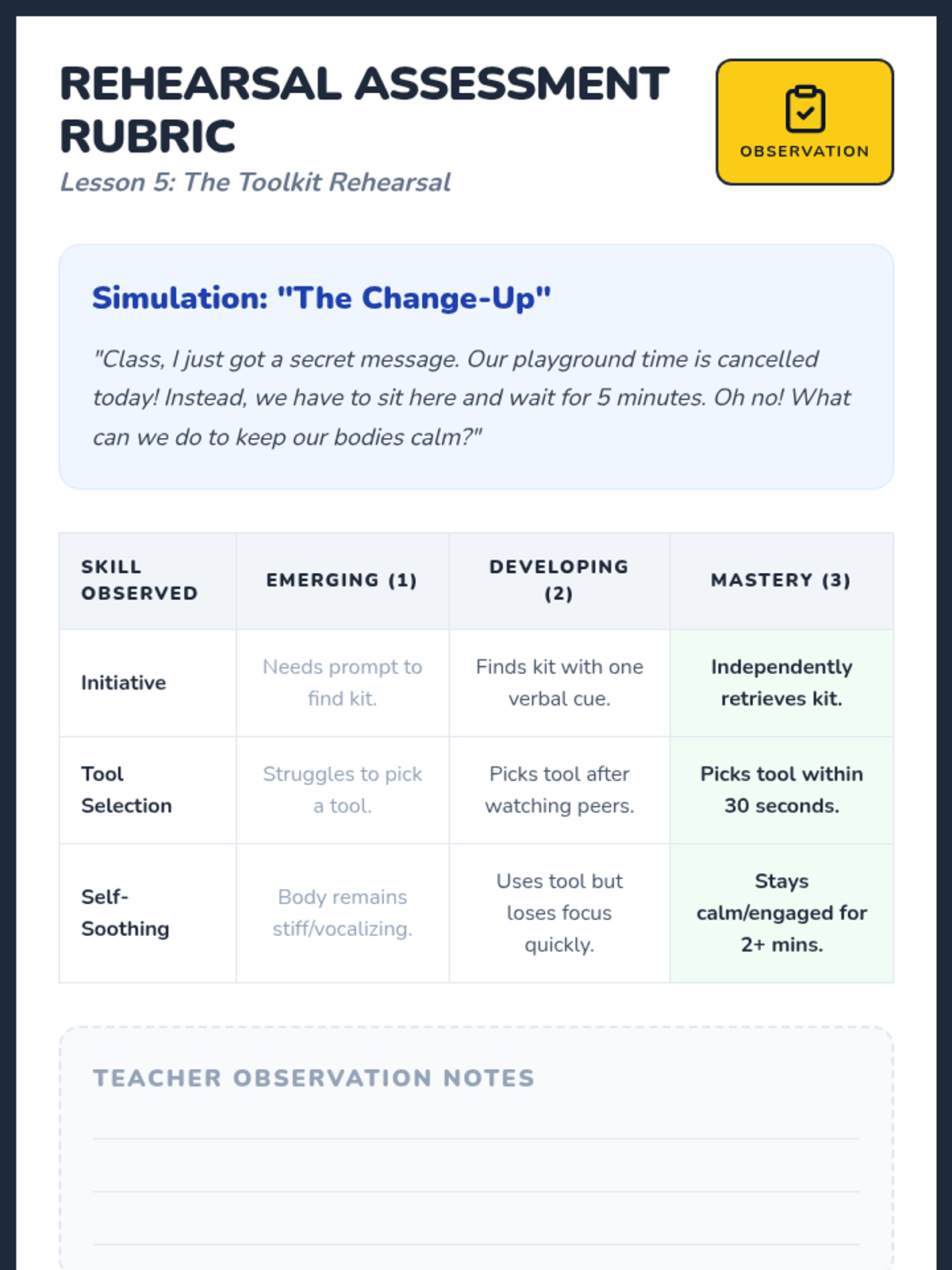 A hands-on sequence for Kindergarten students to create a personal 'Adaptability Toolkit' to manage stress during schedule changes. Students build concrete tools and practice using them in simulated scenarios.