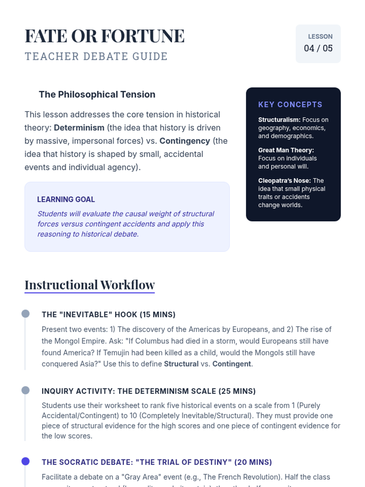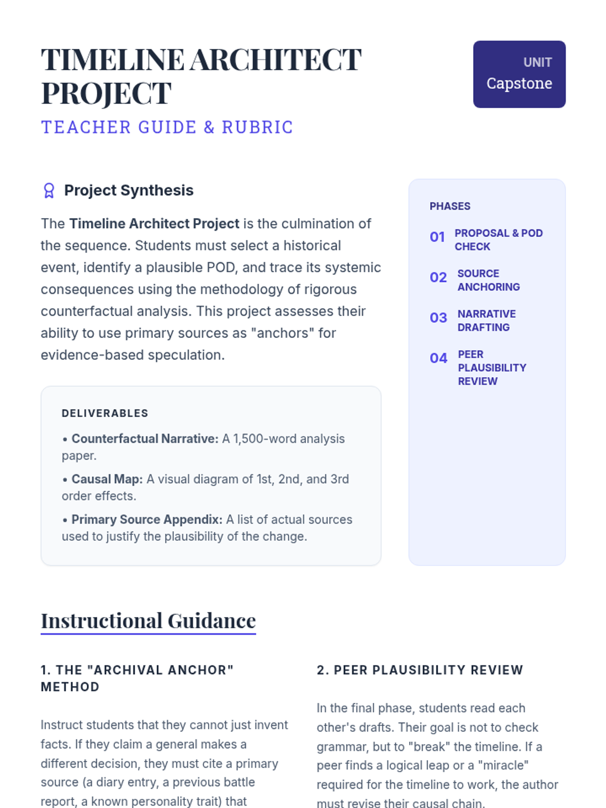 This sequence explores the methodology of historical counterfactuals ('What If?' history) as a tool for analyzing causation, contingency, and determinism. Students move from theoretical understanding to constructing evidence-based alternate timelines.