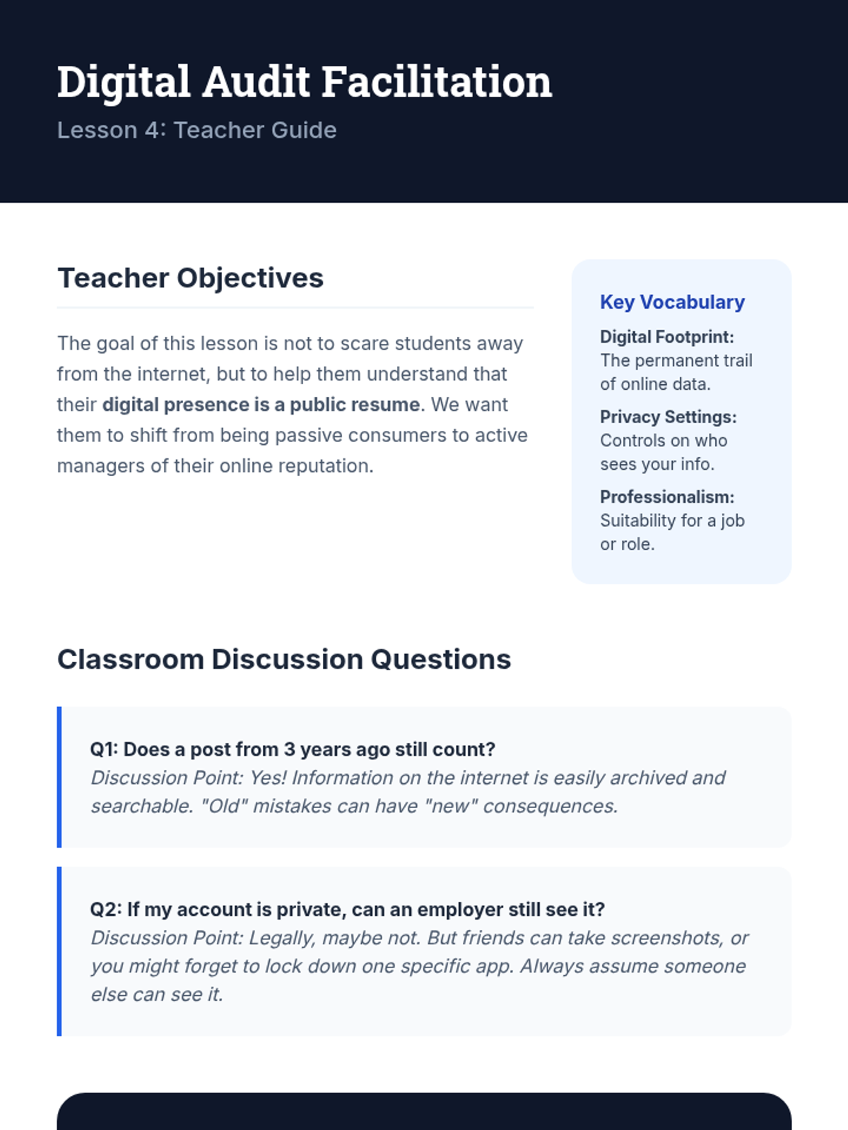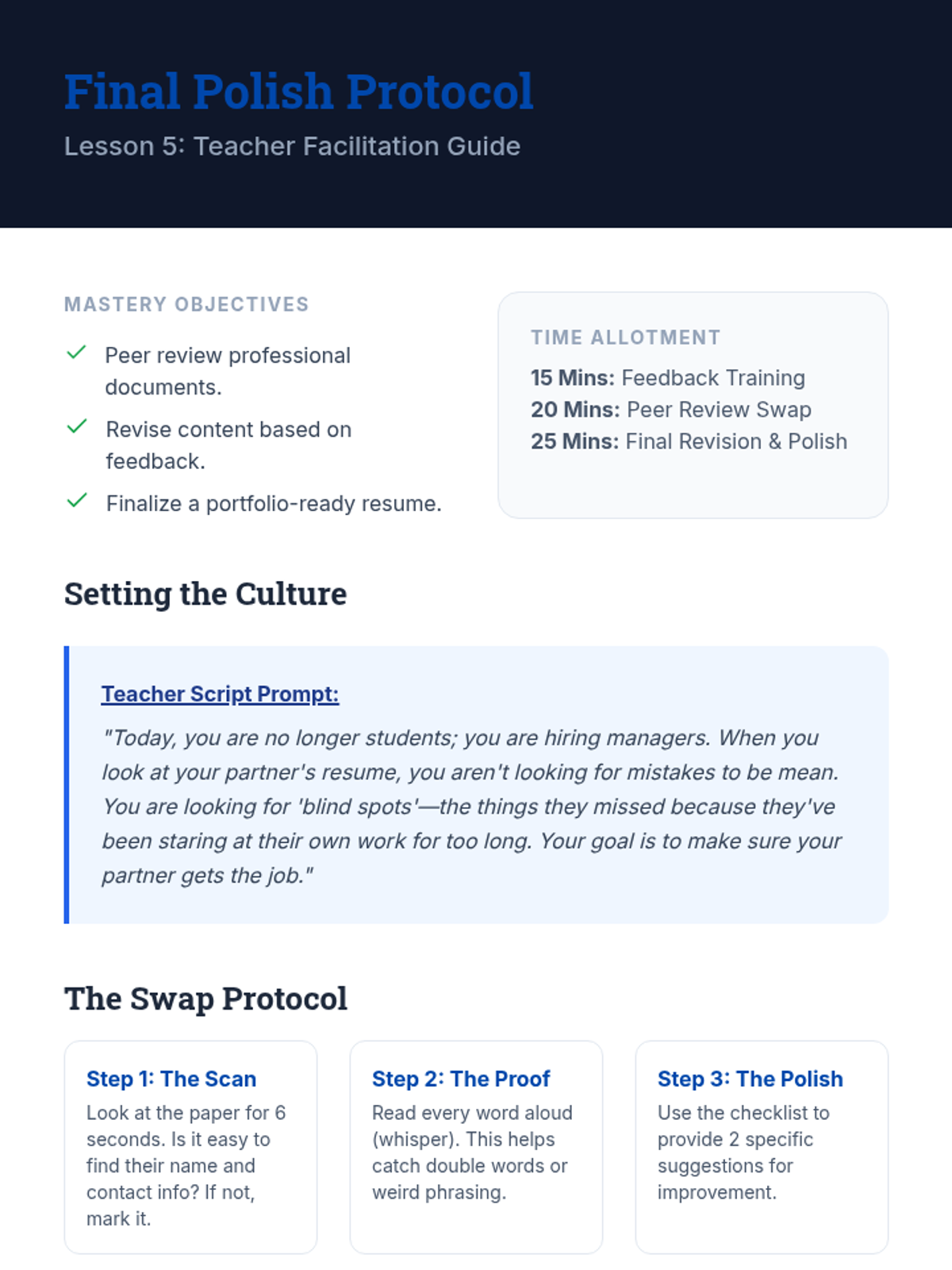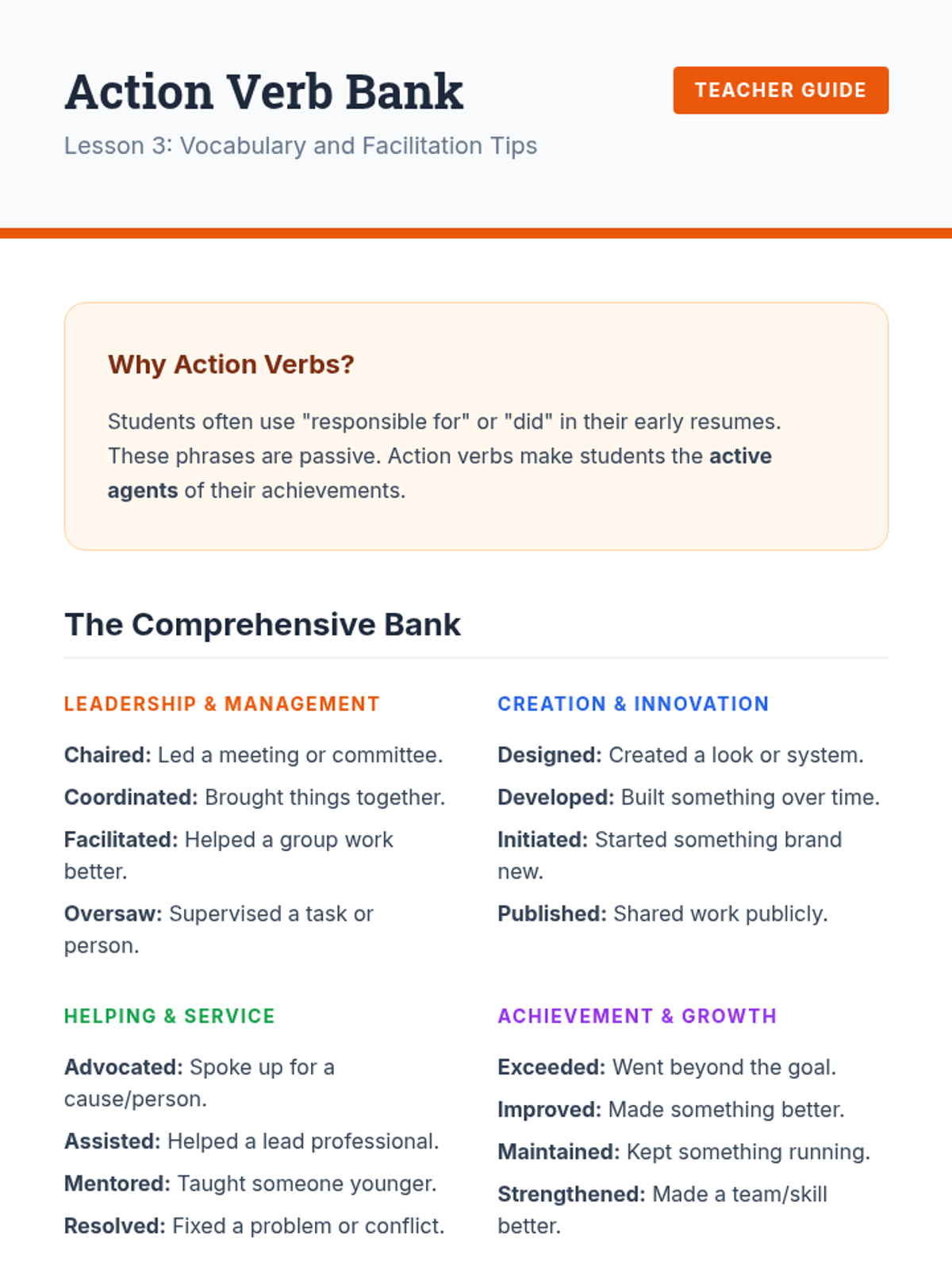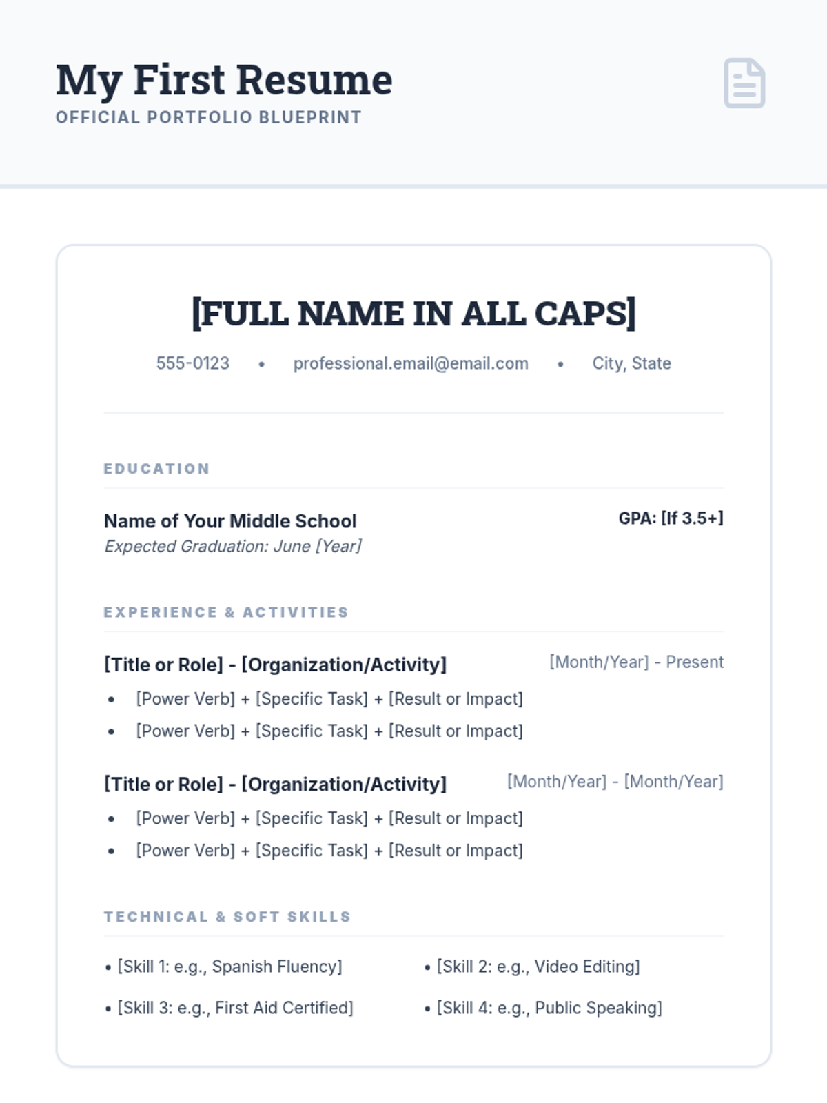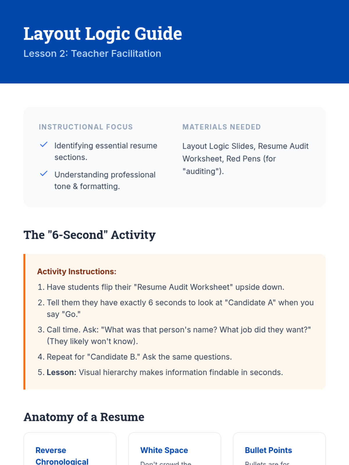 A comprehensive sequence for 6th-grade students to translate their daily activities into professional documentation. Students learn to identify transferable skills, structure a resume, use power verbs, manage their digital footprint, and produce a polished draft resume.