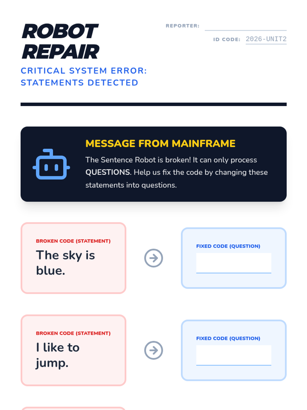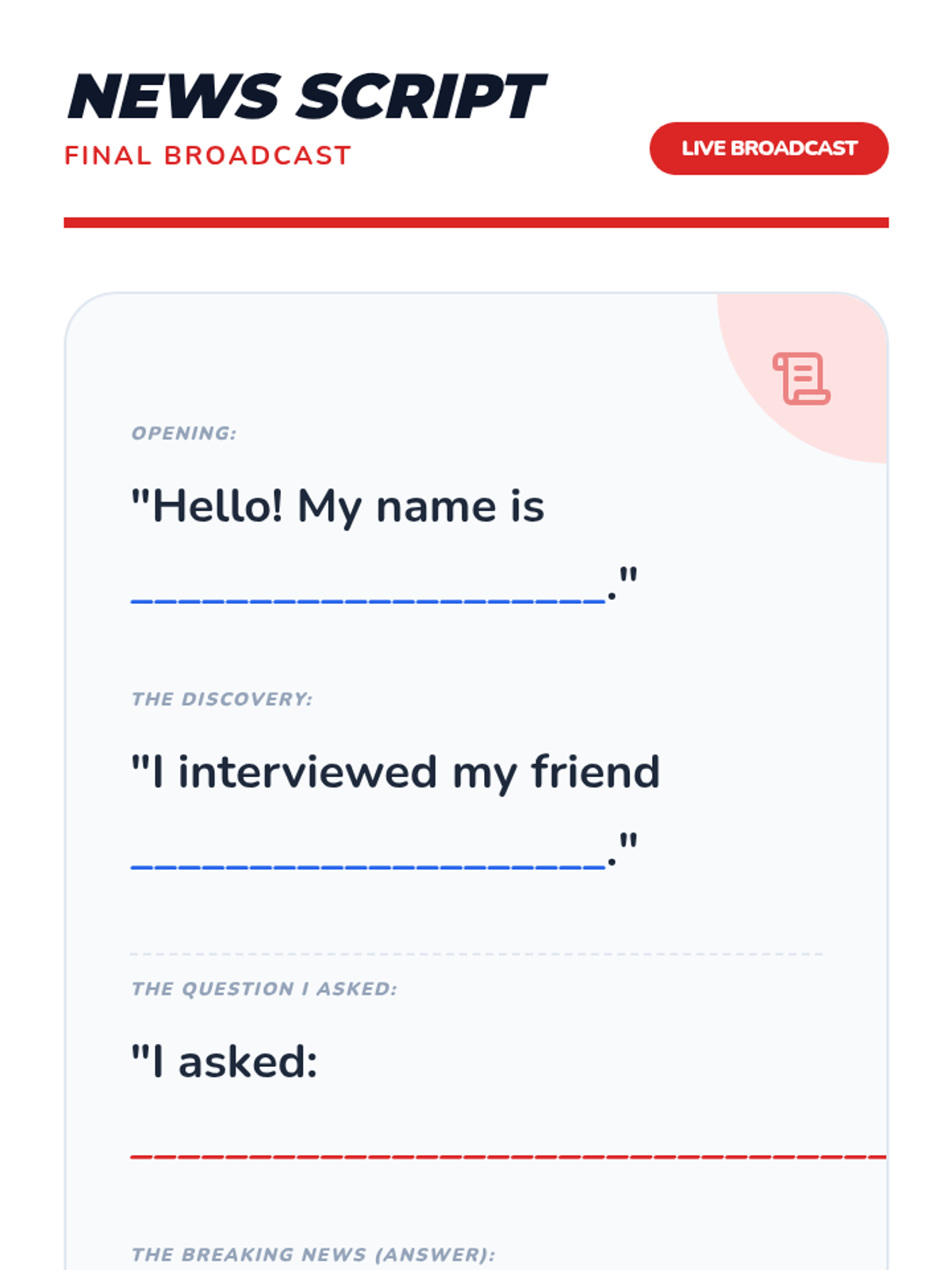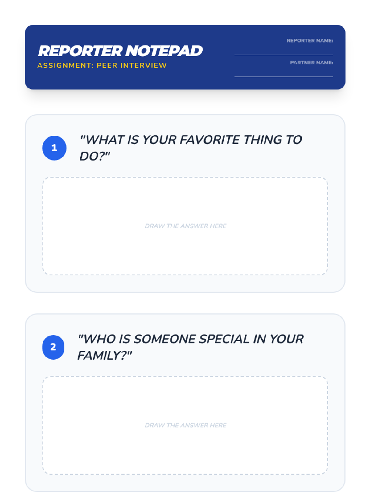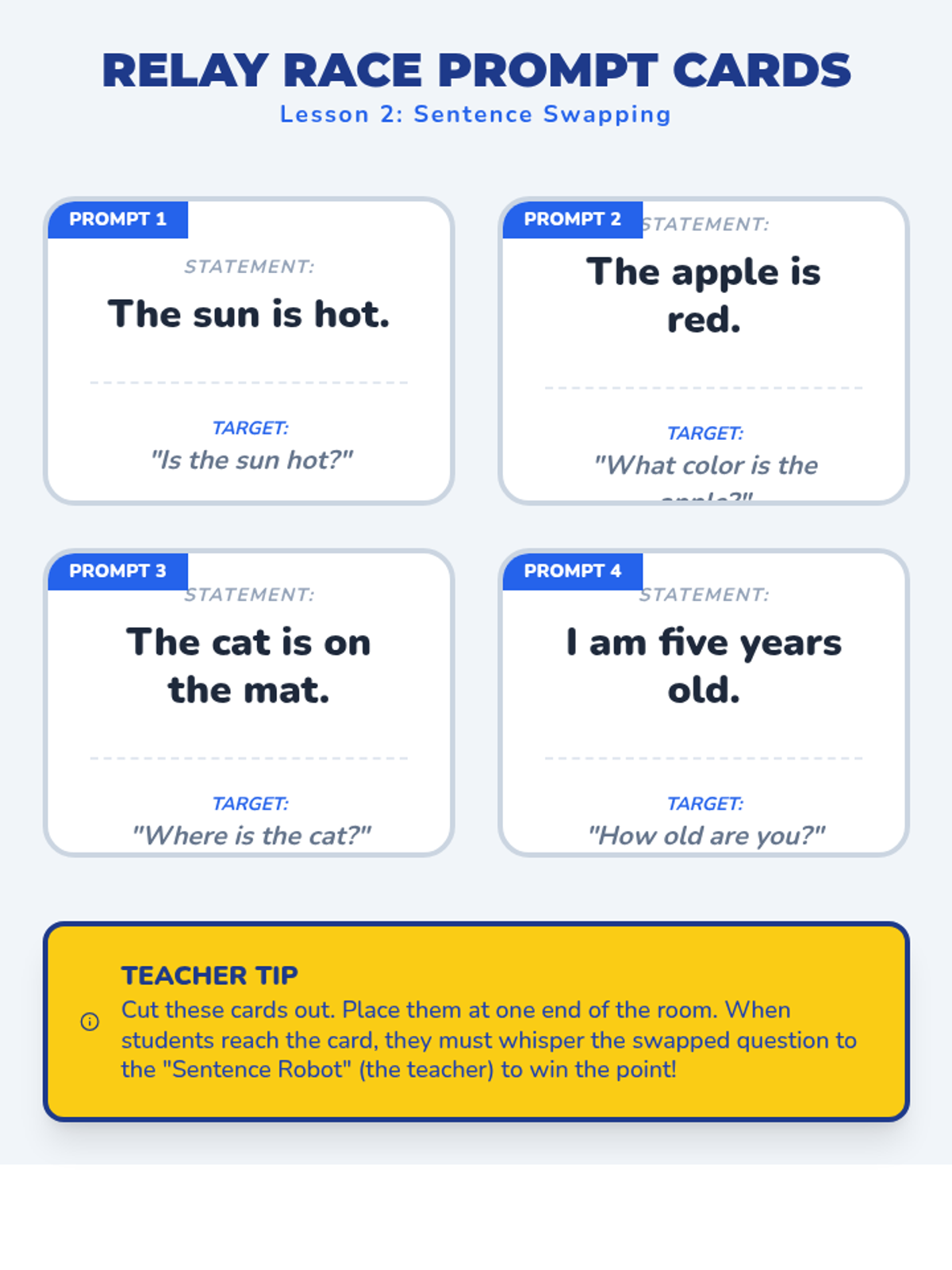 A Kindergarten ELA sequence focused on distinguishing between questions and statements, using question words (Who, What, Where, When, Why), and conducting peer interviews to build social-emotional and language skills.