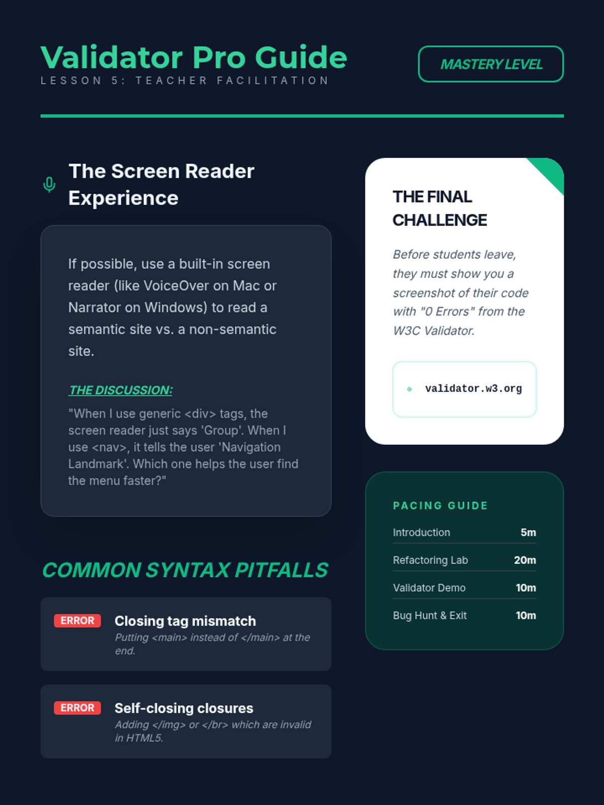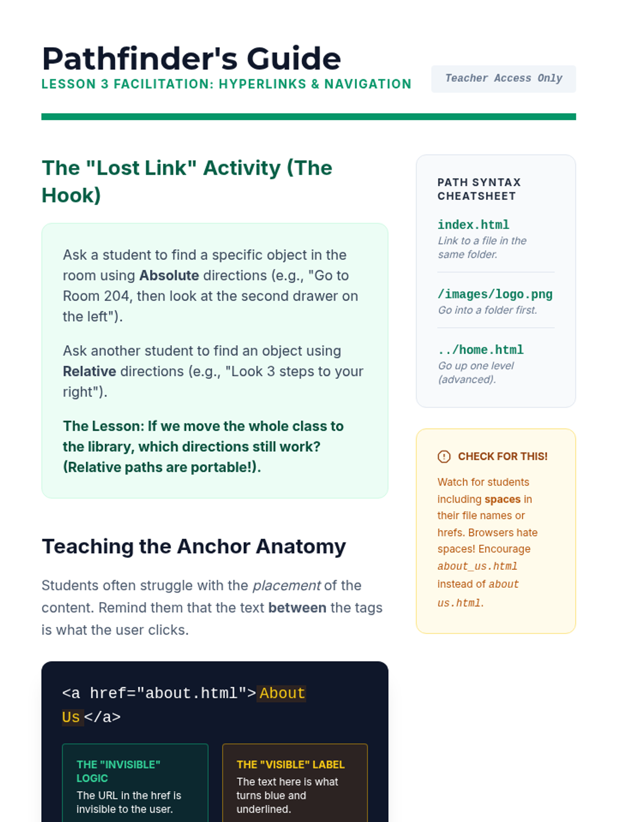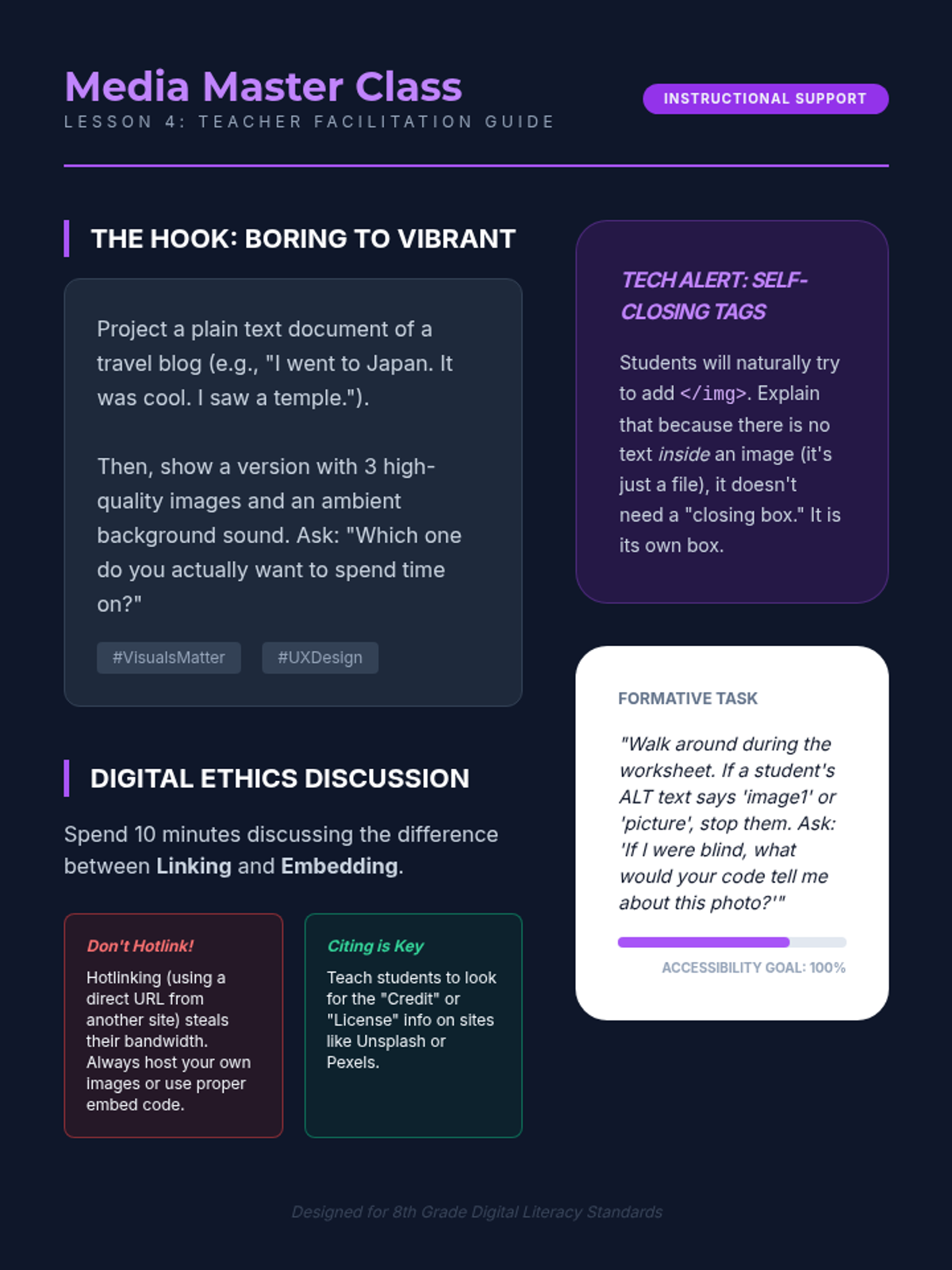 This sequence introduces 8th-grade students to HTML, focusing on semantic structure, data organization with lists and tables, navigation via hyperlinks, and embedding multimedia content. It culminates in a mastery-focused lesson on modern semantic tags and code validation.