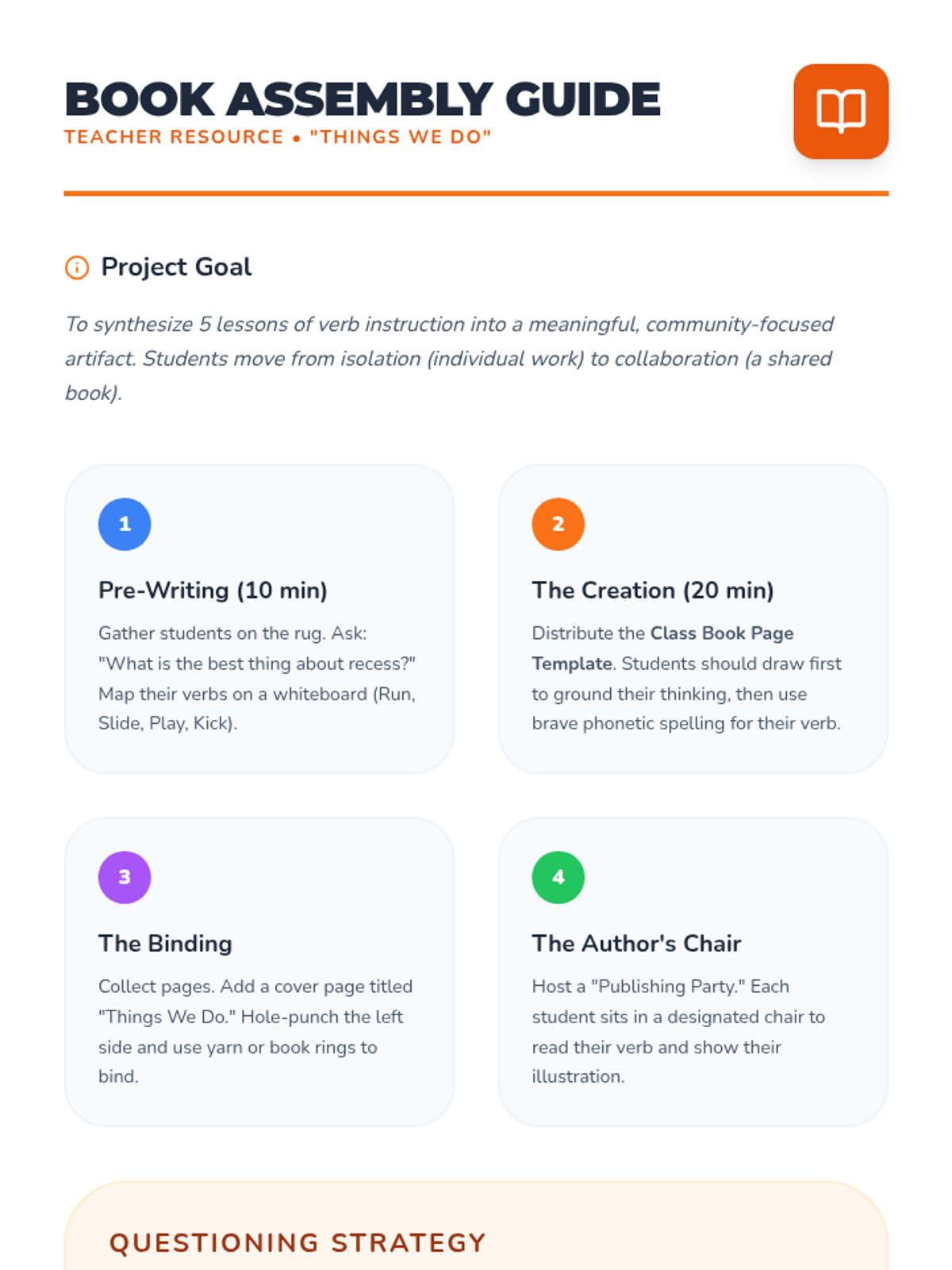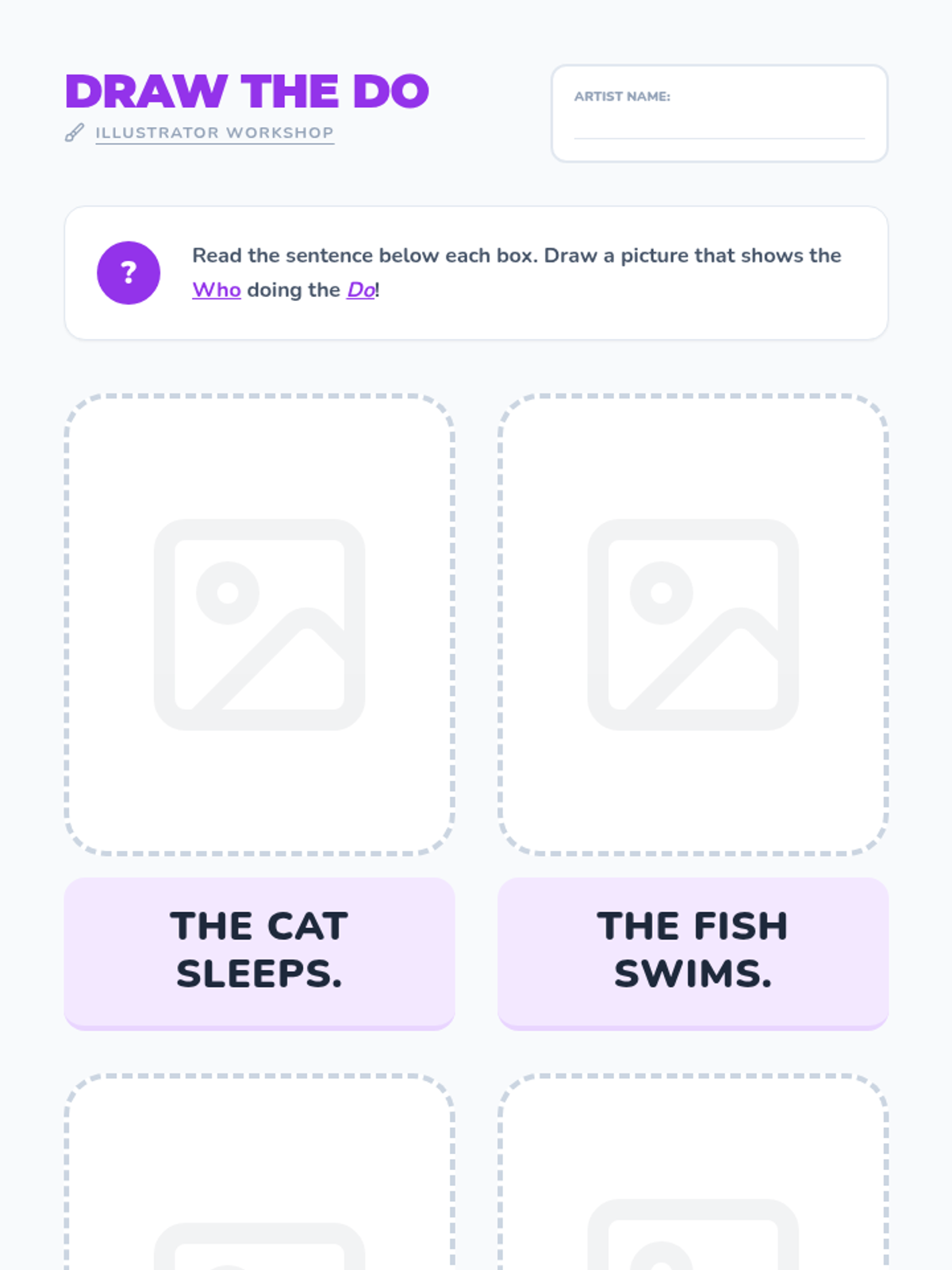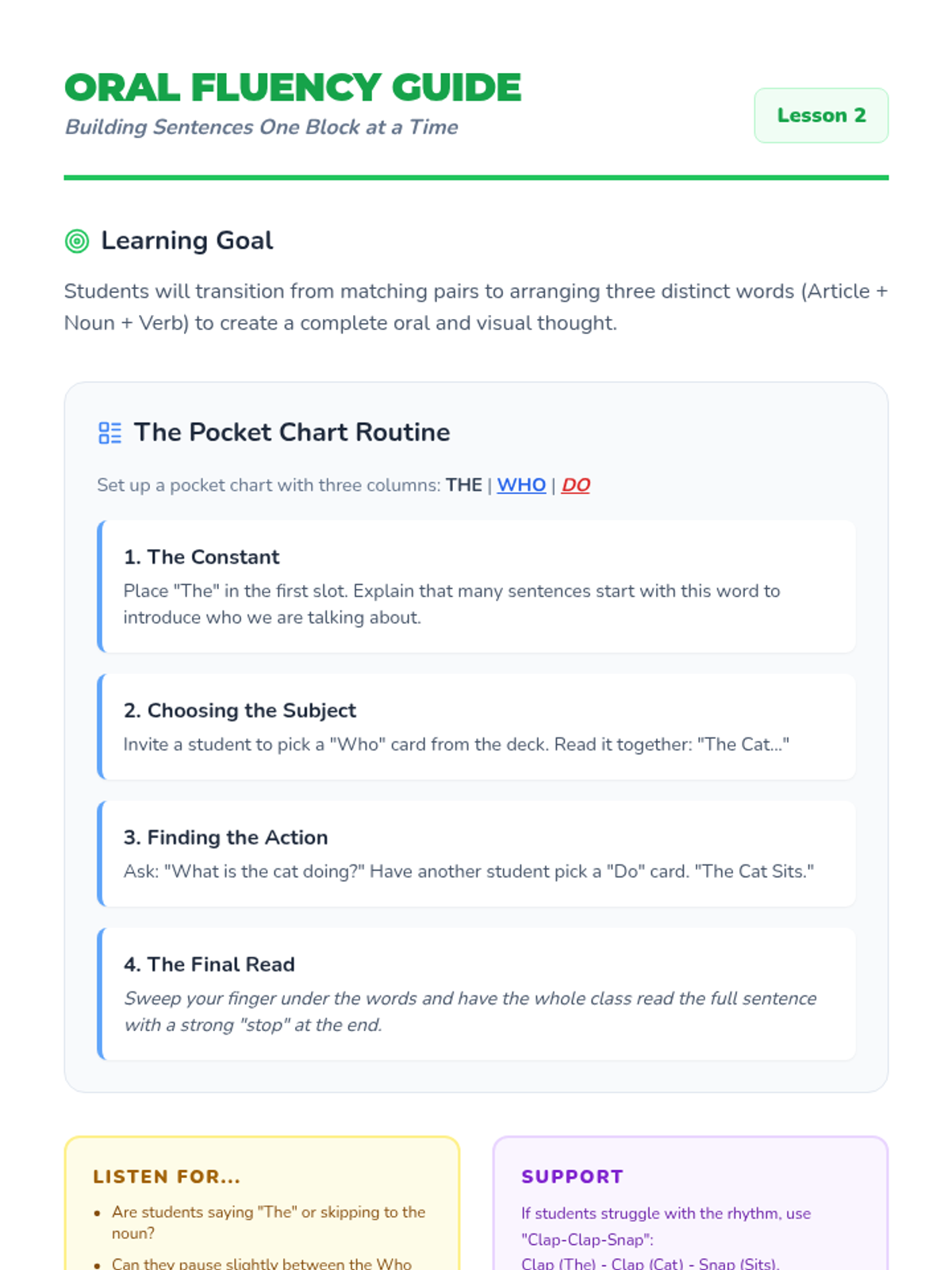 A Kindergarten ELA sequence focused on identifying and using action verbs to build simple sentences. Students progress from oral matching to illustrating and writing their own action-oriented sentences.