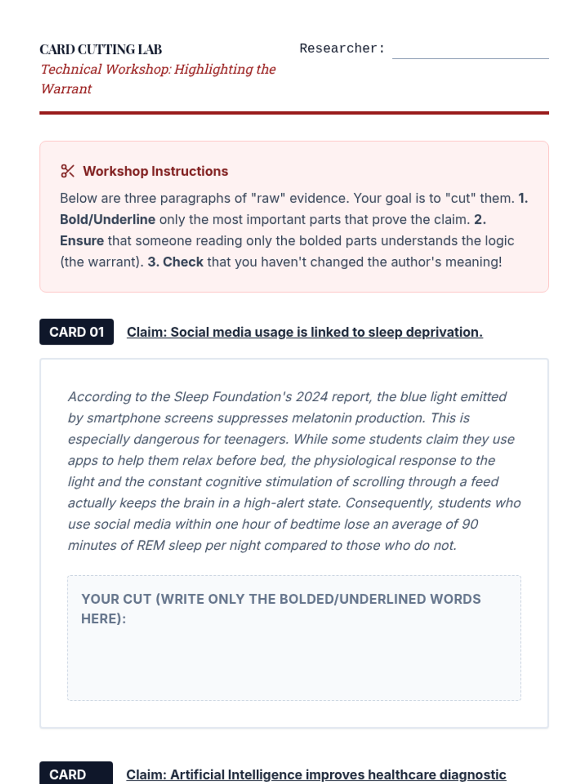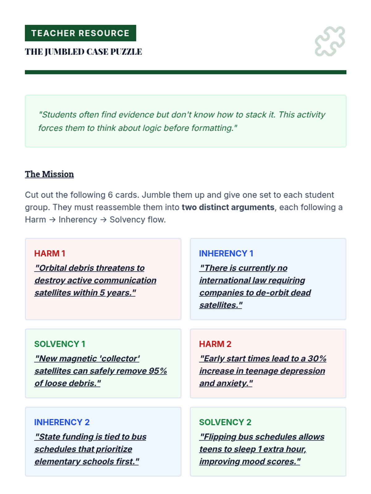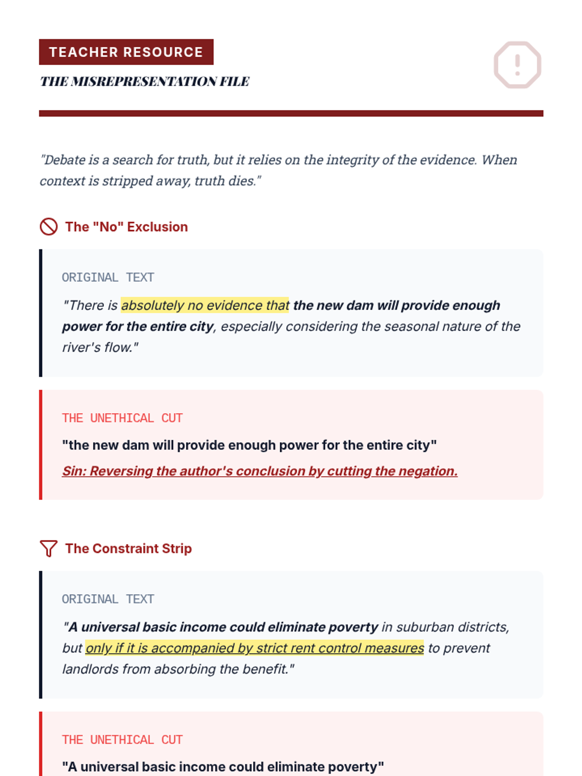 A comprehensive sequence teaching 8th-grade students the technical and ethical skills required to construct professional debate briefs, from card cutting to logical categorization.