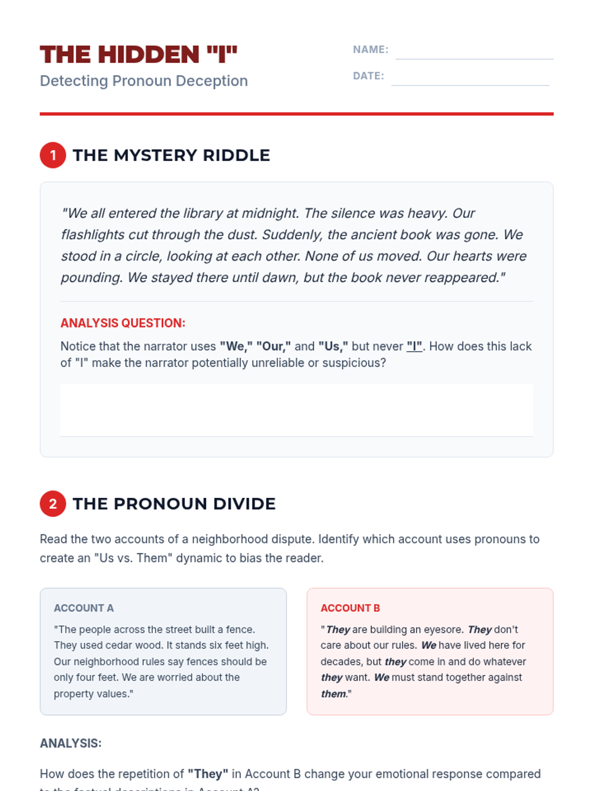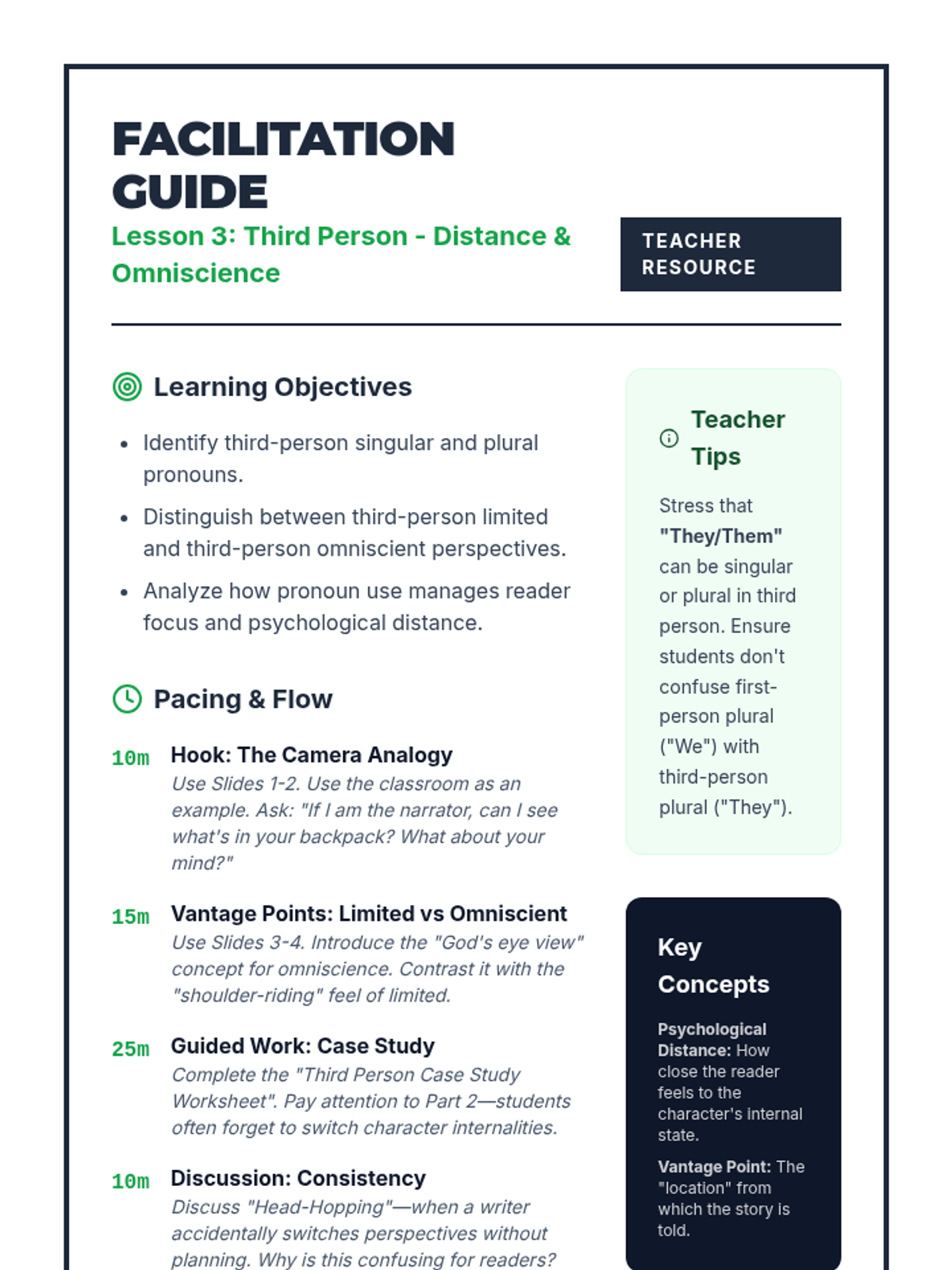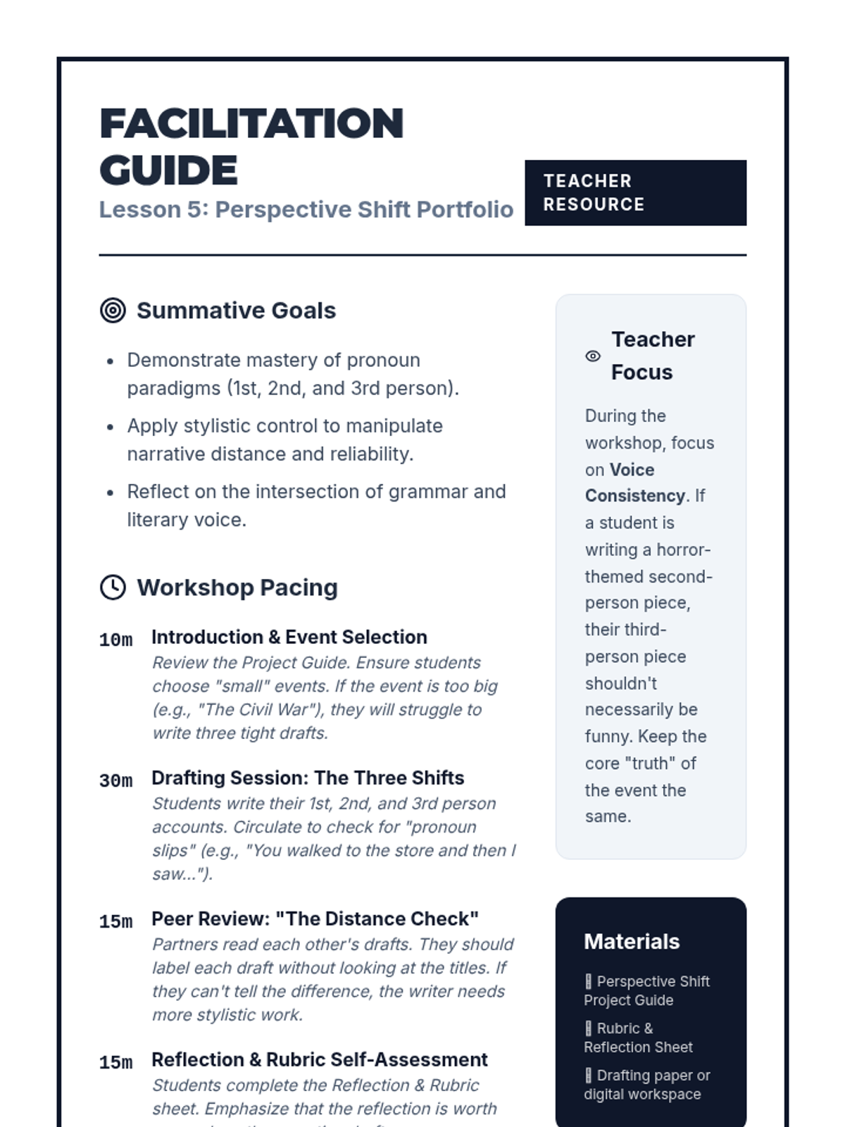 This sequence explores how pronoun choices (1st, 2nd, and 3rd person) create narrative perspective, psychological distance, and reliability in writing. Students move from grammatical identification to literary analysis and creative application, culminating in a portfolio of perspective shifts.