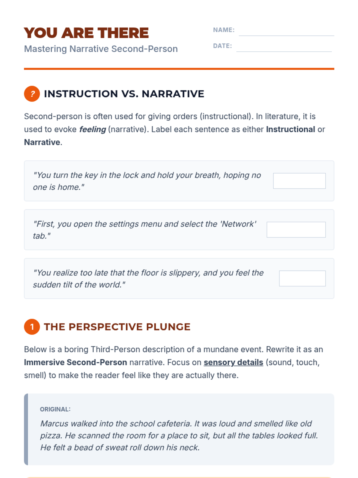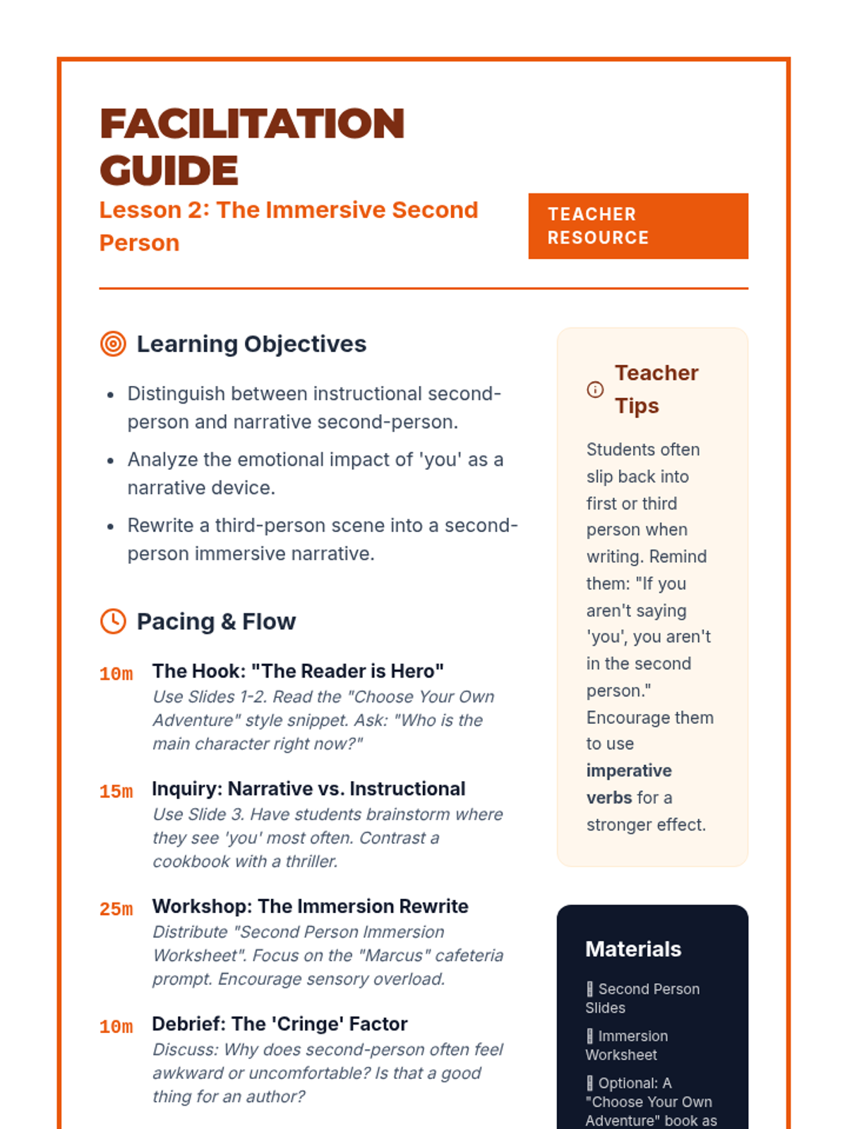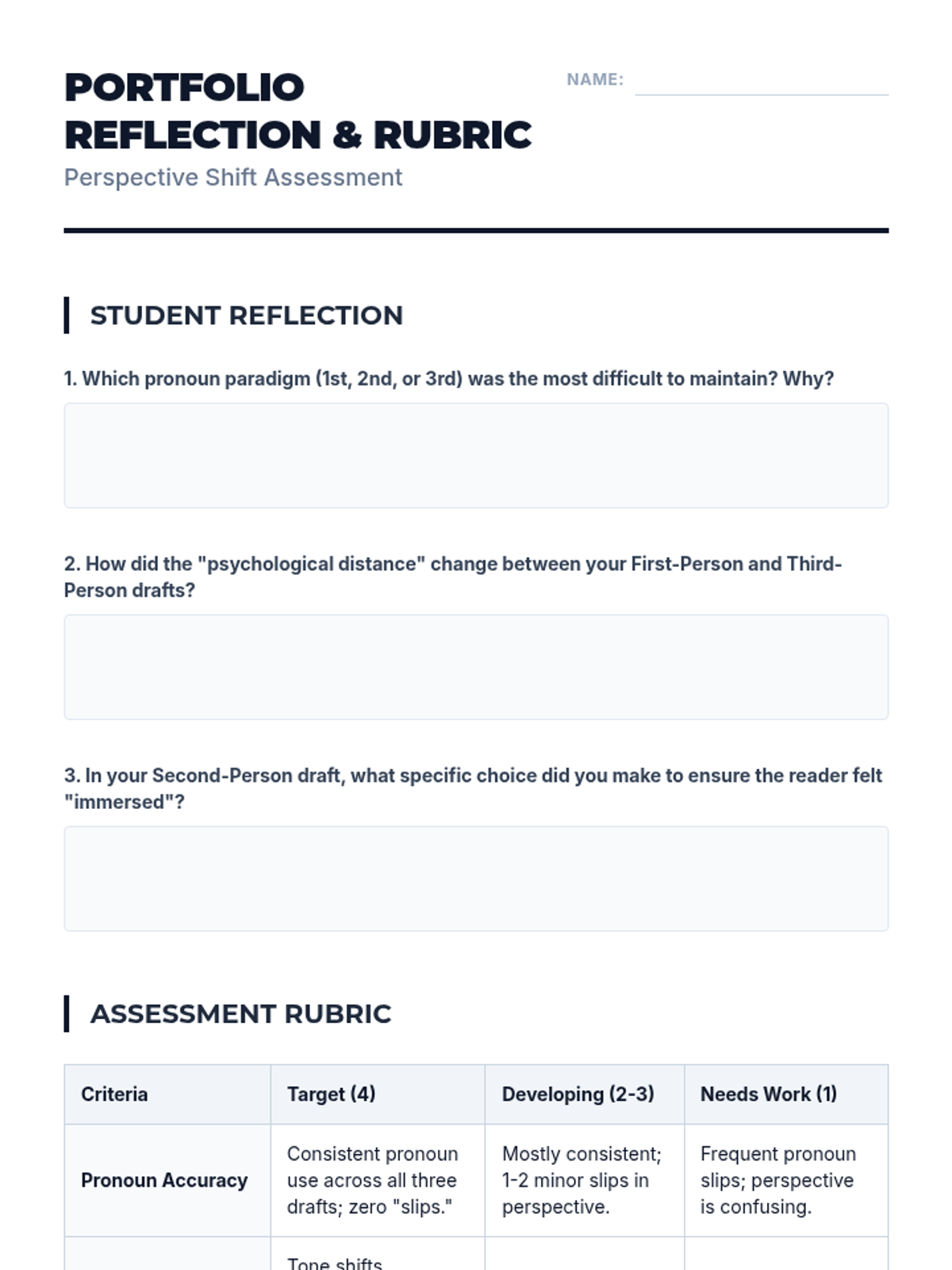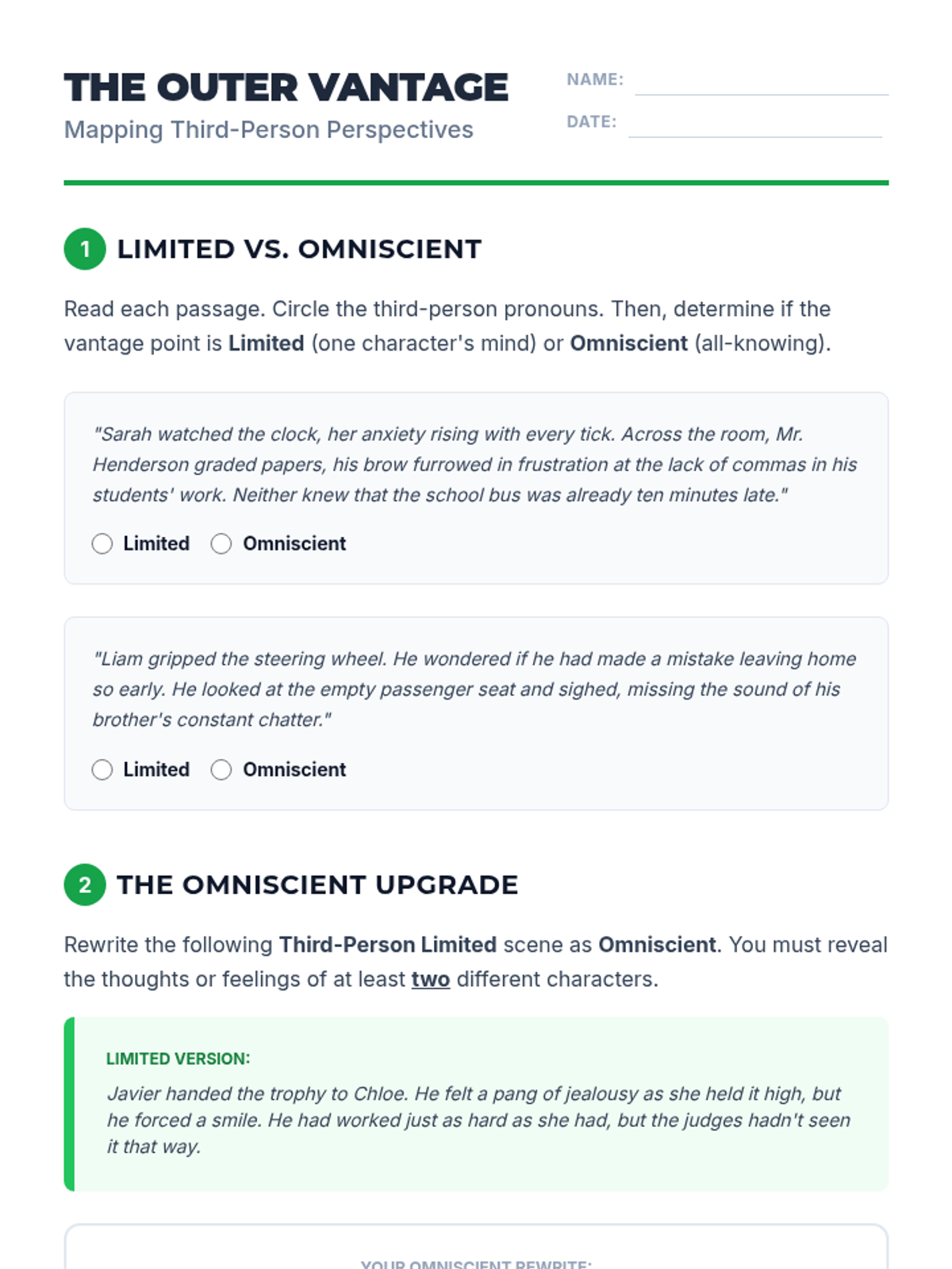 This sequence explores how pronoun choices (1st, 2nd, and 3rd person) create narrative perspective, psychological distance, and reliability in writing. Students move from grammatical identification to literary analysis and creative application, culminating in a portfolio of perspective shifts.