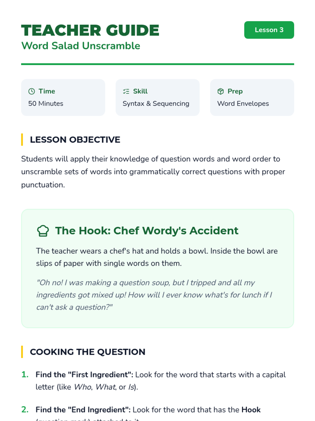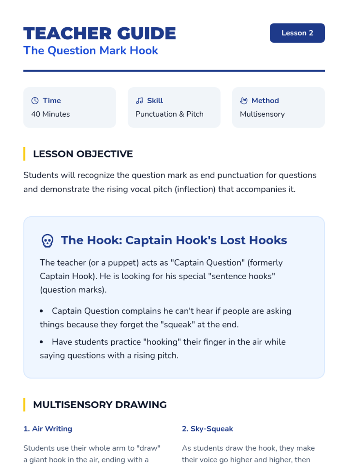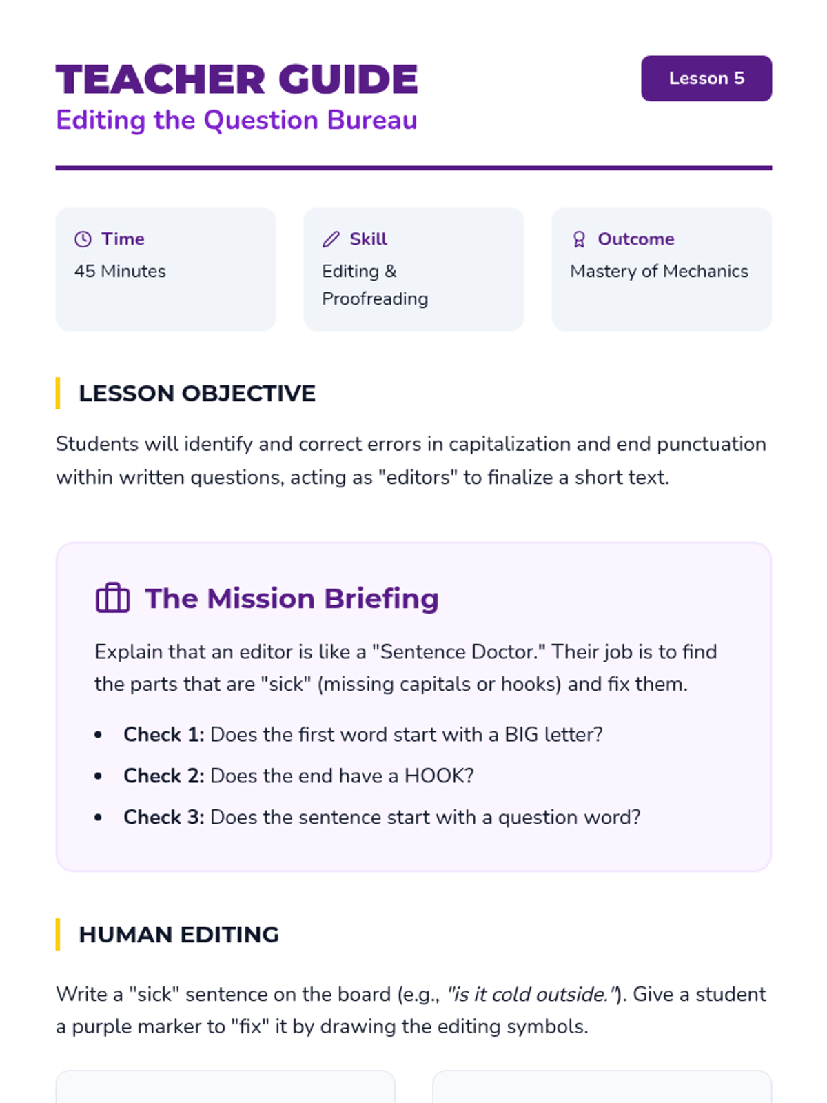 This sequence guides 1st-grade students through the transition from oral questioning to written expression. It covers syntax (the 'subject-verb flip'), punctuation (the question mark), sentence structure (unscrambling), and creative writing using picture prompts, culminating in editing skills.