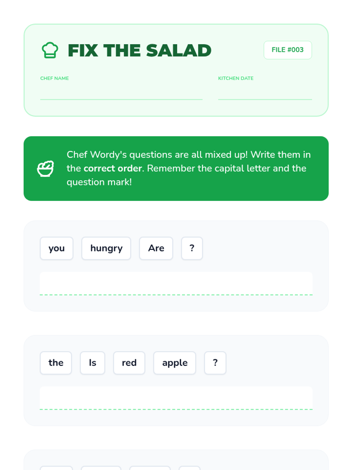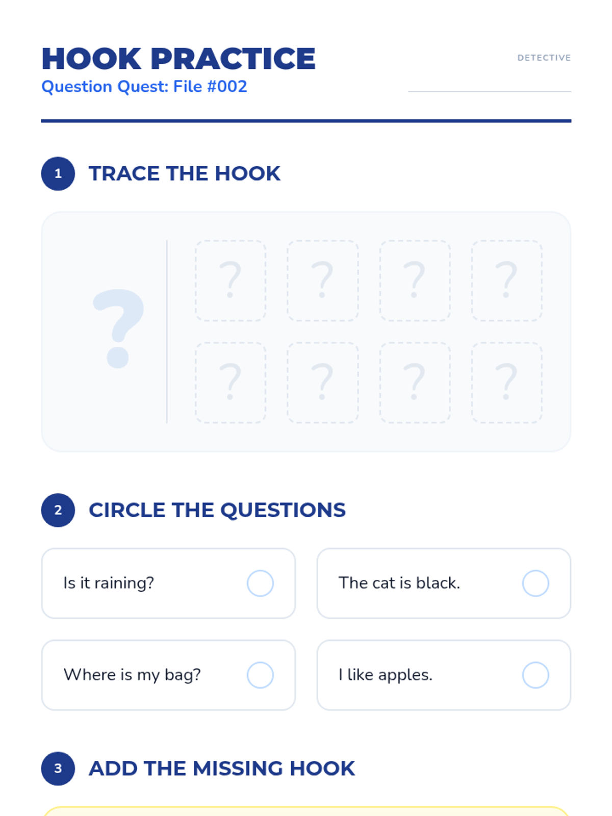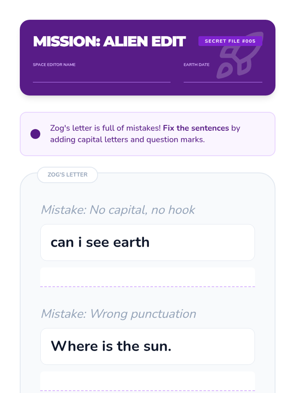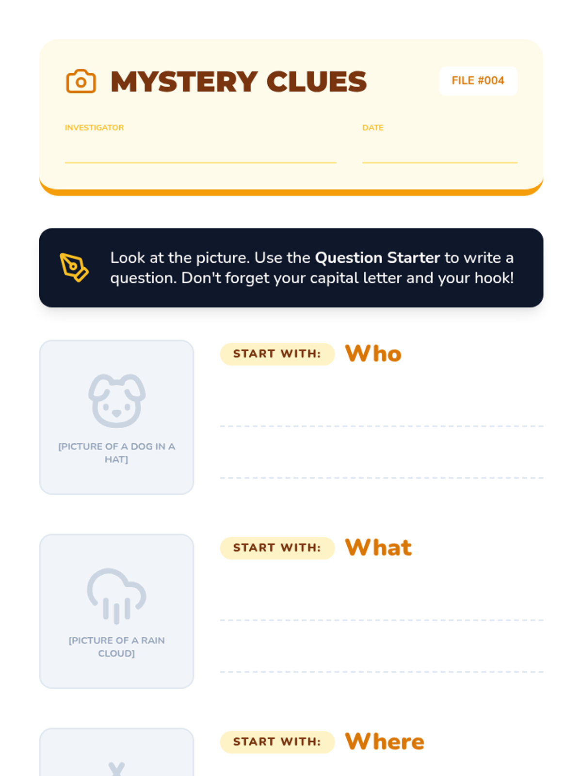 This sequence guides 1st-grade students through the transition from oral questioning to written expression. It covers syntax (the 'subject-verb flip'), punctuation (the question mark), sentence structure (unscrambling), and creative writing using picture prompts, culminating in editing skills.