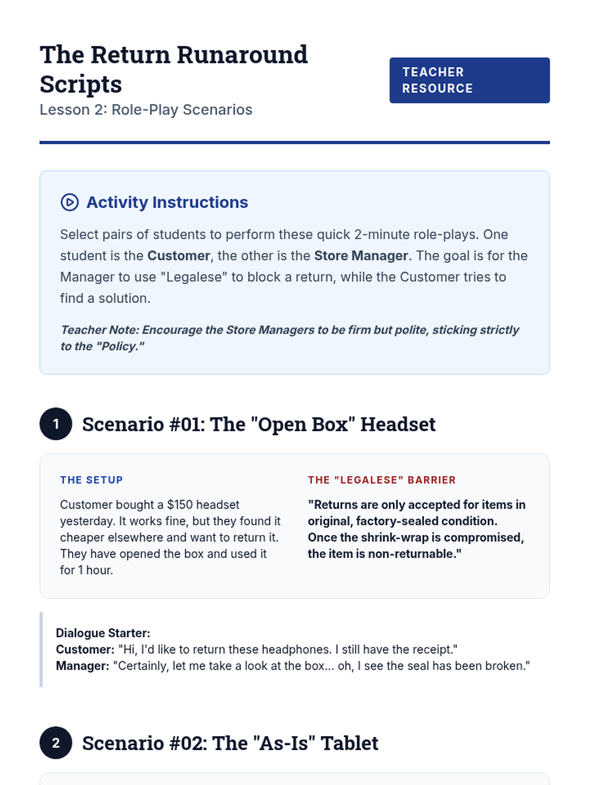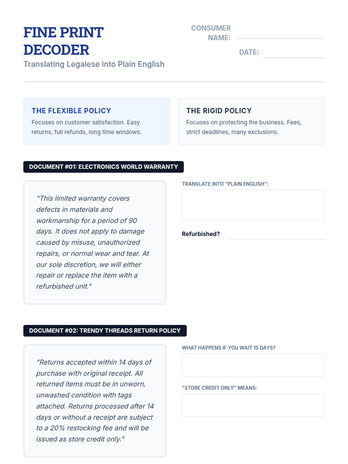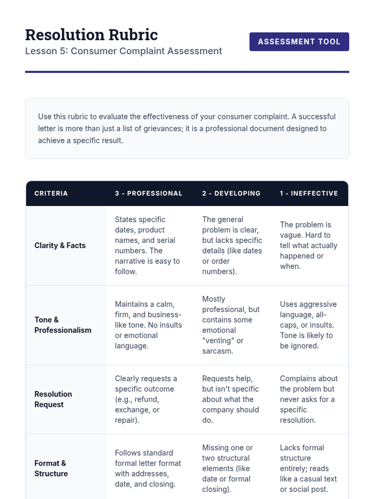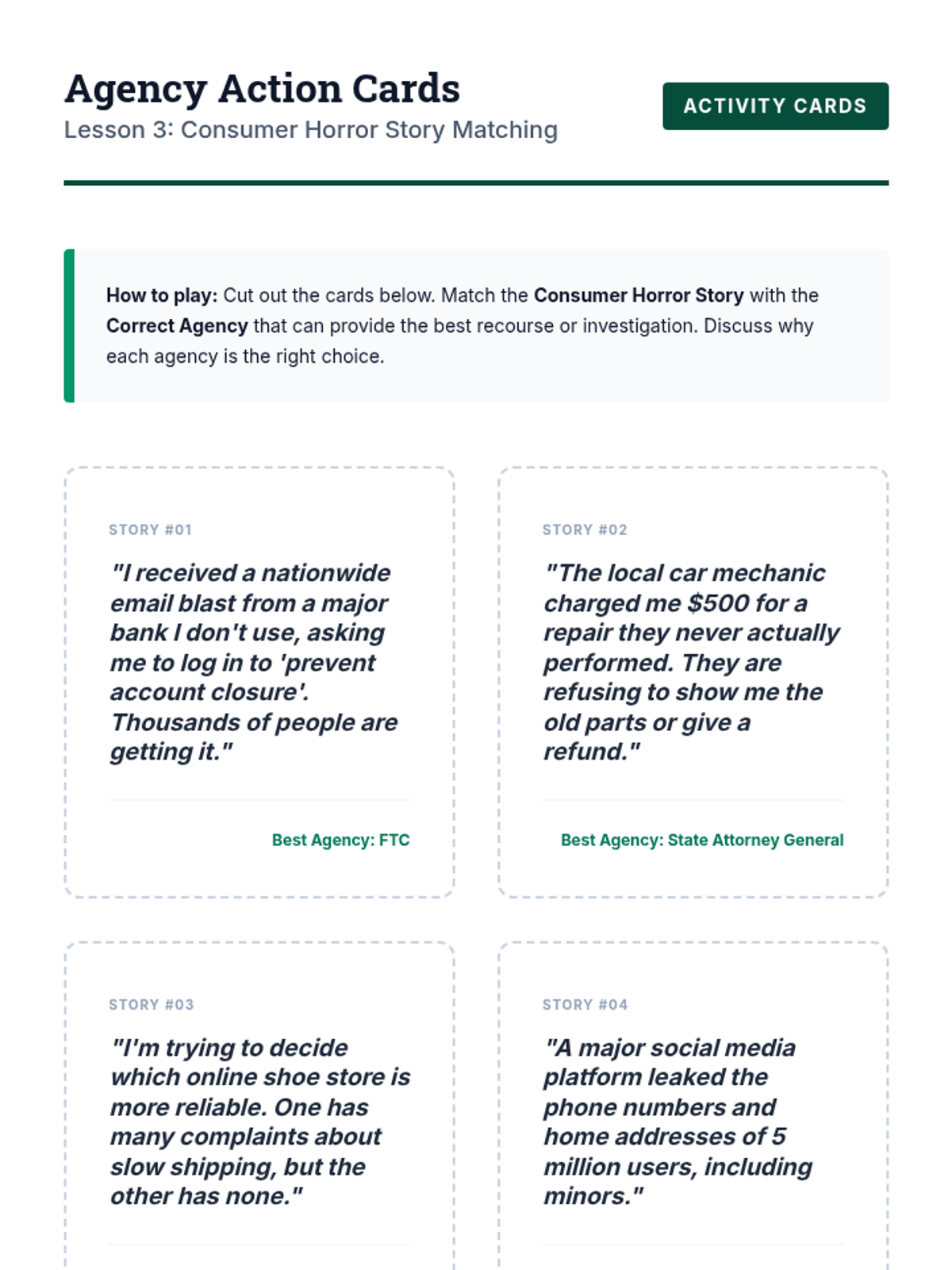 This case-study driven sequence focuses on consumer protection, equipping 8th-grade students with the knowledge to recognize scams and assert their legal rights. Students examine real-world examples of fraud, learn the specific functions of agencies like the FTC and BBB, and practice the soft skills required to resolve consumer disputes.