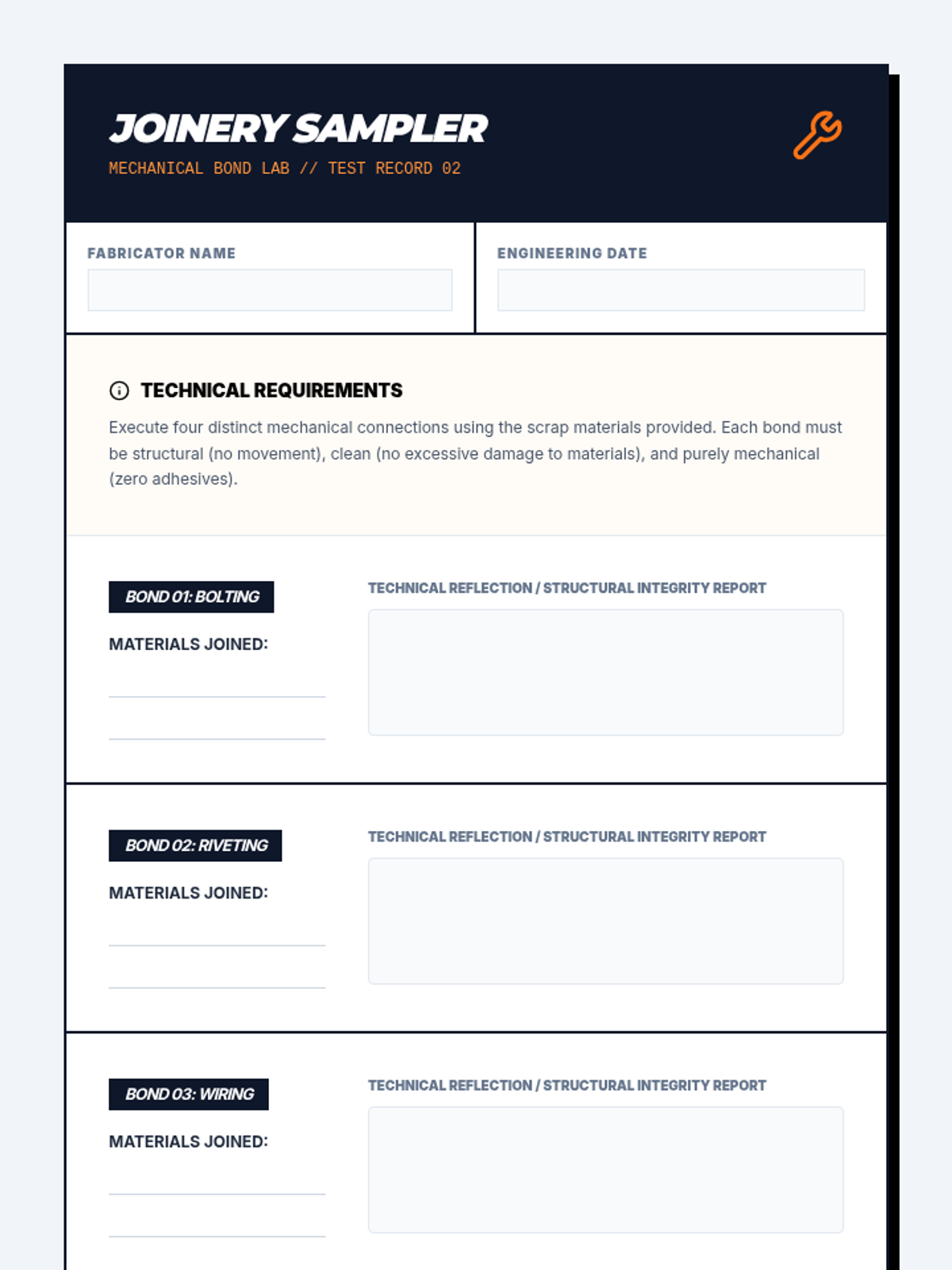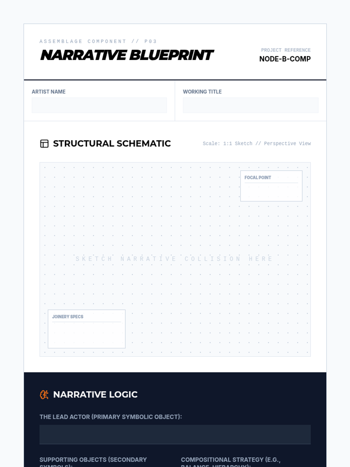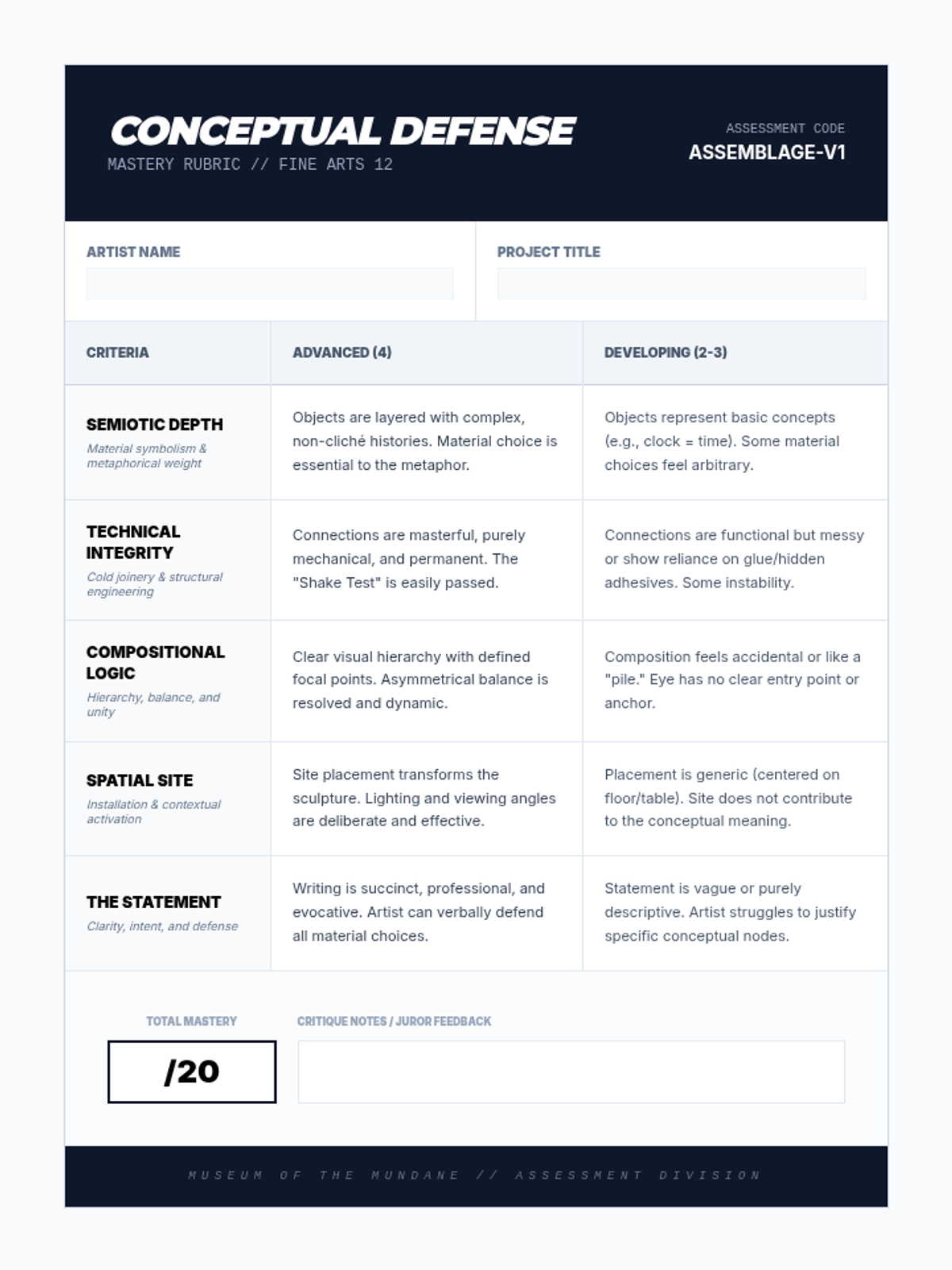 A high-level sculpture sequence for 12th-grade students focusing on the conceptual and technical aspects of contemporary assemblage. Students transition from found objects to semiotic narratives, mastering cold joinery techniques and installation logic.